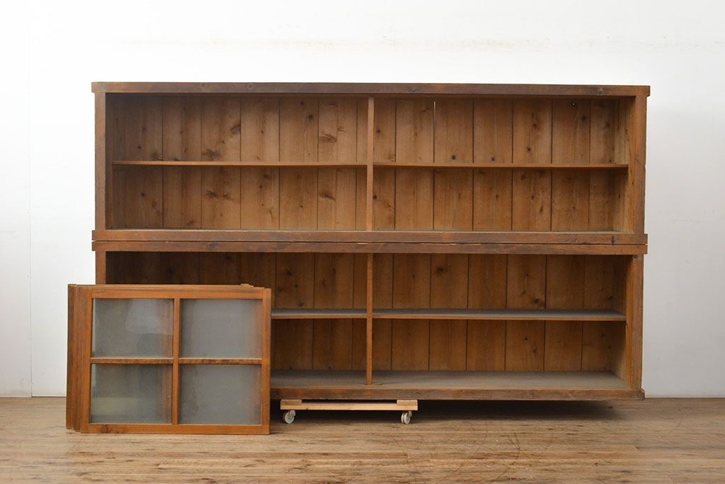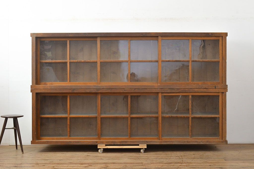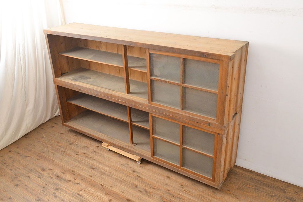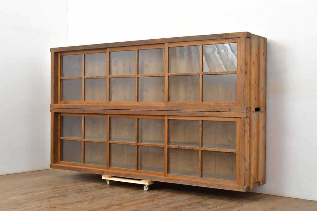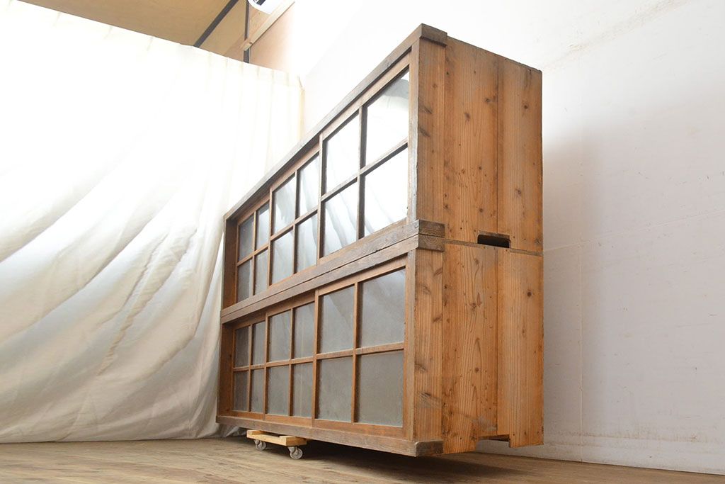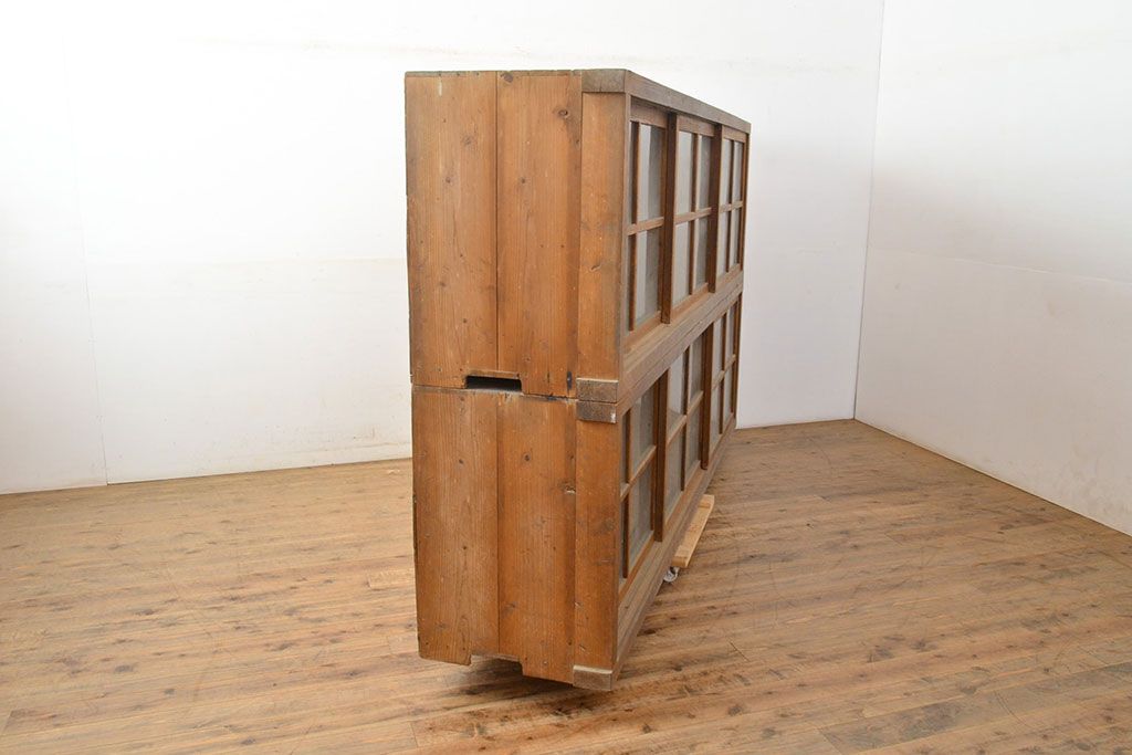 和製アンティーク 杉材 八尺もある特大サイズはレア!格子のガラスがノスタルジックな雰囲気を醸し出す重ね収納棚(ガラス戸棚、キャビネット、店舗什器)(R-051061)です。