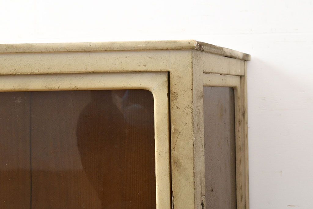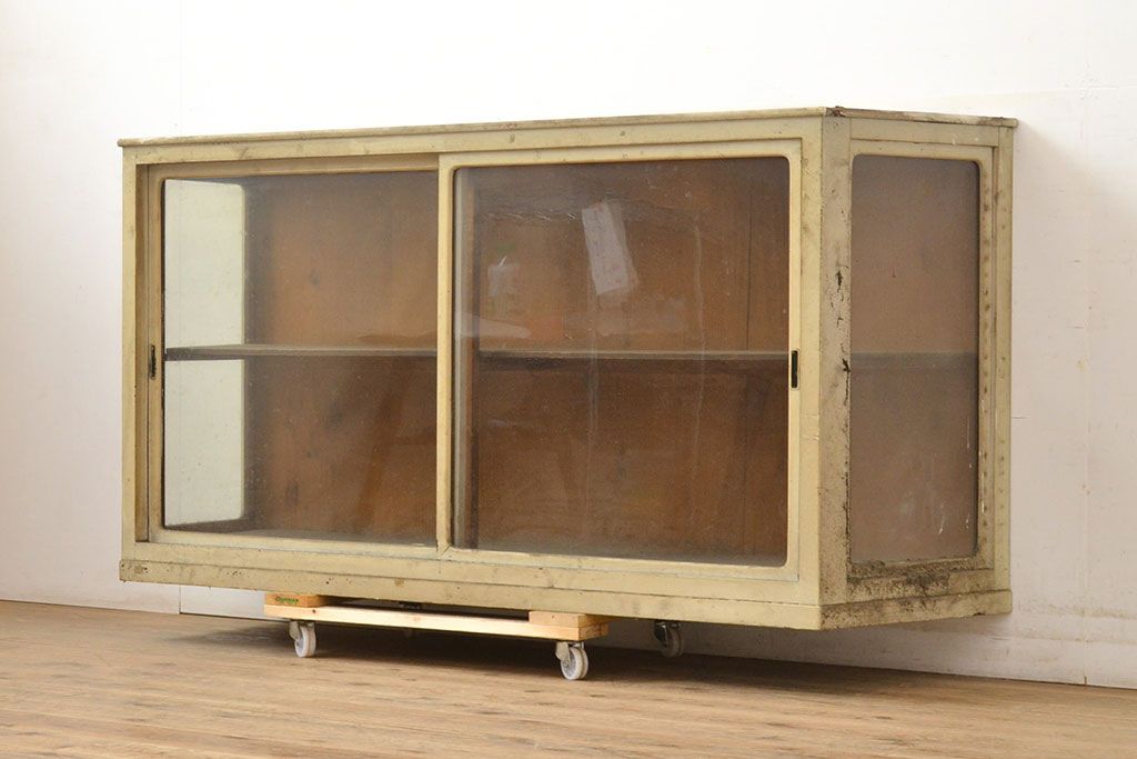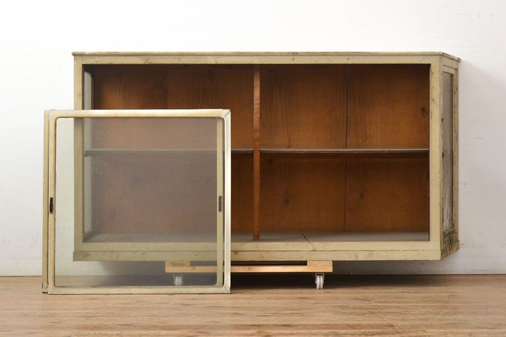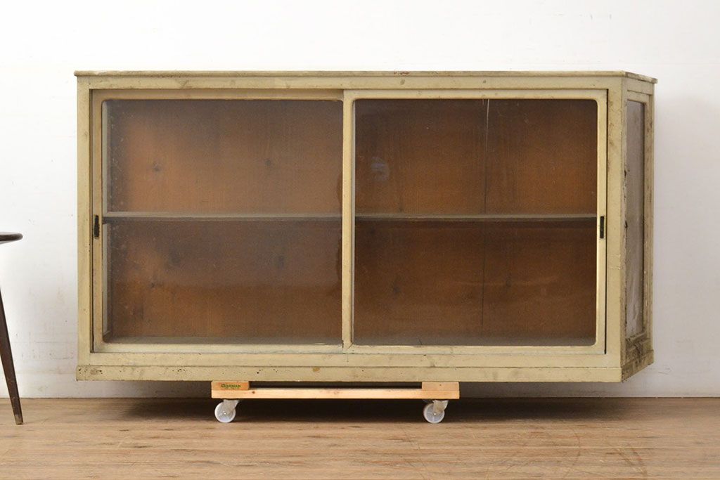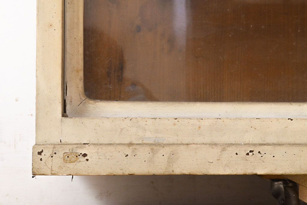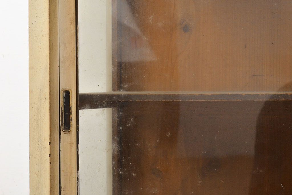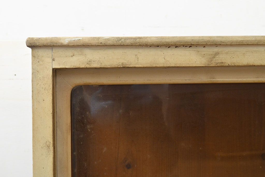 和製アンティーク 台形型がユニーク!シャビーなペイントがお洒落な3面ガラスの戸棚(収納棚、キャビネット)(R-051117)