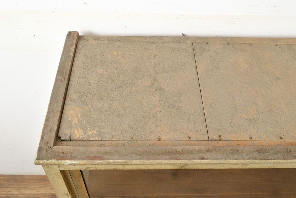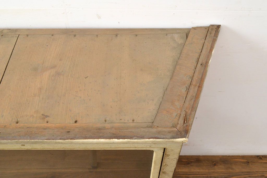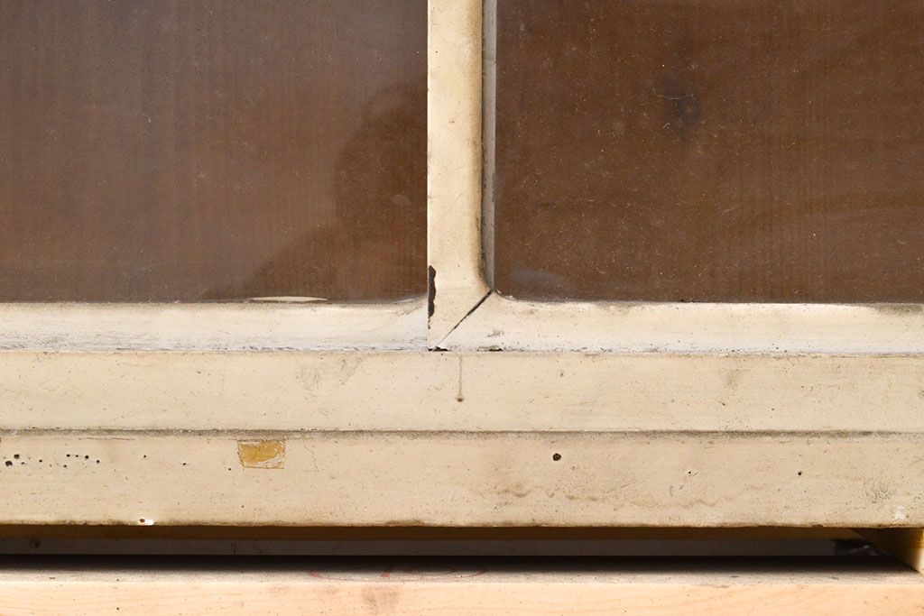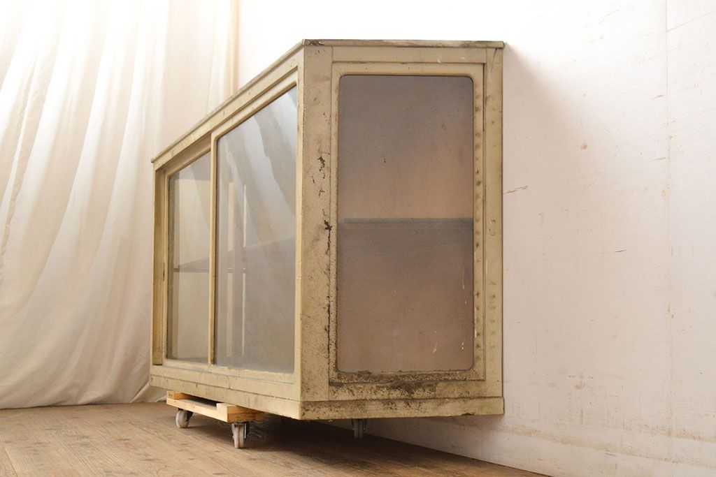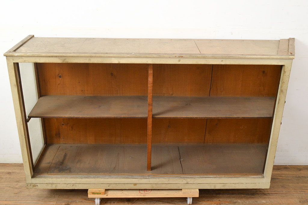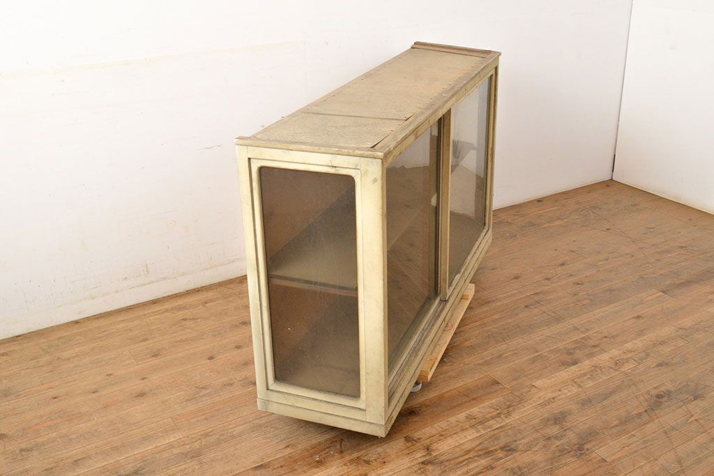 お問い合わせいただければ、優先してアップいたします。和製アンティーク 台形型がユニーク!シャビーなペイントがお洒落な3面ガラスの戸棚(収納棚、キャビネット)(R-051117)です。