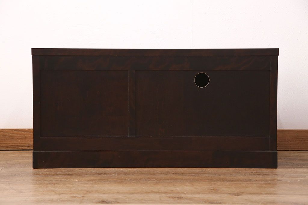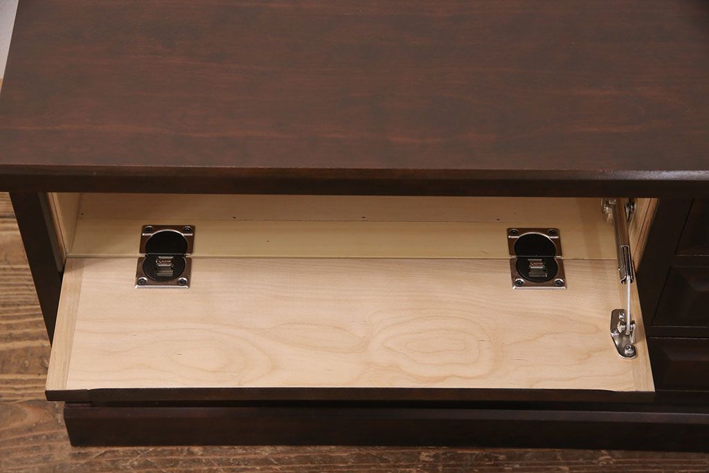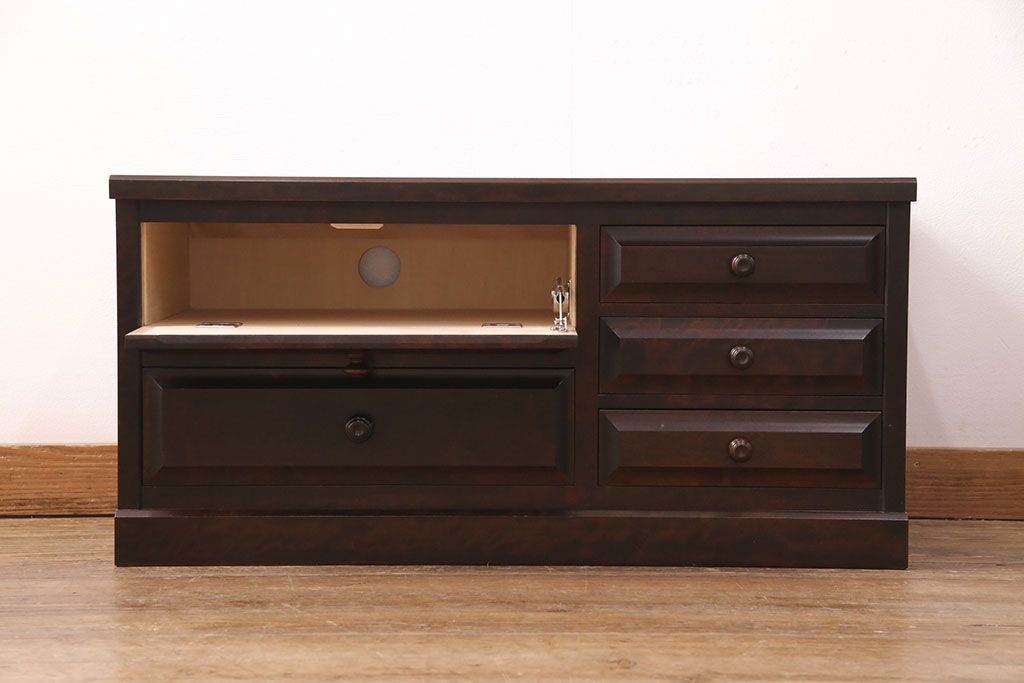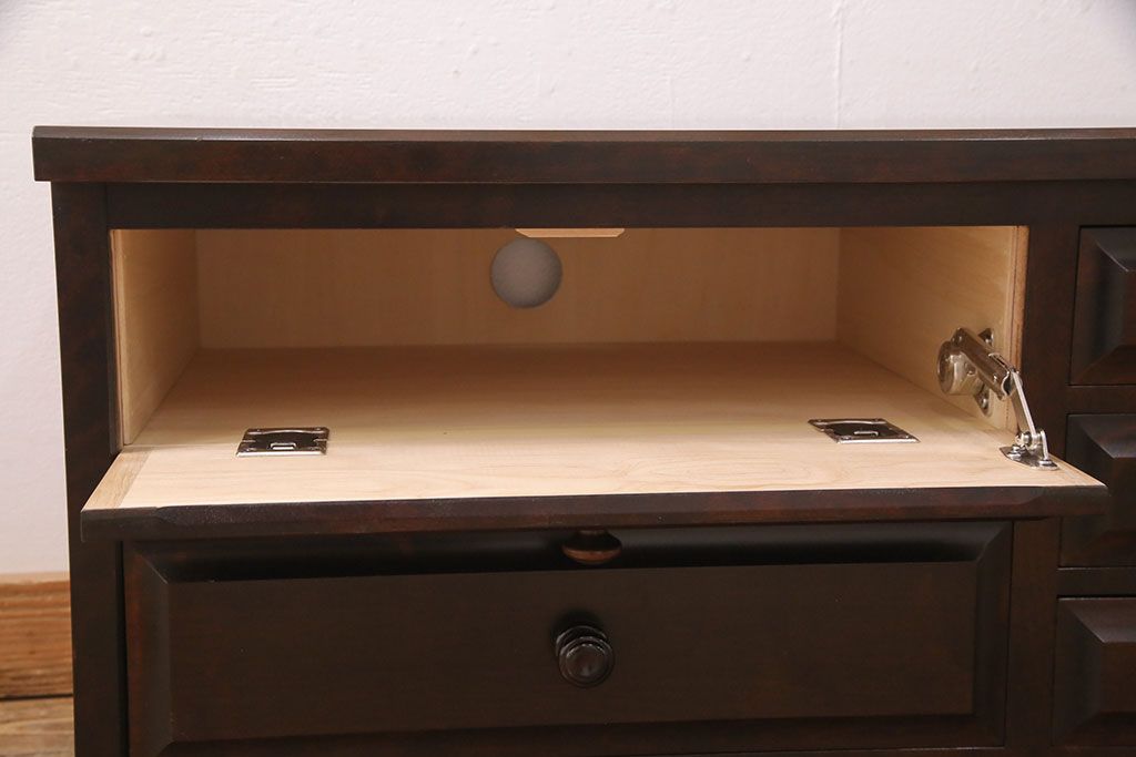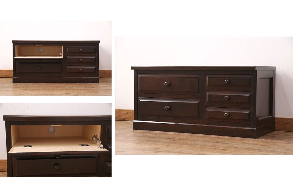 キャビネット・戸棚> テレビ台・ローボード > 北海道民芸家具のローチェストをリペア&カスタム!引き出しをフラップダウン式扉に加工。収納内部の横板・側板取り付け。背面穴開け加工。(テレビ台、ローボード、テレビボード)