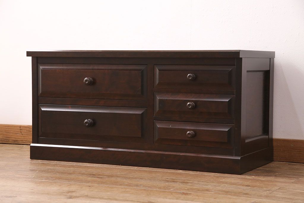 チェスト・引き出し> ローチェスト > 北海道民芸家具のローチェストをリペア&カスタム!引き出しをフラップダウン式扉に加工。収納内部の横板・側板取り付け。背面穴開け加工。(テレビ台、ローボード、テレビボード)