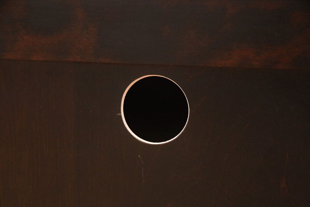 民芸家具 > 北海道民芸家具のローチェストをリペア&カスタム!引き出しをフラップダウン式扉に加工。収納内部の横板・側板取り付け。背面穴開け加工。(テレビ台、ローボード、テレビボード)