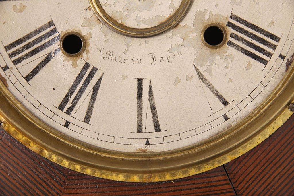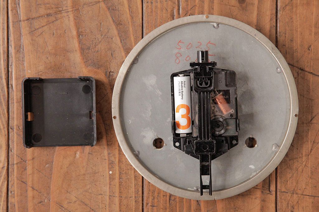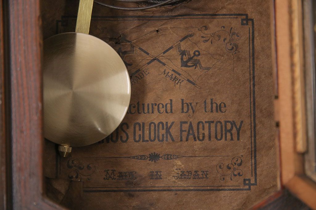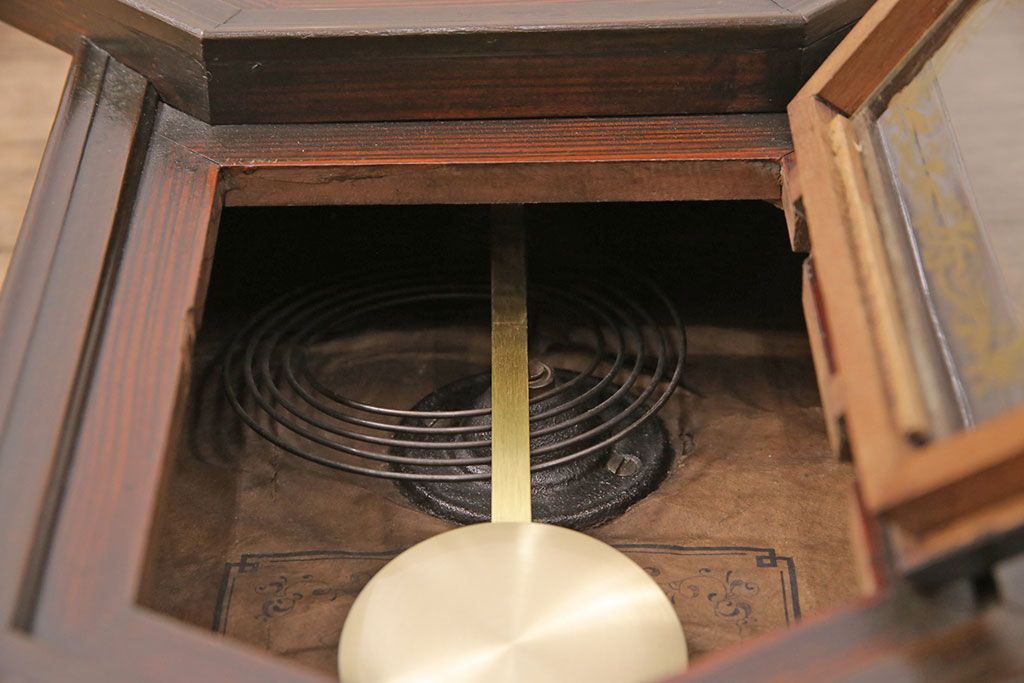 ムーブメントは新品の電池式に交換してあります。乾電池が付属します。振り子は飾りで、動きますが針と連動はしていません。