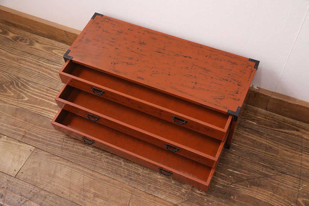 お問い合わせいただければ、優先してアップいたします。中古 美品 工芸家具 曙(あけぼの)塗り 漆の朱色が机上のアクセントになる小引き出し(根来塗り、卓上収納、小物収納)(R-051247)です。