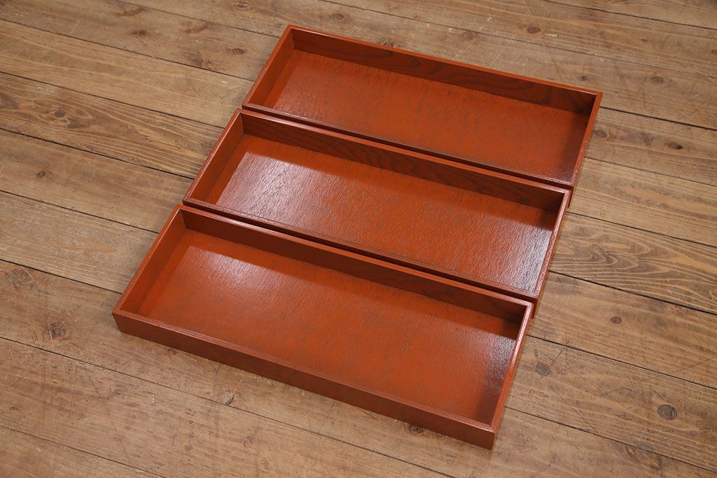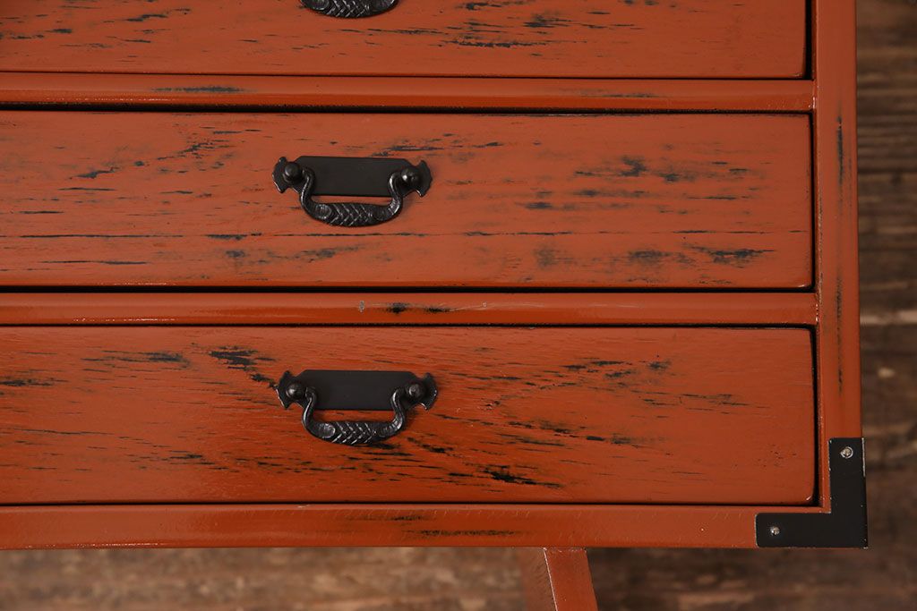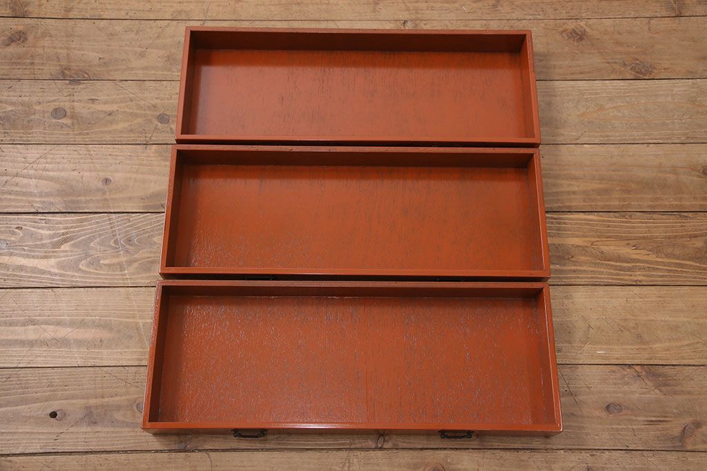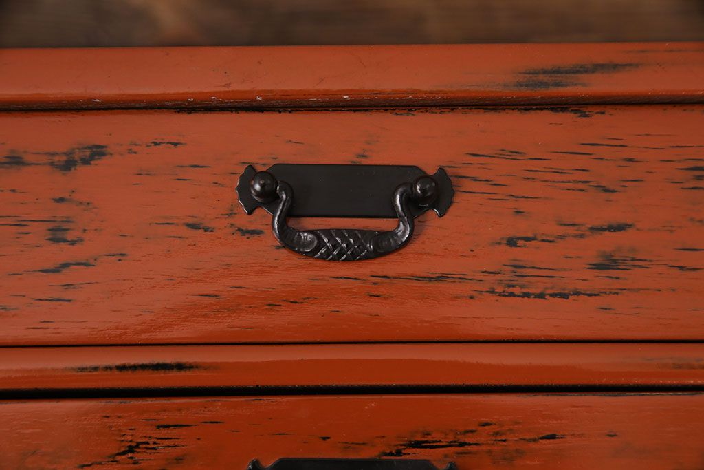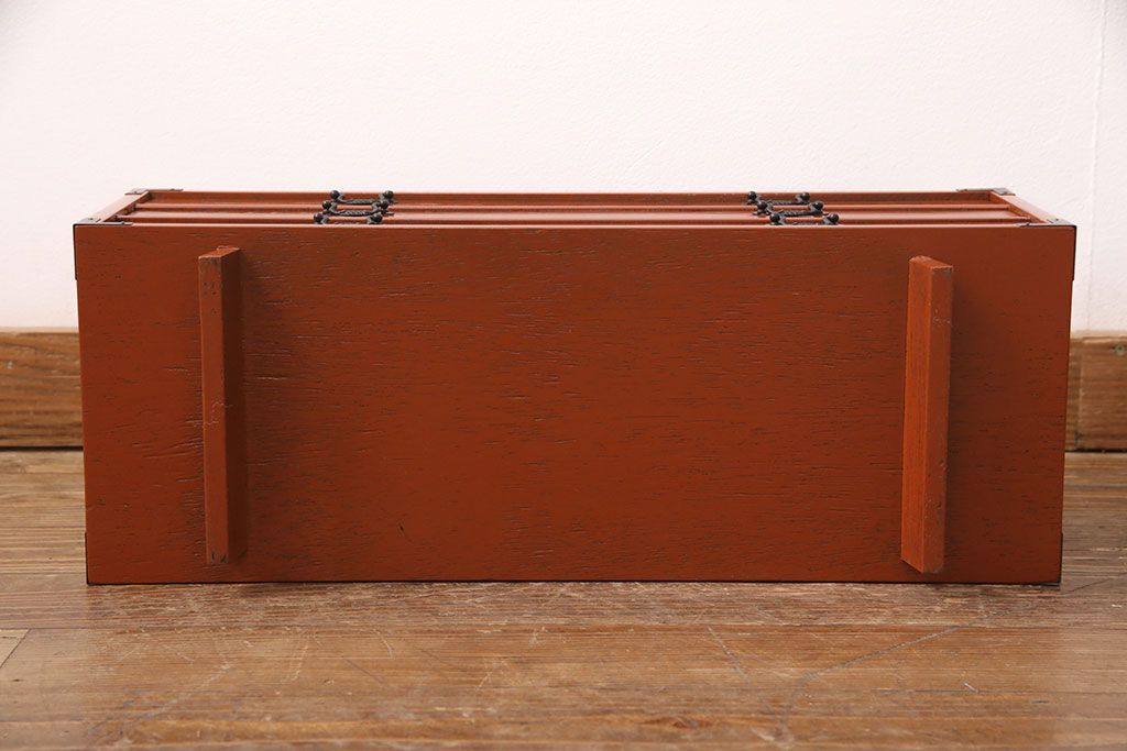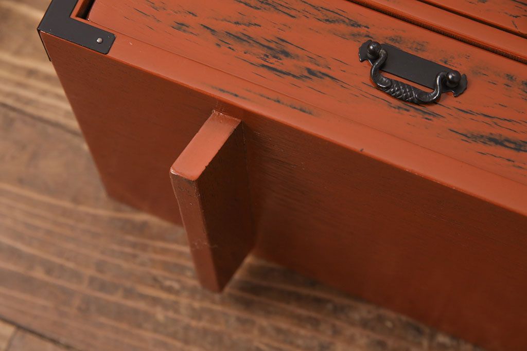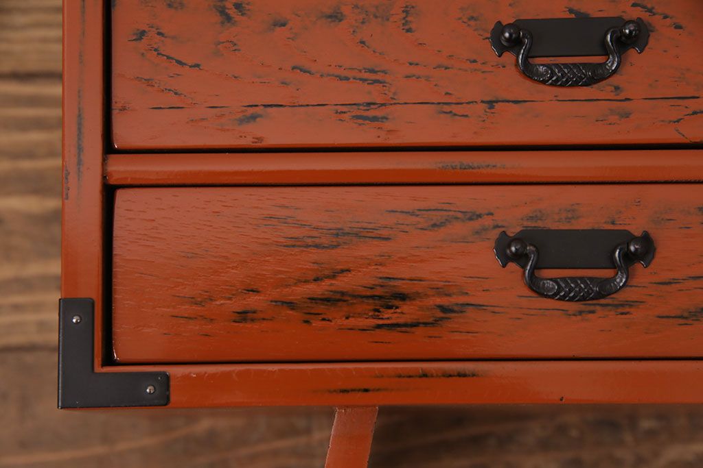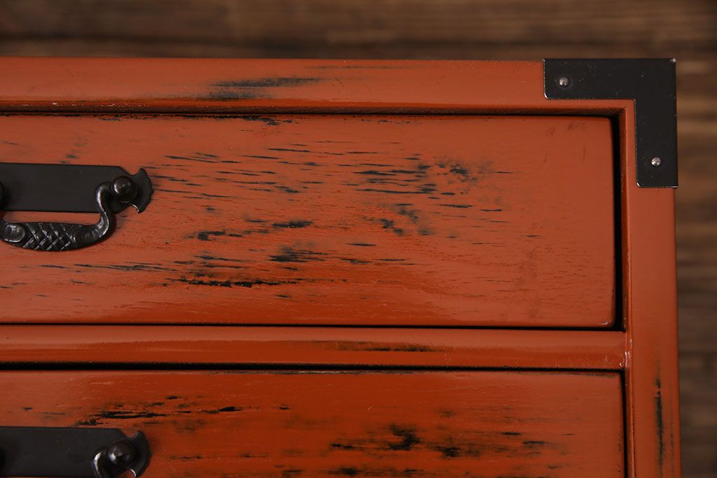 中古 美品 工芸家具 曙(あけぼの)塗り 漆の朱色が机上のアクセントになる小引き出し(根来塗り、卓上収納、小物収納)(R-051247)