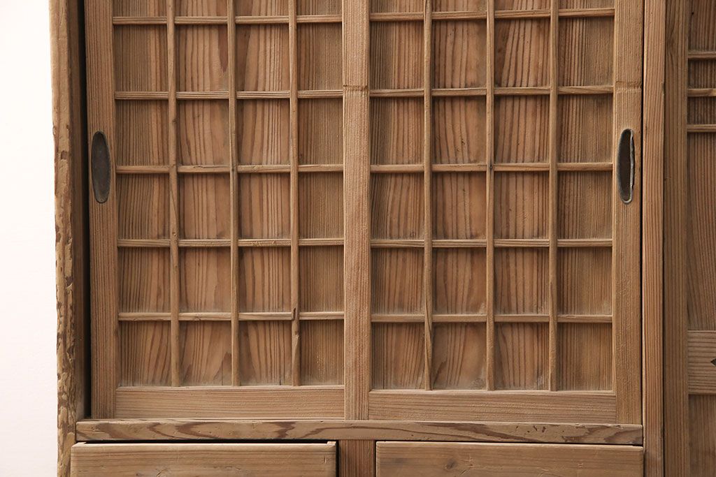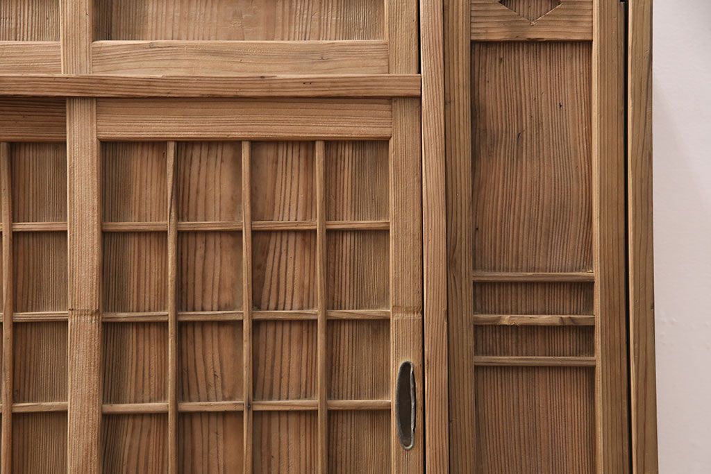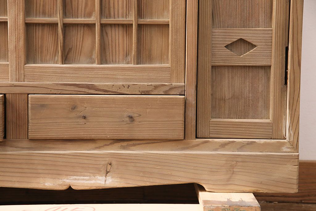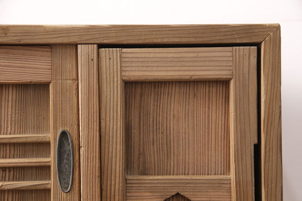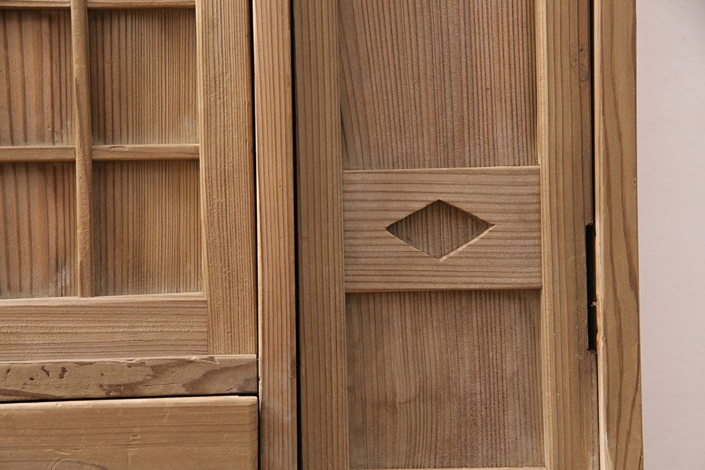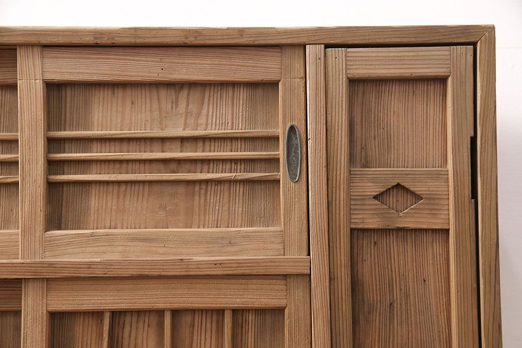 お問い合わせいただければ、優先してアップいたします。昭和初期 素朴な木味が魅力!凝った扉の造りが純和風の雰囲気を高める下駄箱(収納棚、靴箱、戸棚)(R-051183)です。