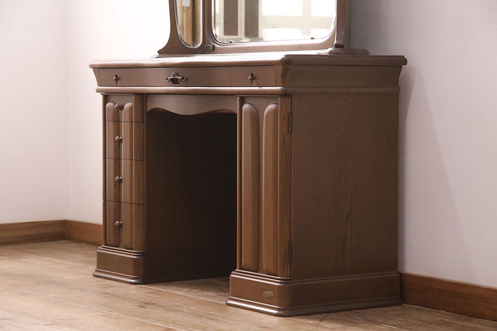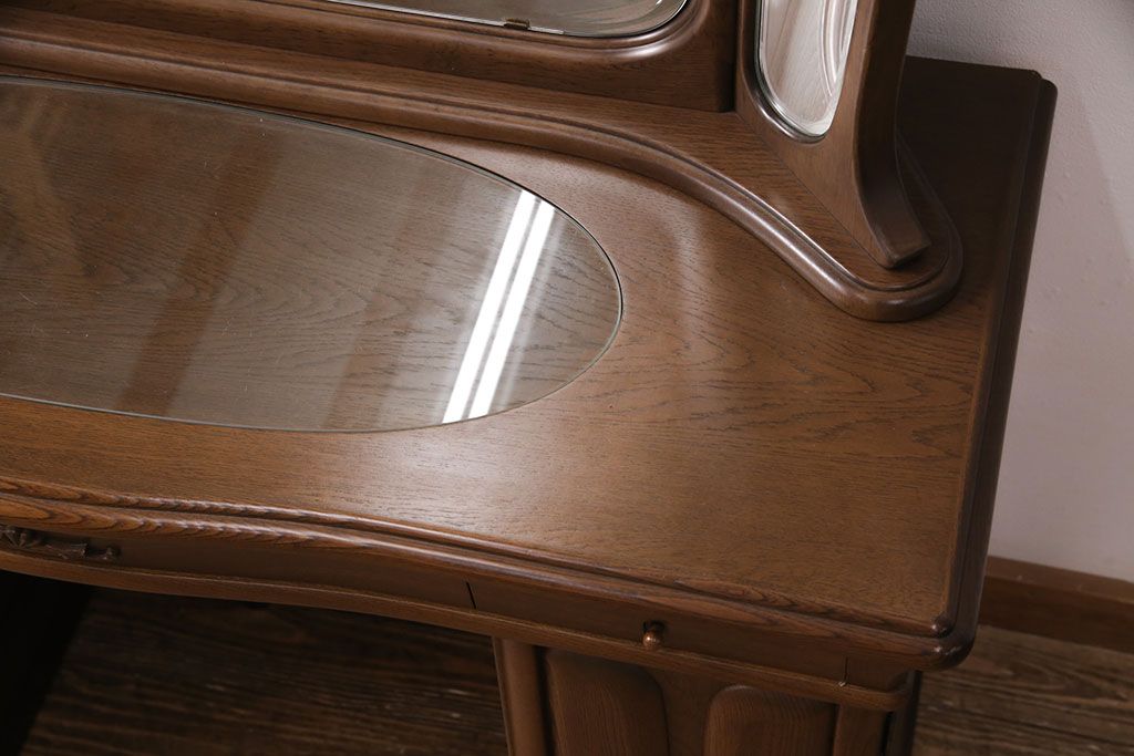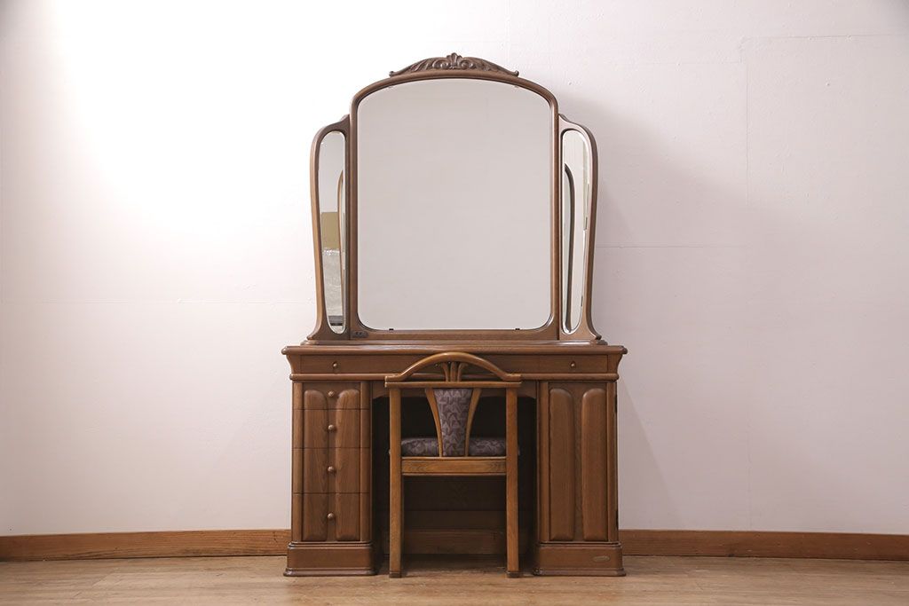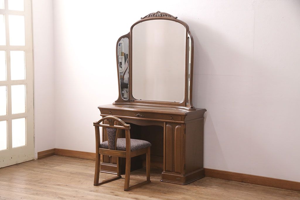 中古 松永工房 ゆるやかなカーブを描くデザインがエレガントな印象を醸し出すドレッサー&チェアセット(鏡台、スツール)(R-051305)