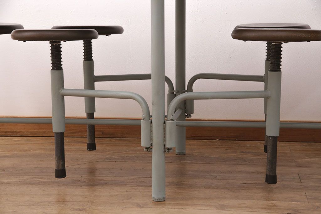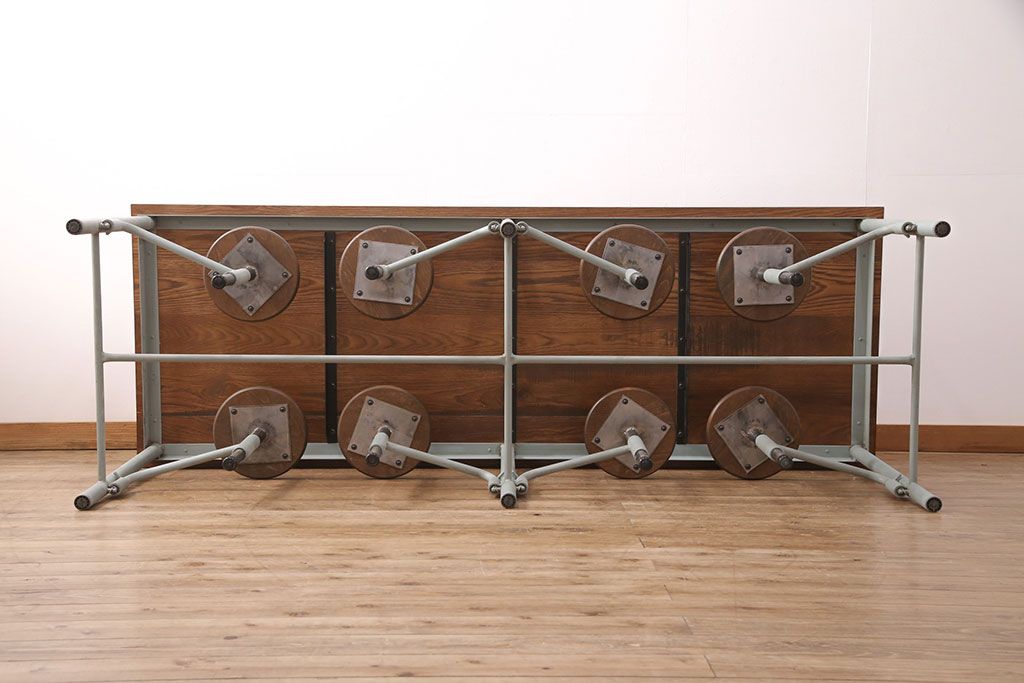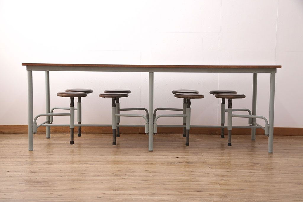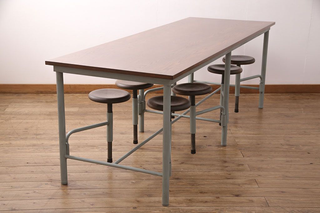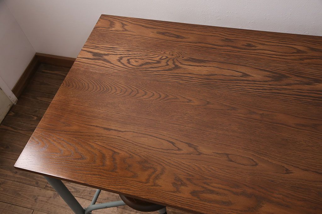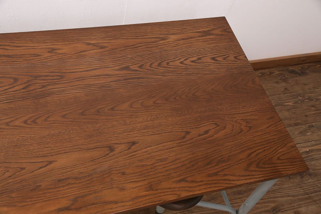 テーブル> 作業台 > 格納スツール8脚付きテーブルを新規製作!当店商品を参考に、ホワイトオークの天板を取り付け。淡い青緑のペイント仕上げ。(ダイニングテーブル、作業台、椅子)