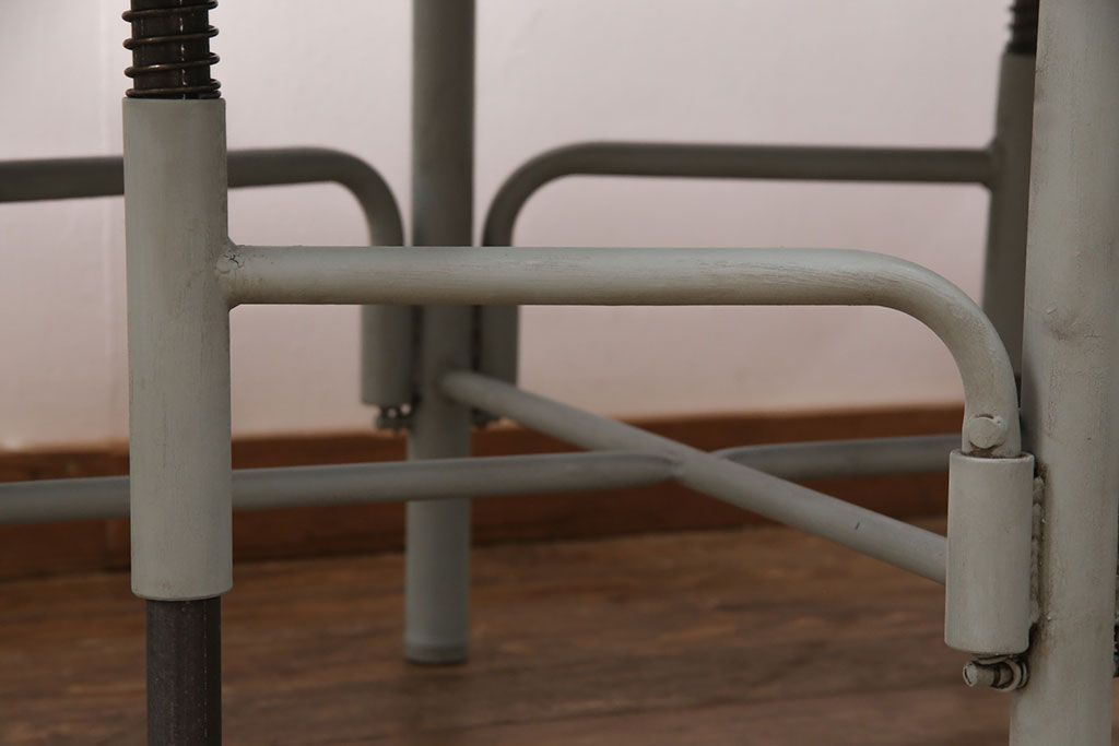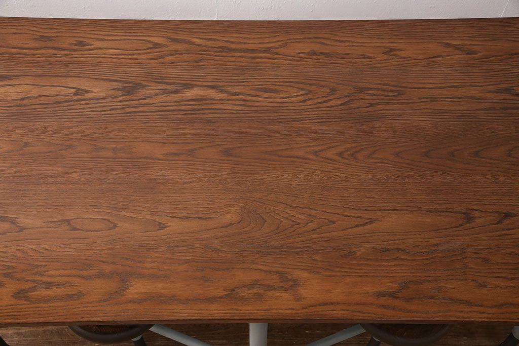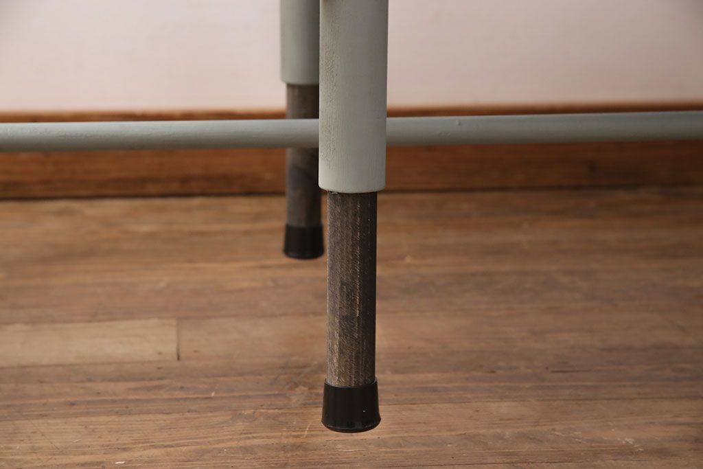 テーブル> 4人用ダイニングテーブル > 格納スツール8脚付きテーブルを新規製作!当店商品を参考に、ホワイトオークの天板を取り付け。淡い青緑のペイント仕上げ。(ダイニングテーブル、作業台、椅子)