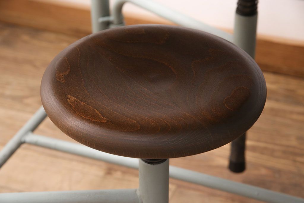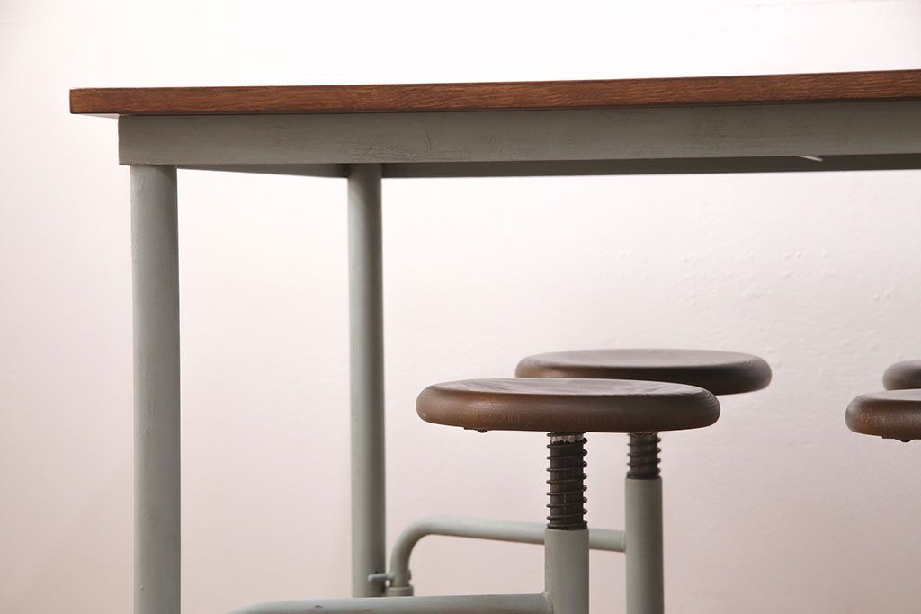 格納スツール8脚付きテーブルを新規製作!当店商品を参考に、ホワイトオークの天板を取り付け。淡い青緑のペイント仕上げ。(ダイニングテーブル、作業台、椅子)
