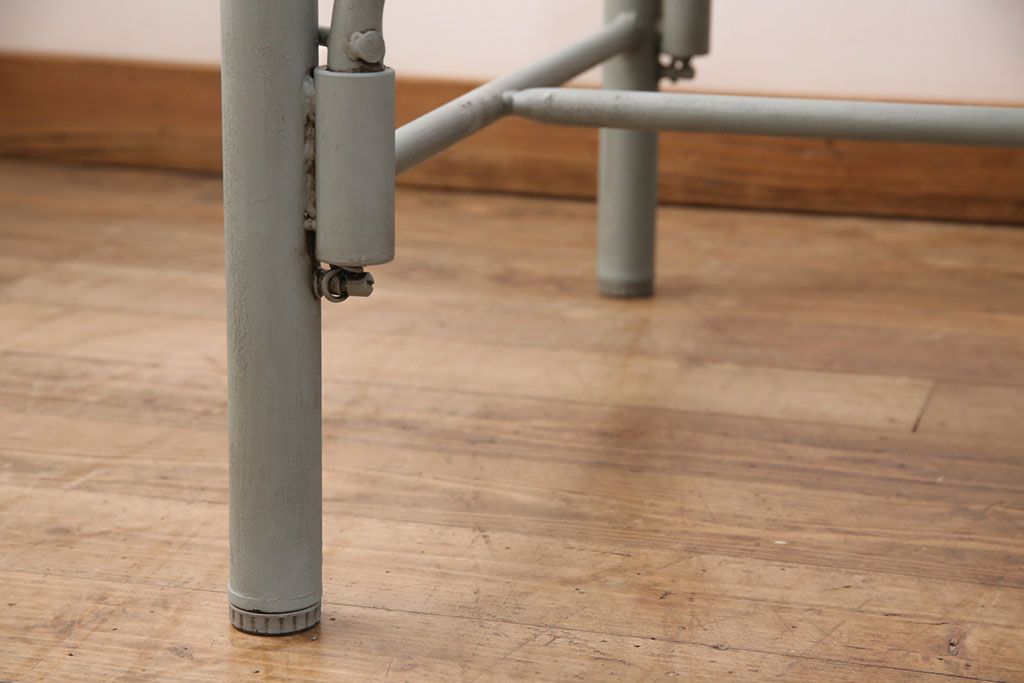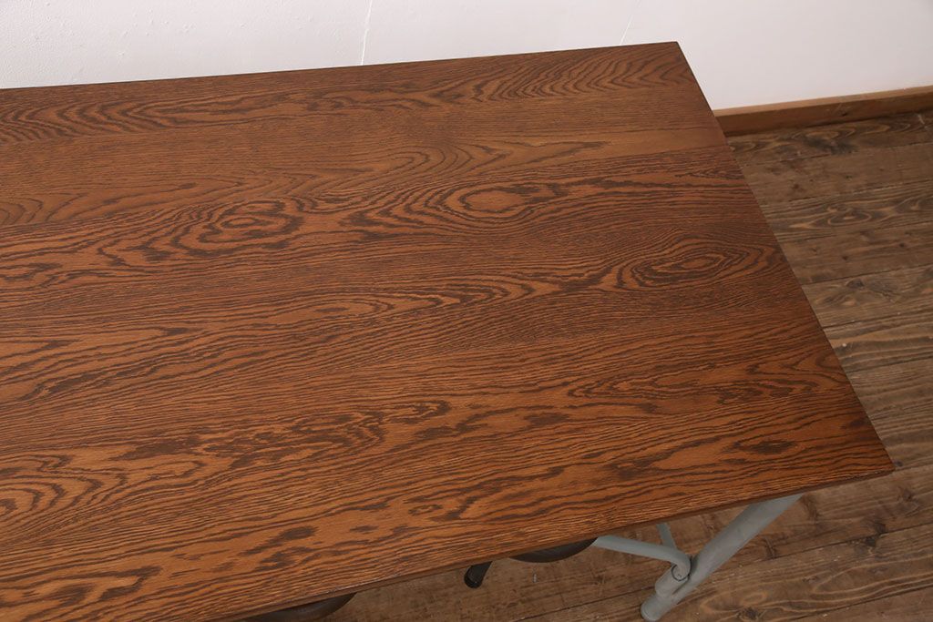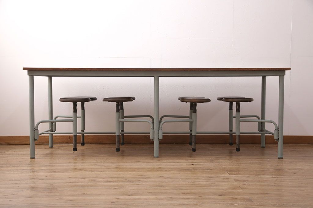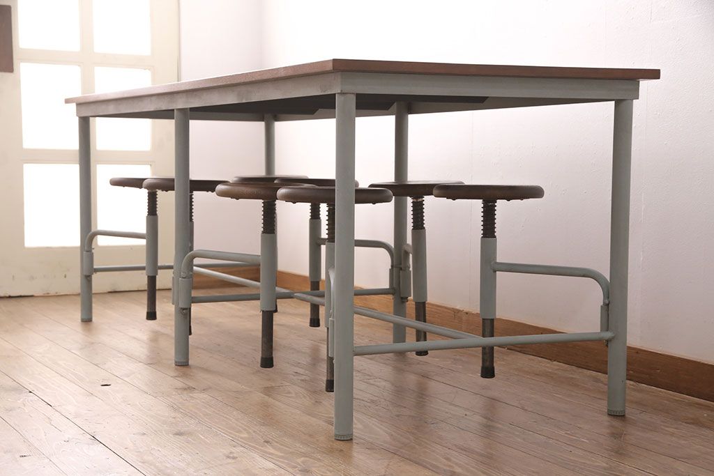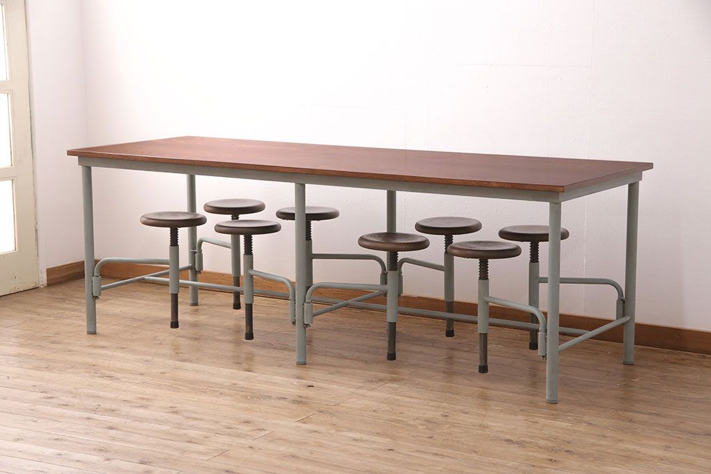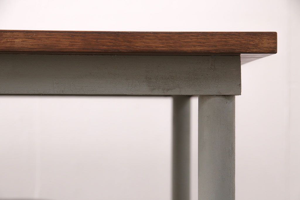 テーブル> 作業台 > 格納スツール8脚付きテーブルを新規製作!当店商品を参考に、ホワイトオークの天板を取り付け。淡い青緑のペイント仕上げ。(ダイニングテーブル、作業台、椅子)
