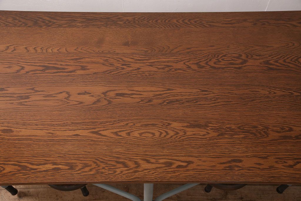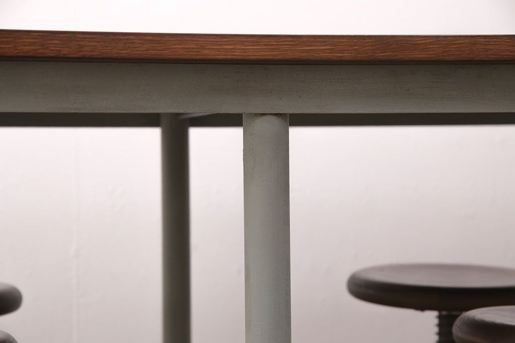テーブル> 4人用ダイニングテーブル > 格納スツール8脚付きテーブルを新規製作!当店商品を参考に、ホワイトオークの天板を取り付け。淡い青緑のペイント仕上げ。(ダイニングテーブル、作業台、椅子)