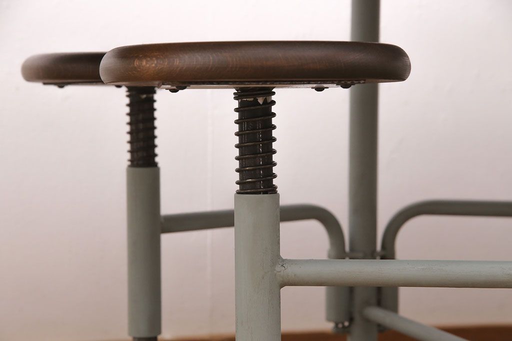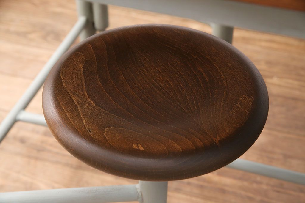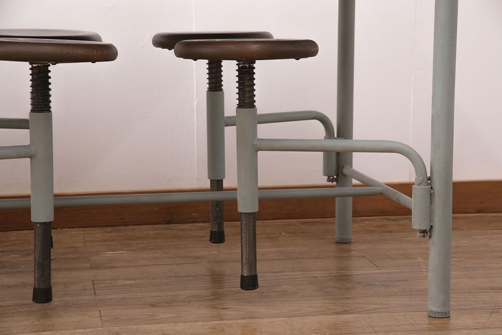 格納スツール8脚付きテーブルを新規製作!当店商品を参考に、ホワイトオークの天板を取り付け。淡い青緑のペイント仕上げ。(ダイニングテーブル、作業台、椅子)