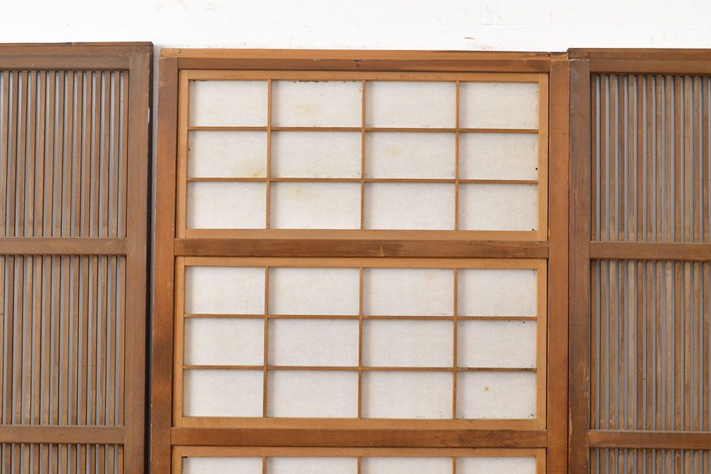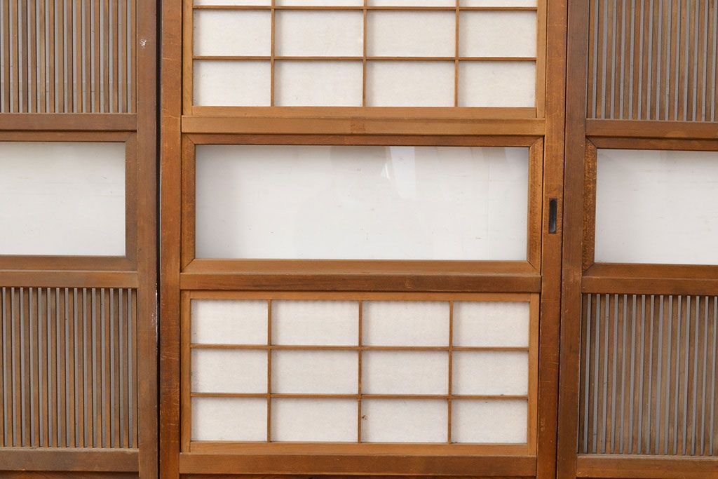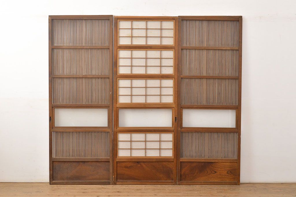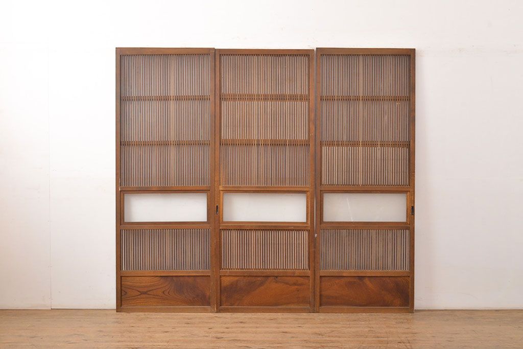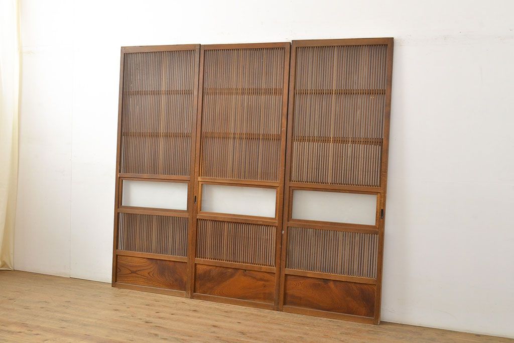 アンティーク建具 昭和初期 裏障子付き 上手物の幅狭万本格子戸3枚セット(引き戸、帯ガラス戸、障子戸)(R-051165)