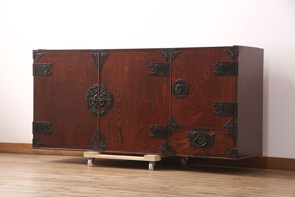 ラフジュ工房> キャビネット・戸棚> テレビ台・ローボード > 中古 民芸家具 岩谷堂箪笥 天板・脚(台輪)付きリメイク 和の趣あふれる現代のお部屋にぴったりの衣装盆付きサイドボード(ローボード、着物箪笥、収納棚、テレビ台)(R-051255)