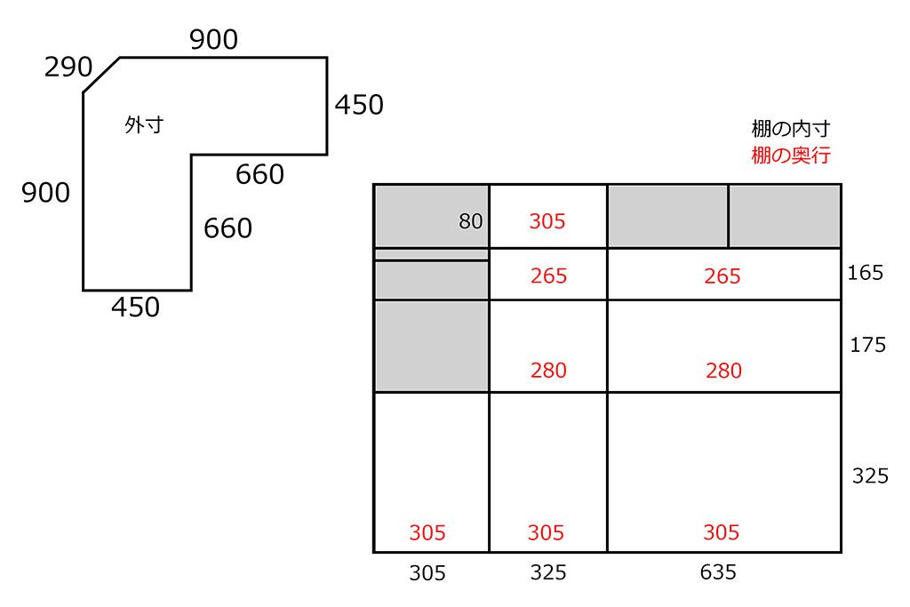 設置場所や収納するものは余裕をもってお考えいただくか、改めて正確に計測いたしますのでお申し付けください。