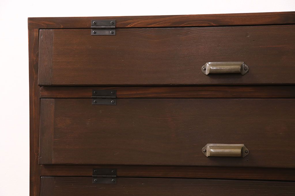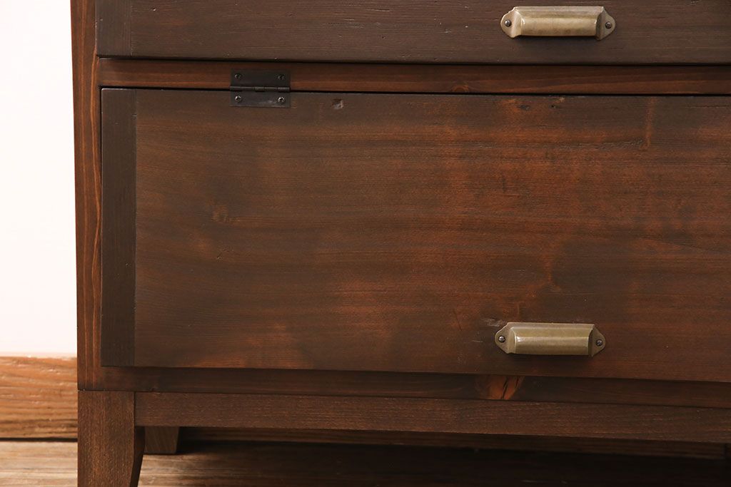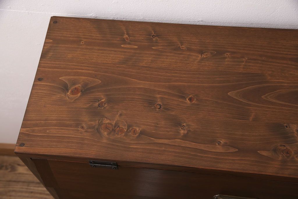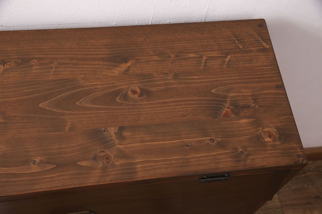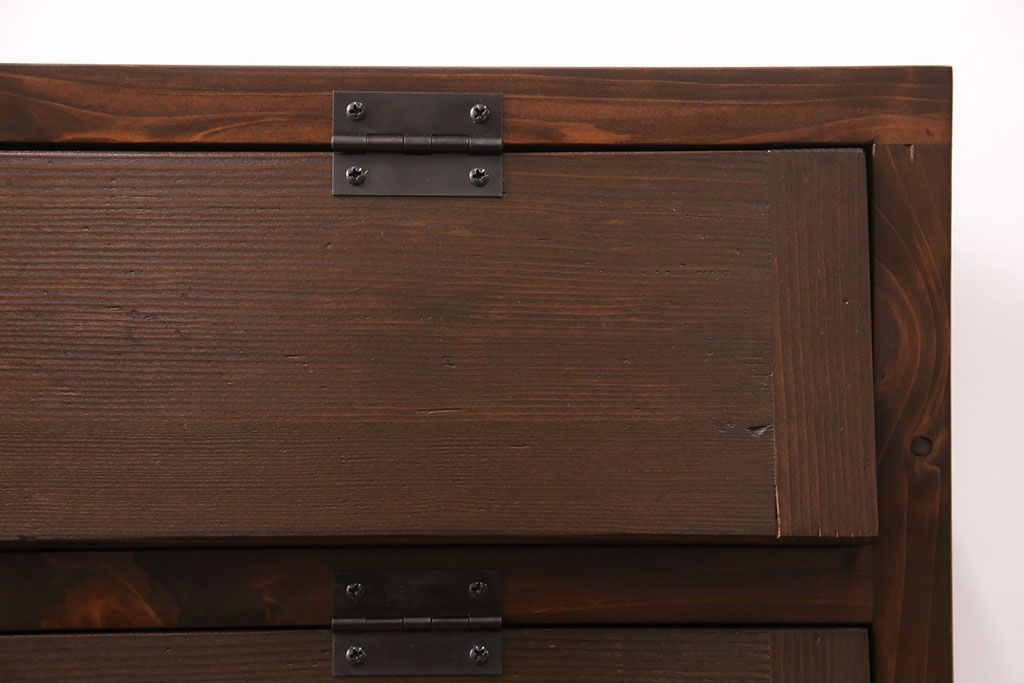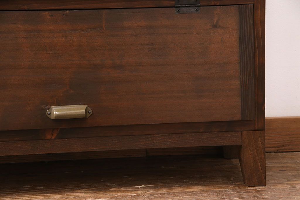 ワードローブ・ロッカー> ロッカー > パタパタ扉の下駄箱を新規製作!本体はヒノキ無垢材、前板は古材で制作。取っ手と木製脚を取り付け。当店商品を参考に着色し仕上げ。(戸棚、キャビネット、収納棚、ロッカー)
