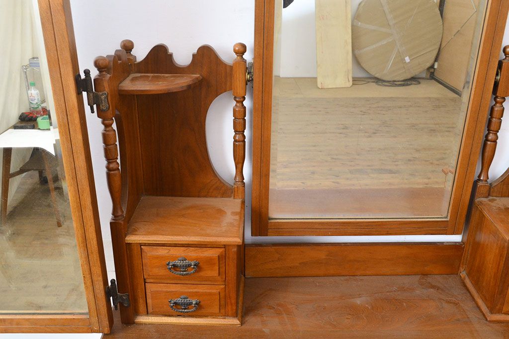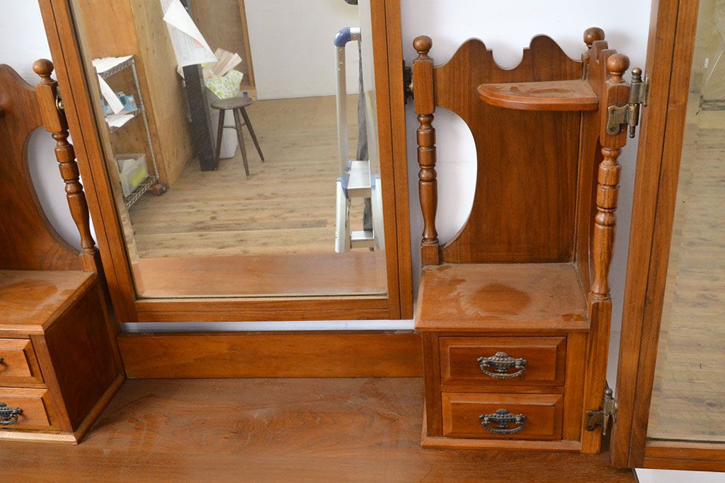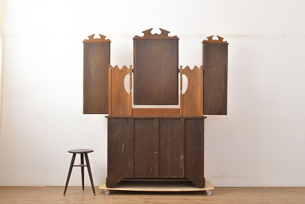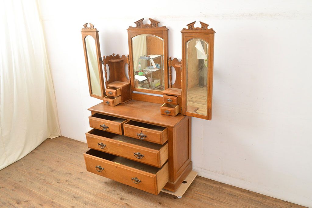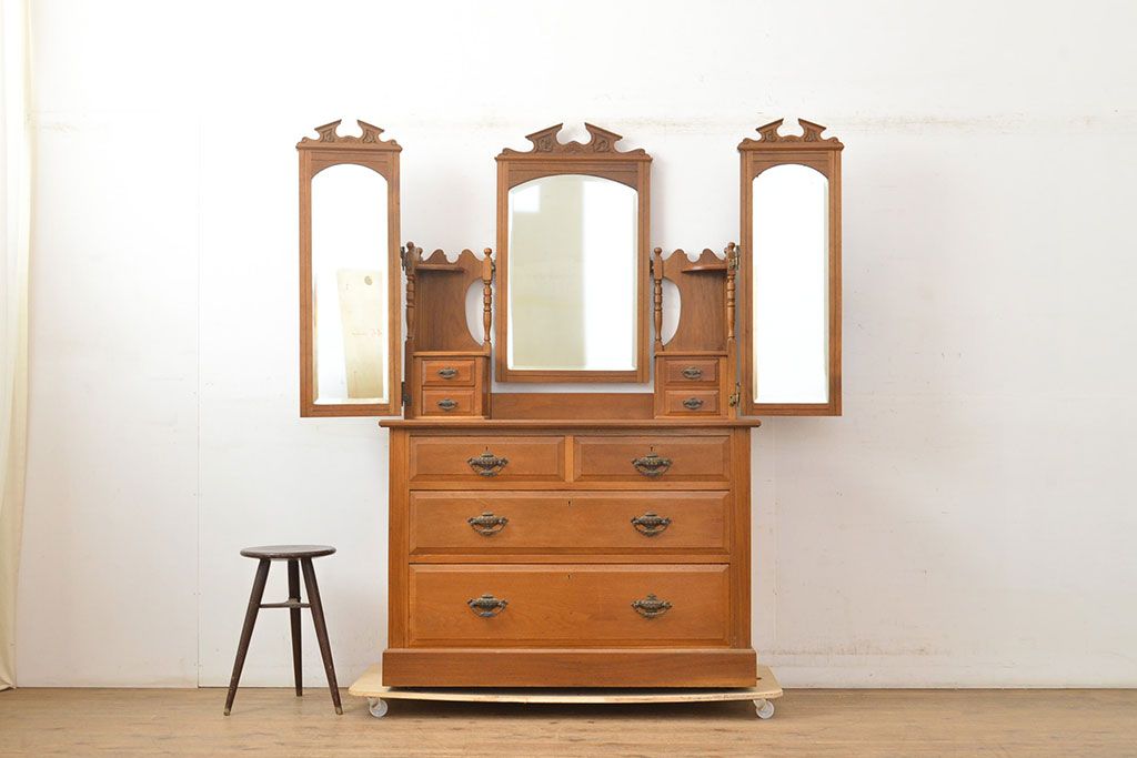 イギリスアンティーク チーク材 インパクトのある凝ったつくりが魅力のドレッシングチェスト(ドレッサー、鏡台、三面鏡)(R-050254)です。