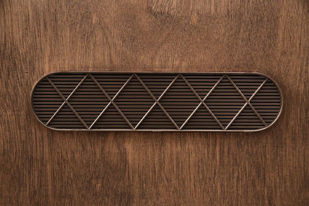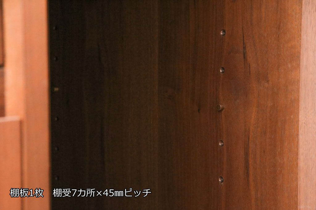 棚板は取り外しできます。棚板は1枚あります。棚受けは7ヶ所、45mmピッチで調整できます。棚幅サイズのものが1枚の作りです。