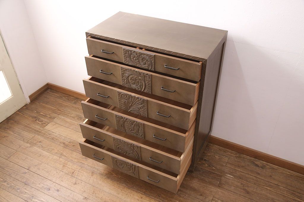 ビンテージ家具 京都産 神戸洋家具 ペイント仕上げ限定 連なった彫が見事!まるで美術品のようなチェスト(引き出し、衣装タンス)(R-051273)です。