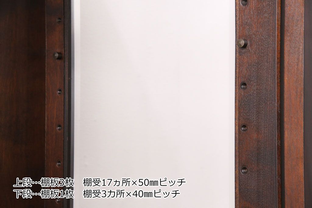 棚板は取り外しできます。棚板は上段3枚、下段1枚あります。棚受けは上段が17ヶ所、50mmピッチ、下段は3ヶ所、40mmピッチで調整できます。棚幅サイズのものが1枚の作りです。