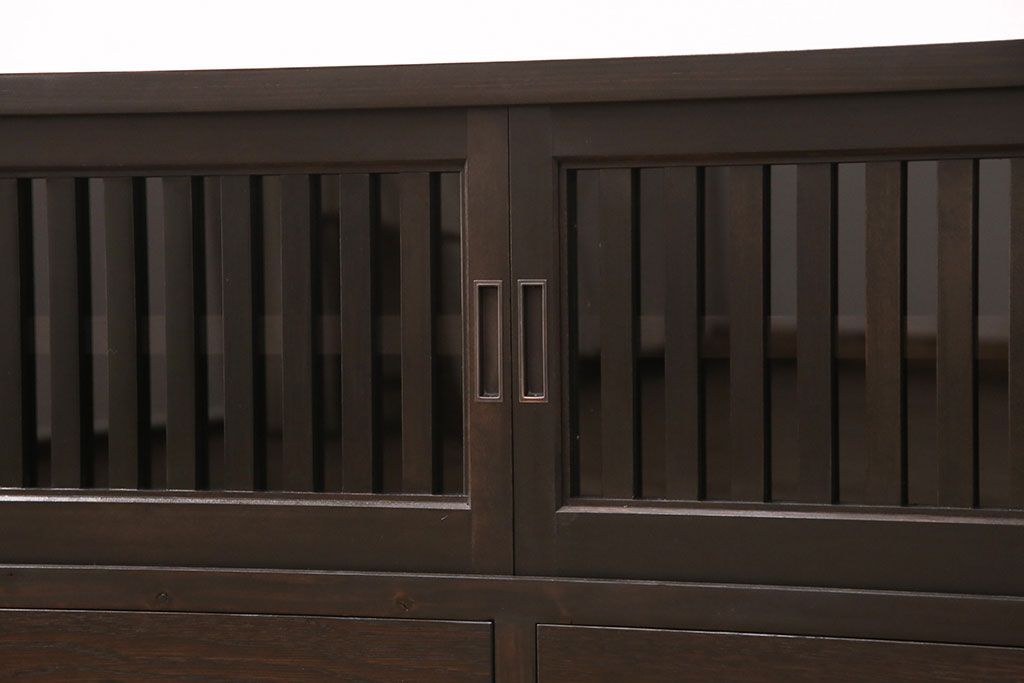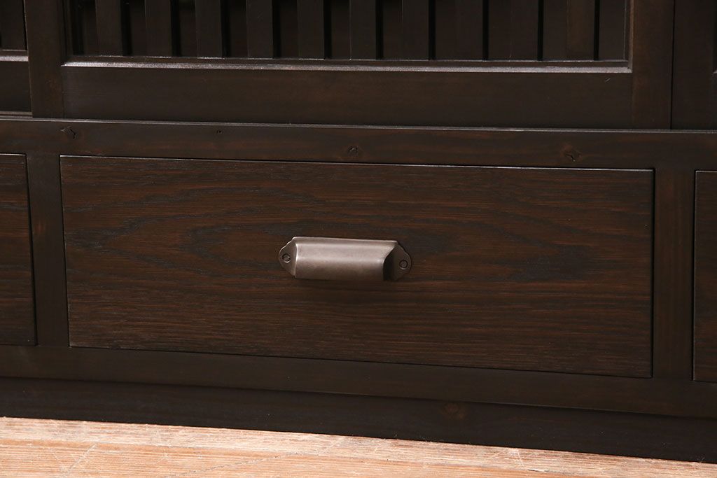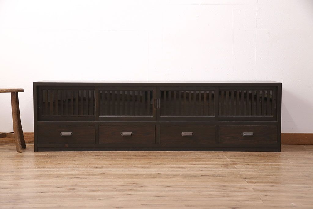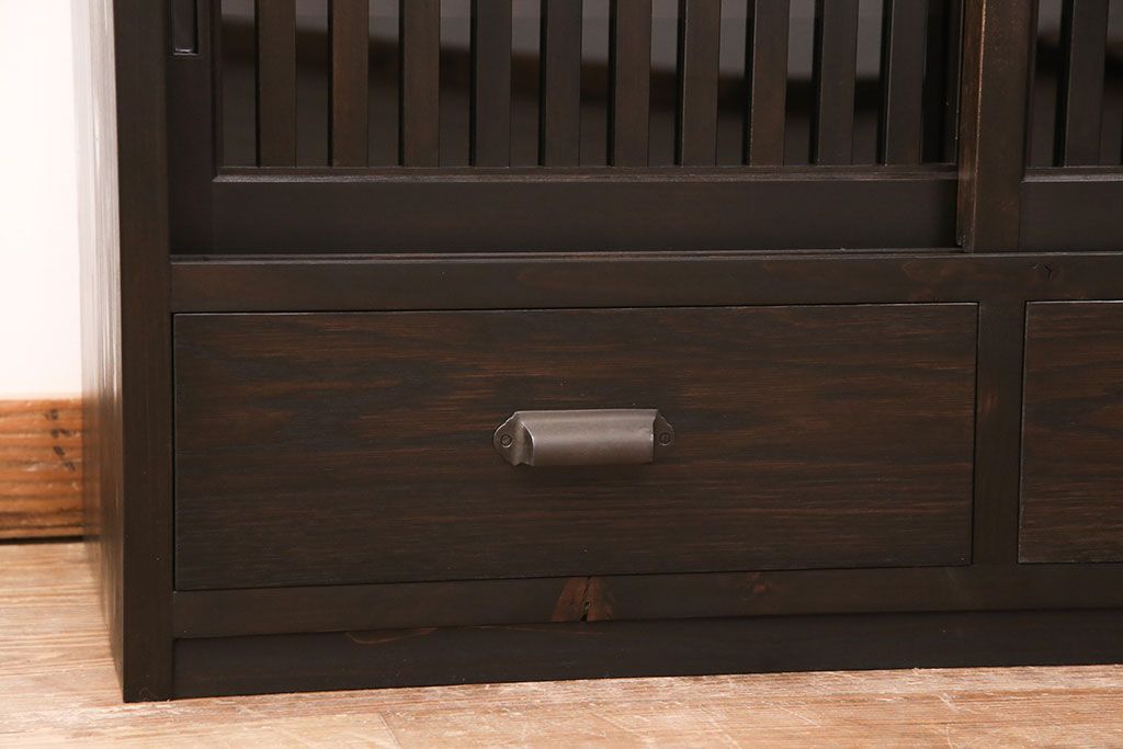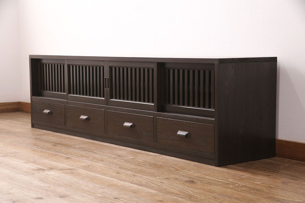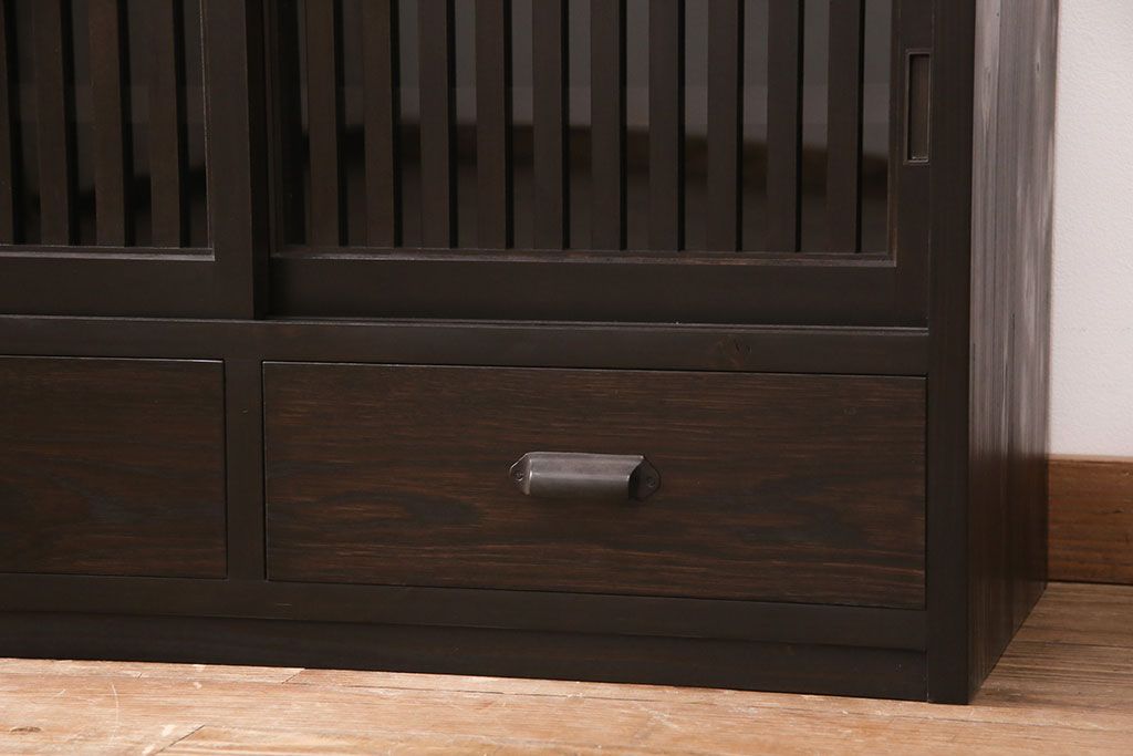 キャビネット・戸棚> サイドボード > ローボードを新規製作!建具は縦格子とクリアガラスを組み入れ、下部に引き出しを設置。同時購入の商品と色を合わせて着色し仕上げ。(収納棚、戸棚、サイドボード)
