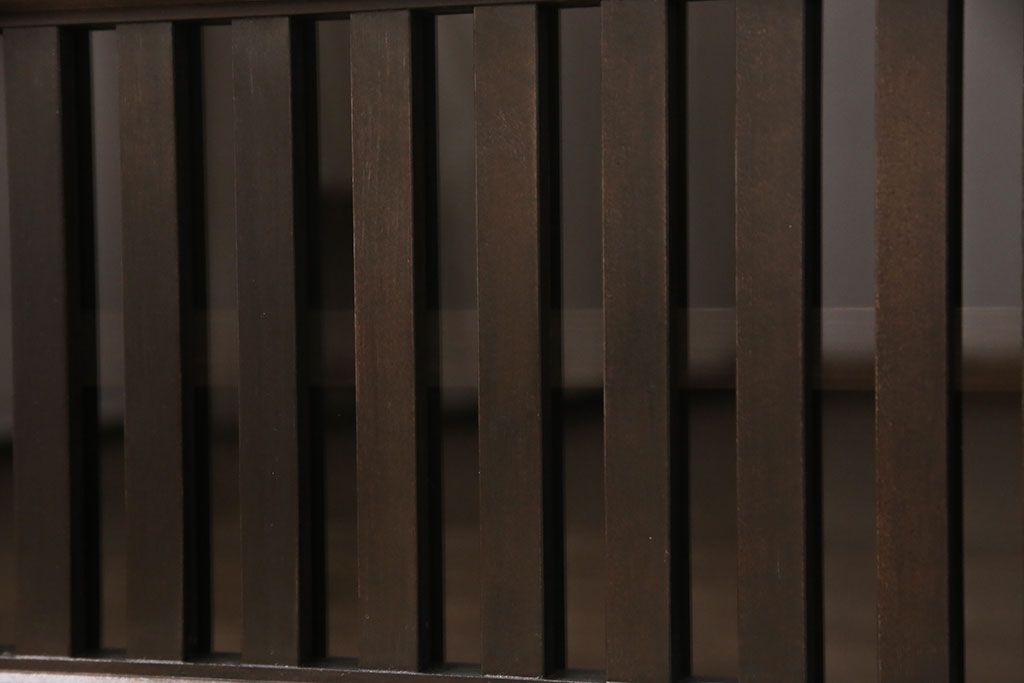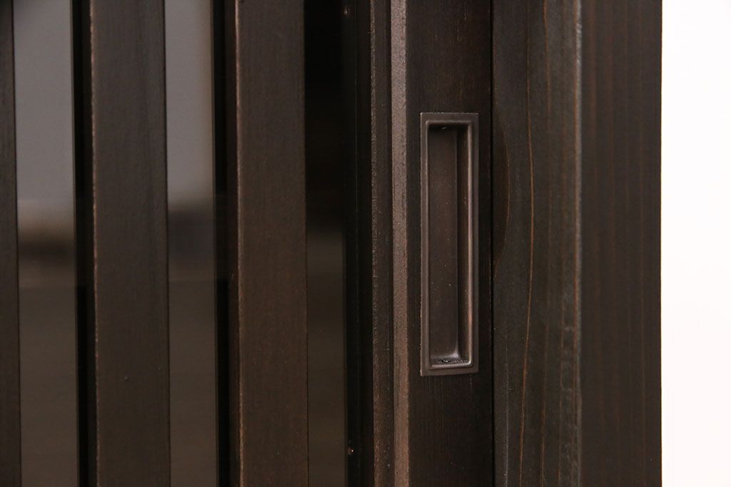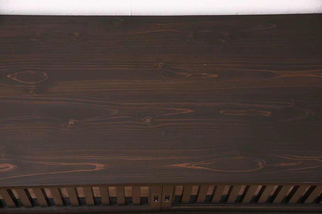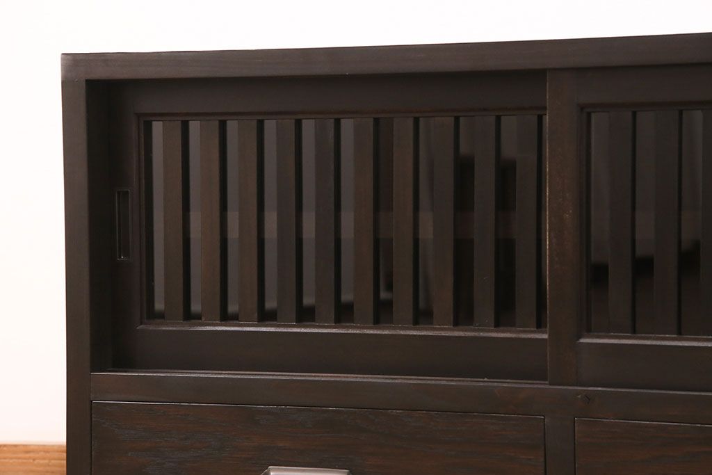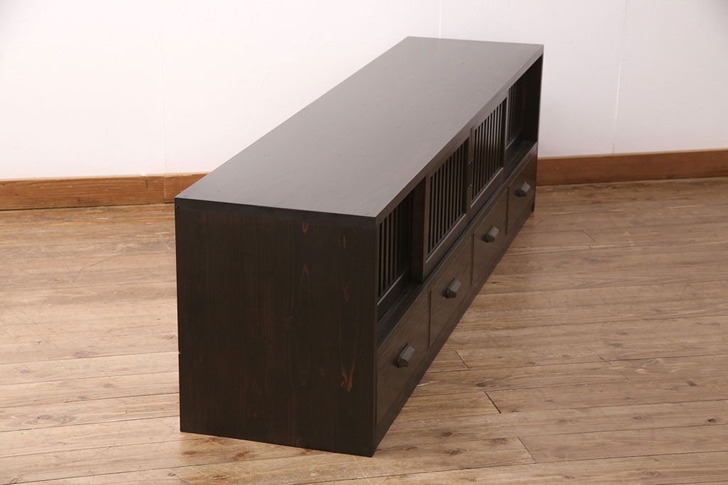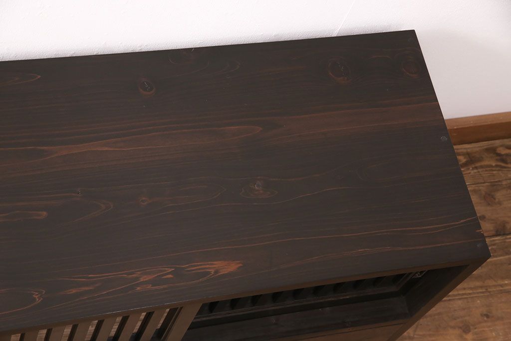 キャビネット・戸棚> サイドボード > ローボードを新規製作!建具は縦格子とクリアガラスを組み入れ、下部に引き出しを設置。同時購入の商品と色を合わせて着色し仕上げ。(収納棚、戸棚、サイドボード)