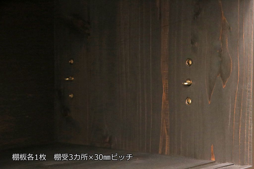 棚板は取り外しできます。棚板は各1枚あります。棚受けは3ヶ所、30mmピッチで調整できます。棚幅サイズのものが1枚の作りです。
