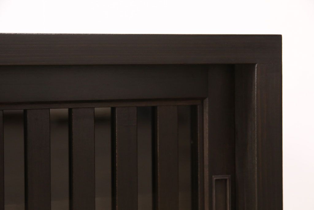 フルオーダー家具実績 > ローボードを新規製作!建具は縦格子とクリアガラスを組み入れ、下部に引き出しを設置。同時購入の商品と色を合わせて着色し仕上げ。(収納棚、戸棚、サイドボード)