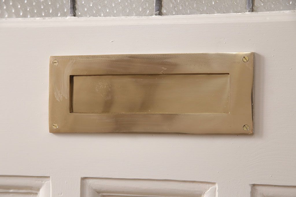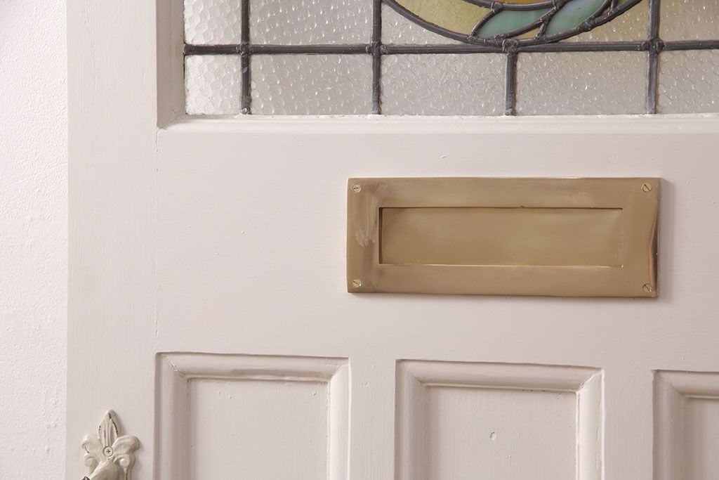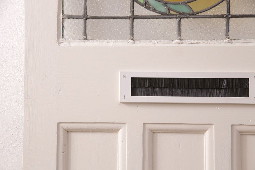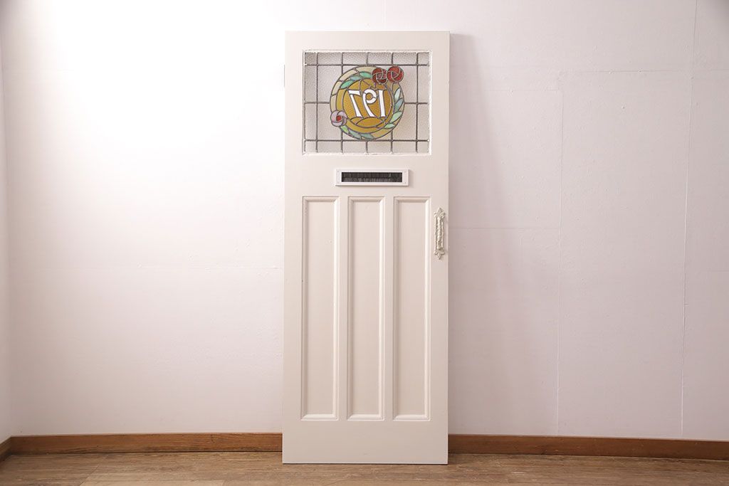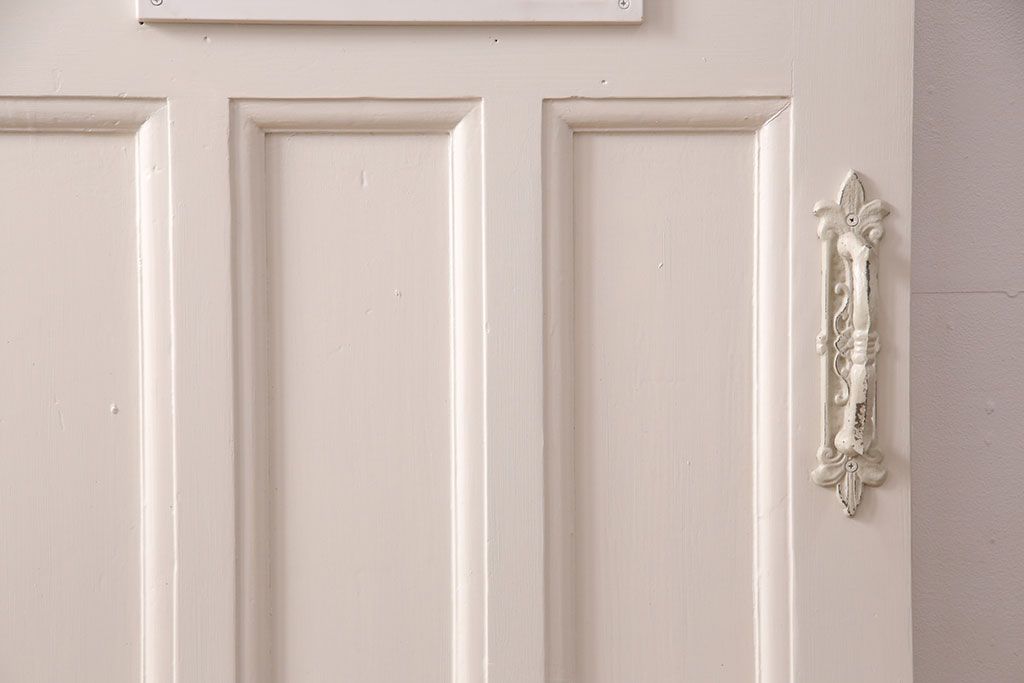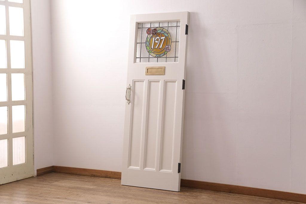 ドア・建具> 玄関ドア・玄関戸 > フランスアンティークのステンドグラス入り木製ドアをリペア&カスタム!開き勝手を左右変更し、ローラー締り・蝶番も取り付け。元の色味に近しいアンティークホワイトの着色し仕上げ。(扉、玄関戸、建具)