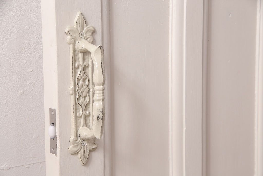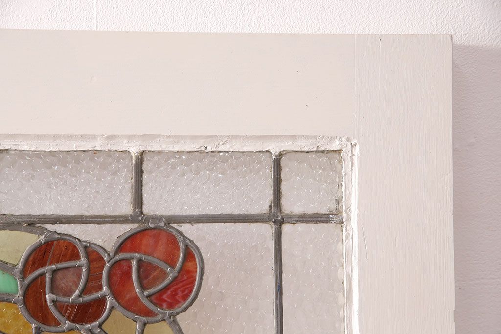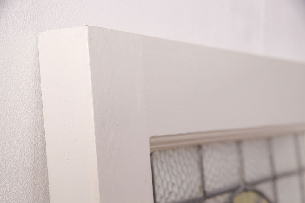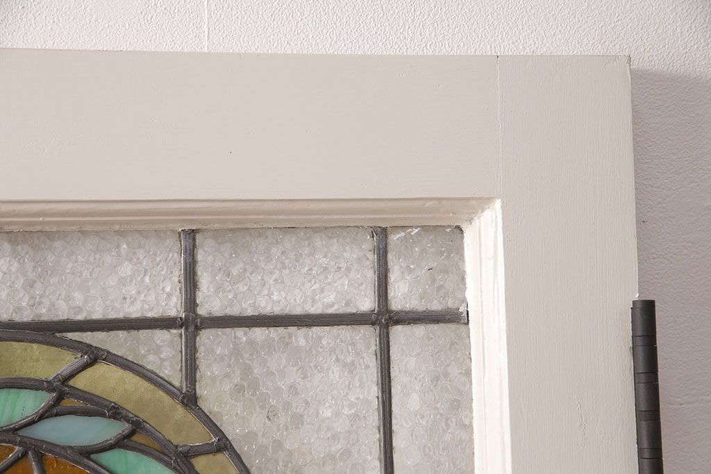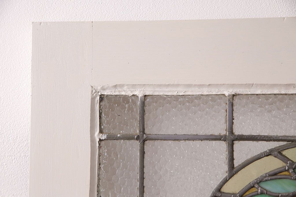 ドア・建具> ドア・扉 > フランスアンティークのステンドグラス入り木製ドアをリペア&カスタム!開き勝手を左右変更し、ローラー締り・蝶番も取り付け。元の色味に近しいアンティークホワイトの着色し仕上げ。(扉、玄関戸、建具)