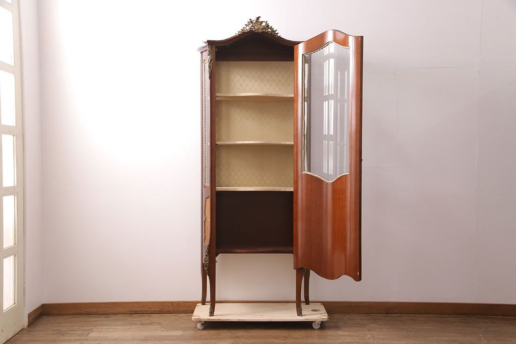 中古 真鍮の飾りが付いたアンティーク風の高級イタリアキャビネット(ガラスキャビネット、ショーケース、飾り棚)(定価約65万円)(R-051406)