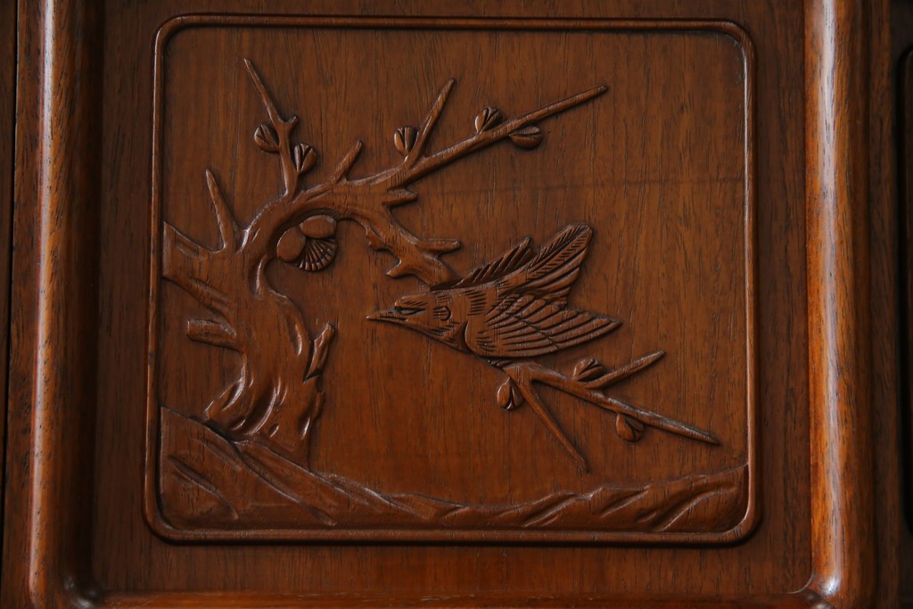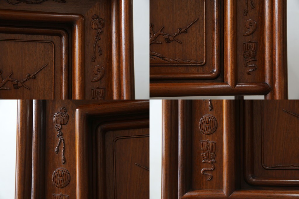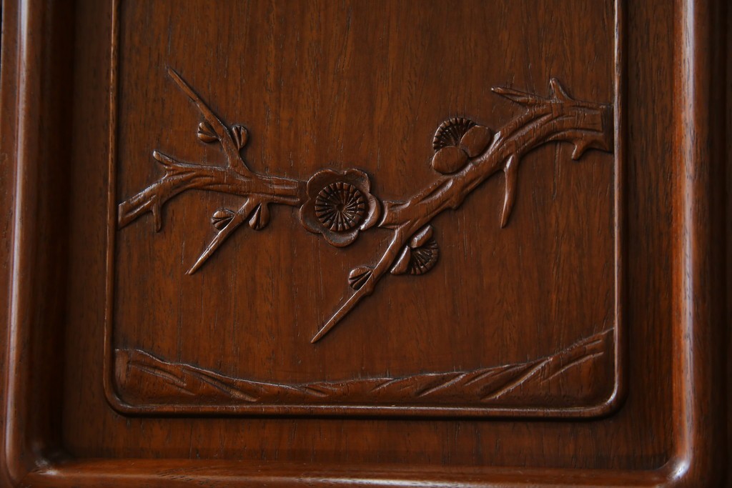 繊細な花菱文様の透かし彫り、松竹梅や打ち出の小槌、宝船などの随所に施された縁起の良いモチーフの彫刻が目を惹く一品です。