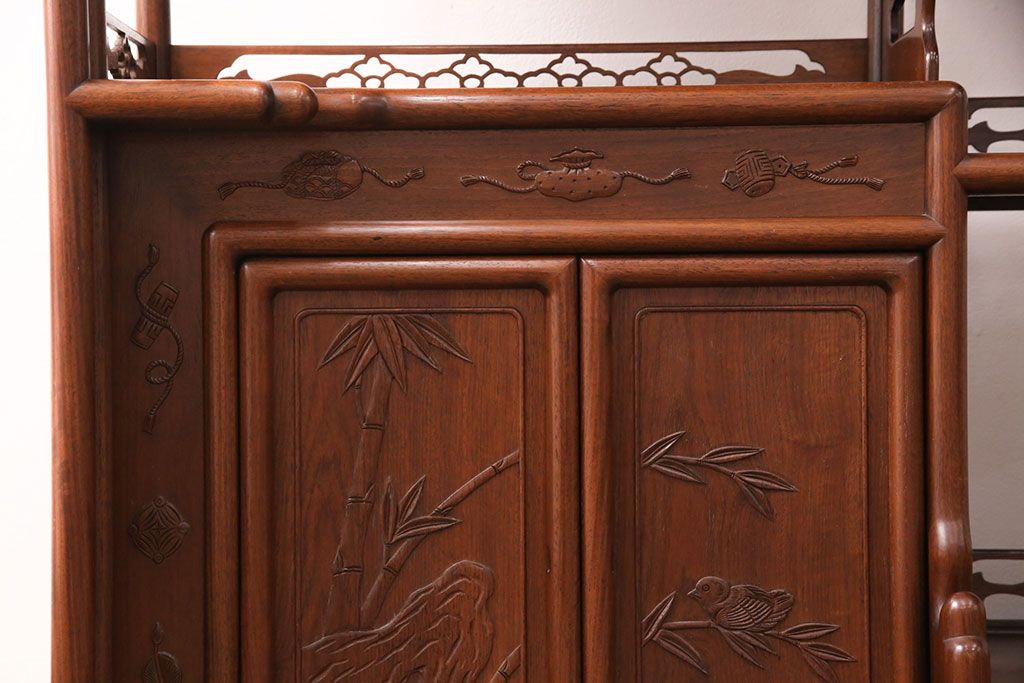 中古 美品 伝統工芸家具 中澤唐木製 漆塗りが上品な雰囲気を漂わせるカリン材製の飾り棚(茶棚、収納棚、戸棚、花梨材)(R-051408)