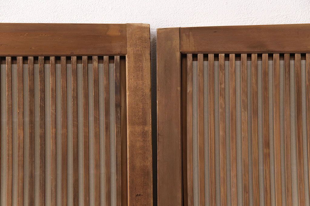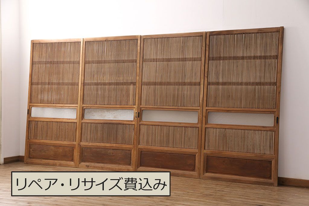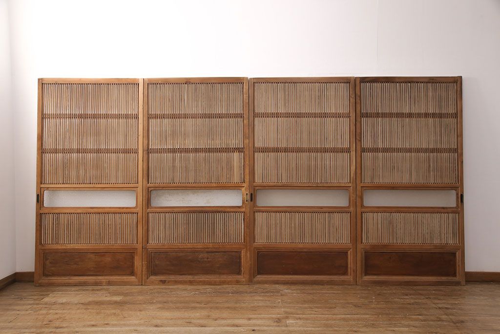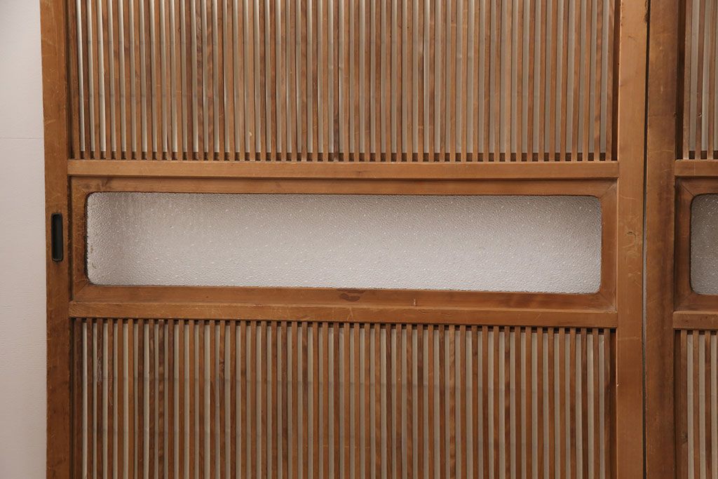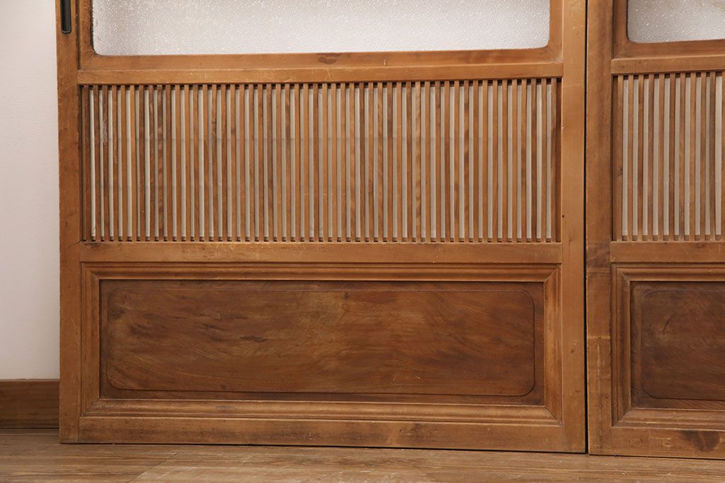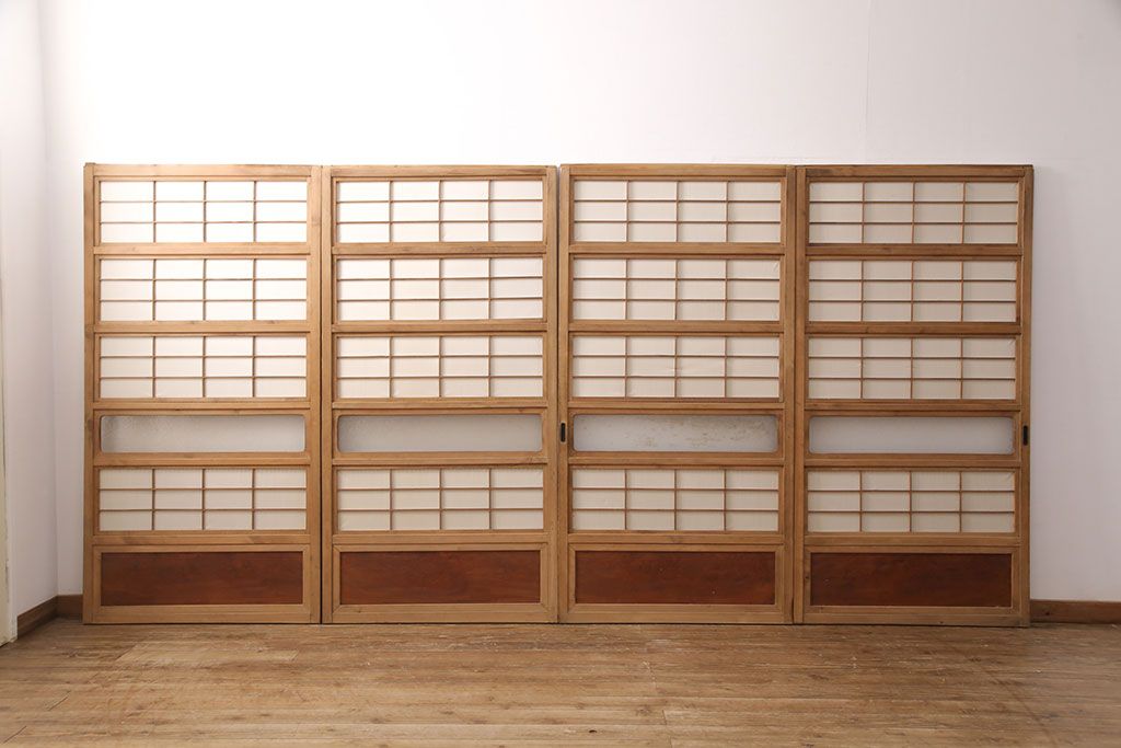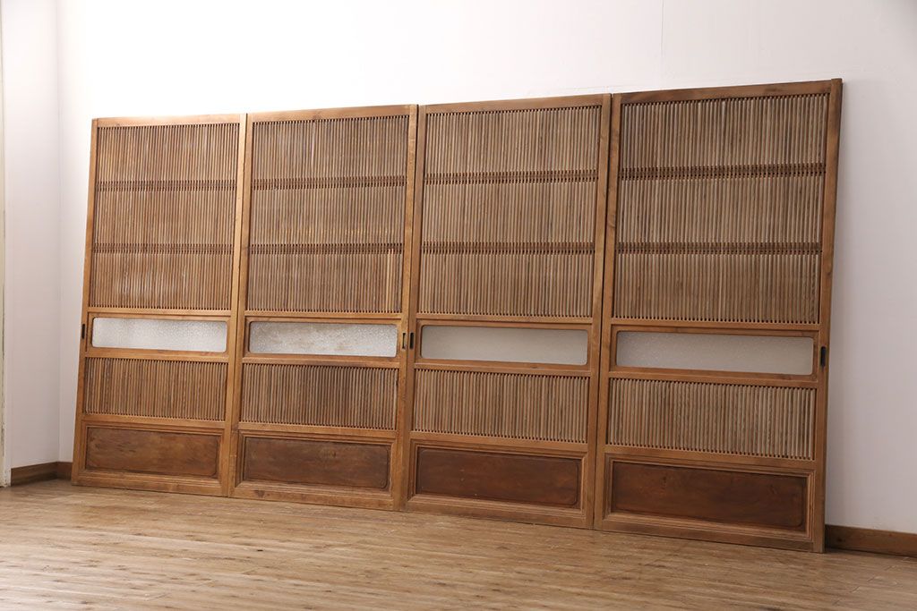 アンティーク建具 腰板ケヤキ材 ダイヤガラス 品のある和の雰囲気が素敵な裏障子付き格子戸4枚セット(引き戸、障子戸)(R-051444)