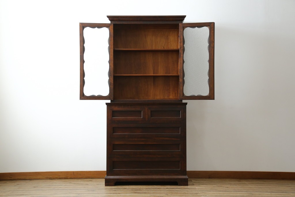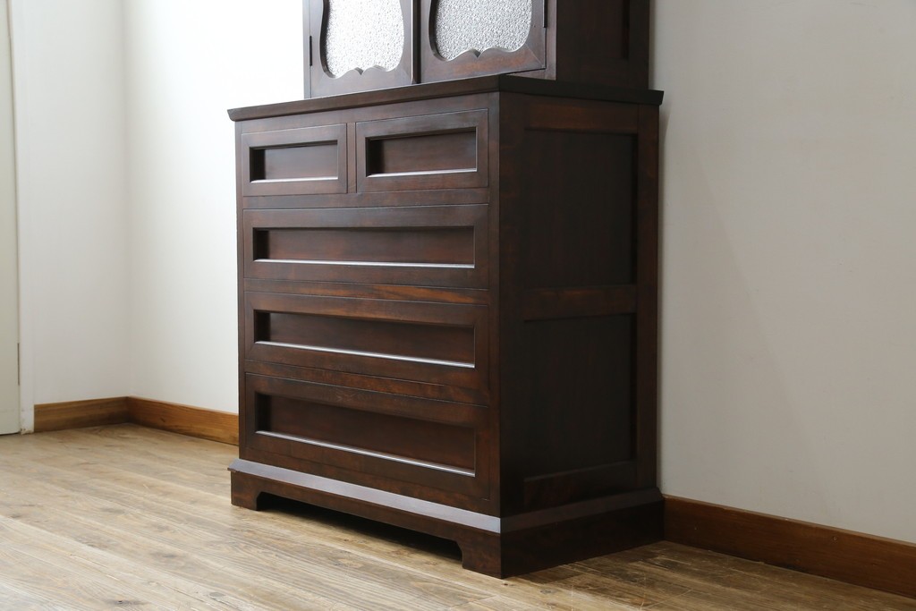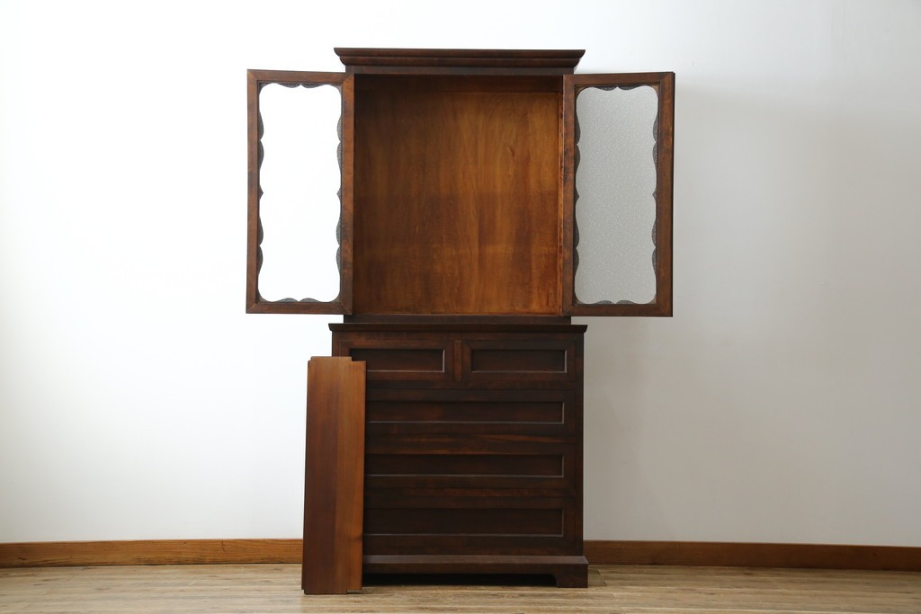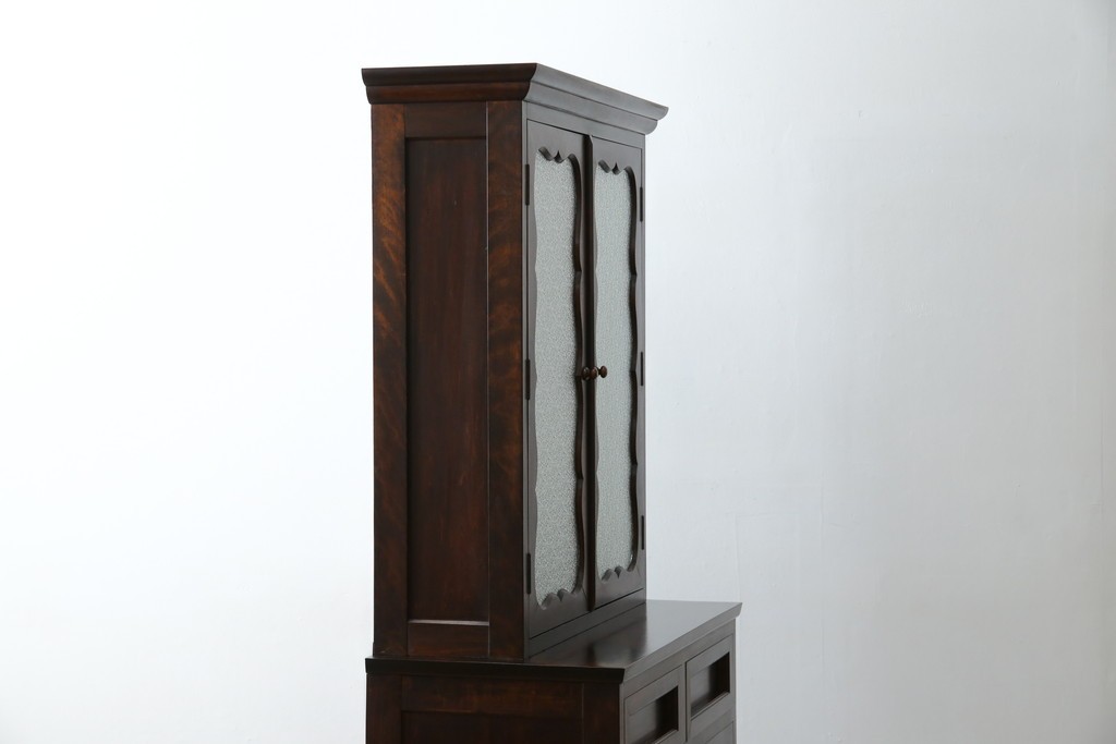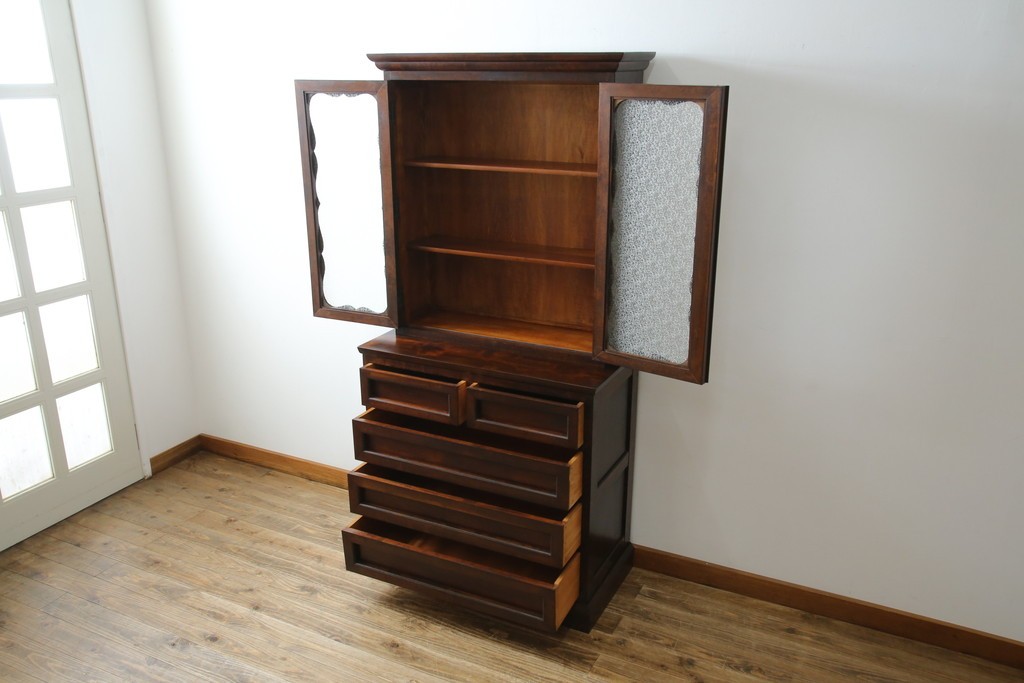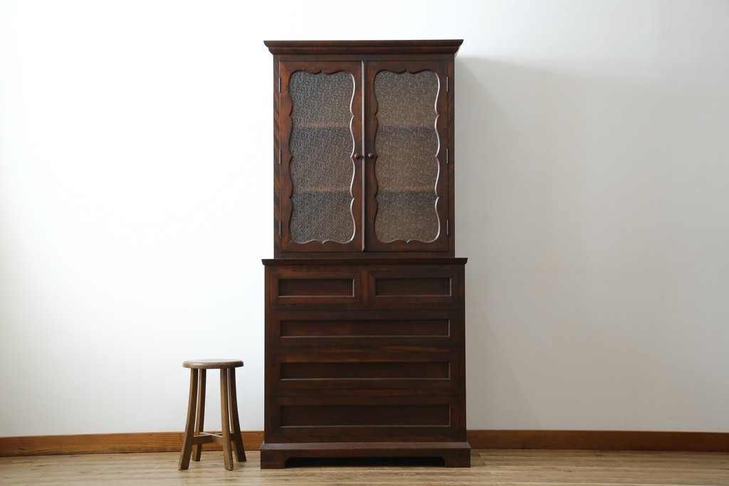 和製ヴィンテージ 国産職人手作り 手造り民芸家具 ガラス扉のデザインがおしゃれなキャビネット (R-051362)