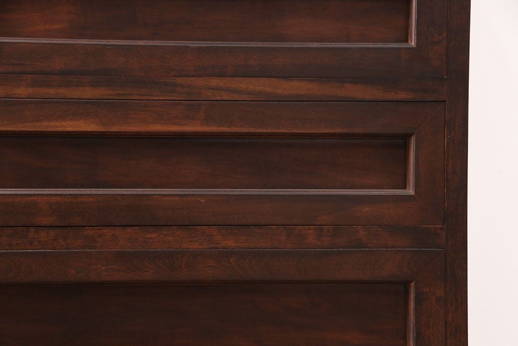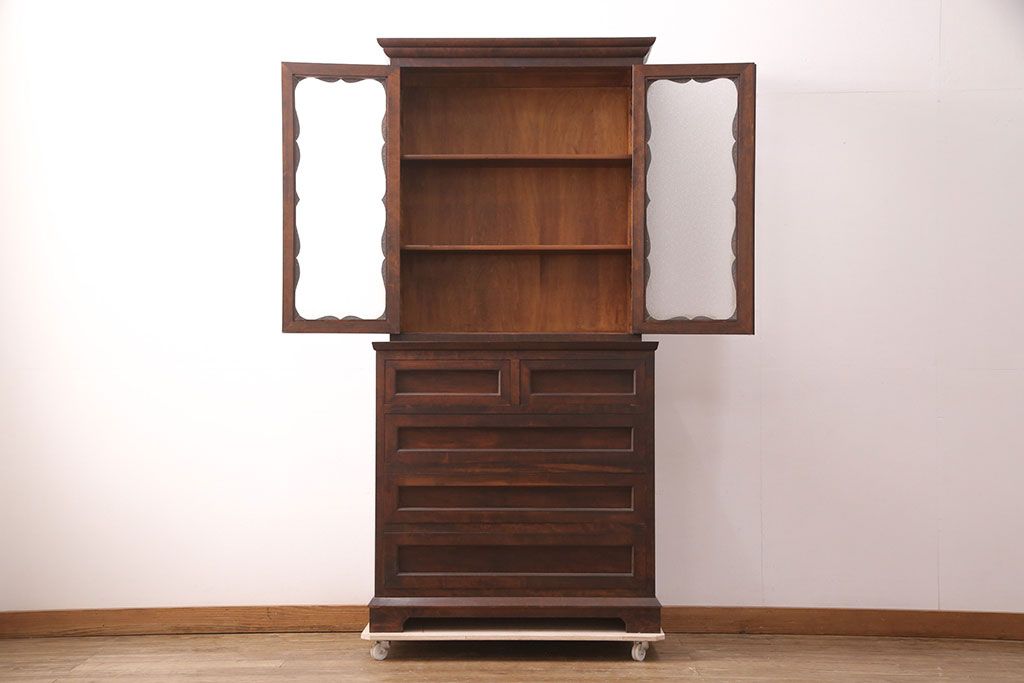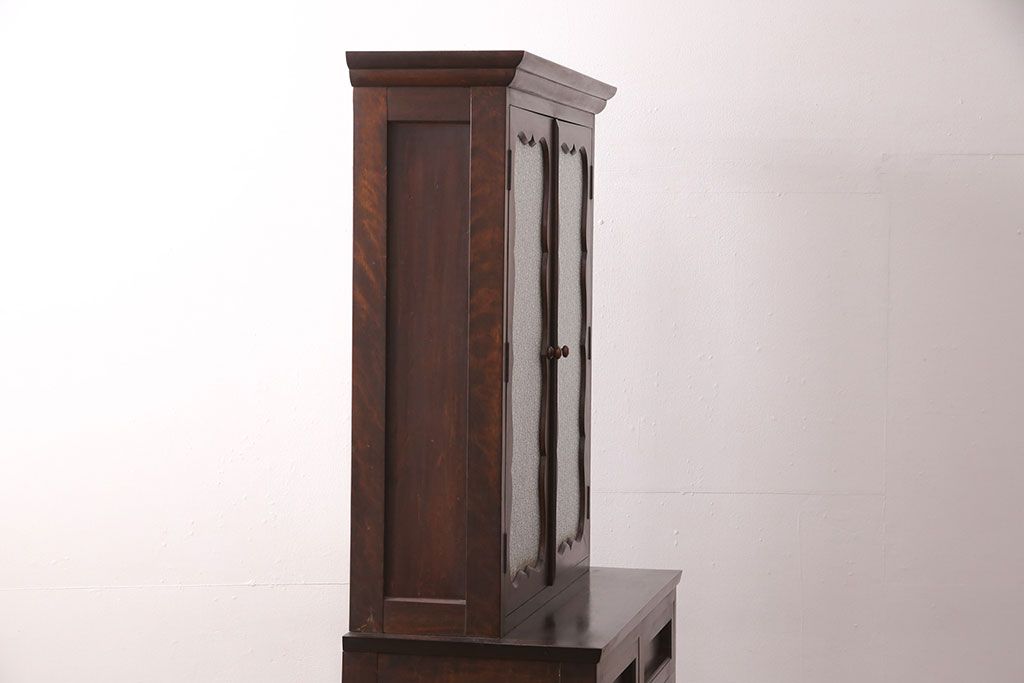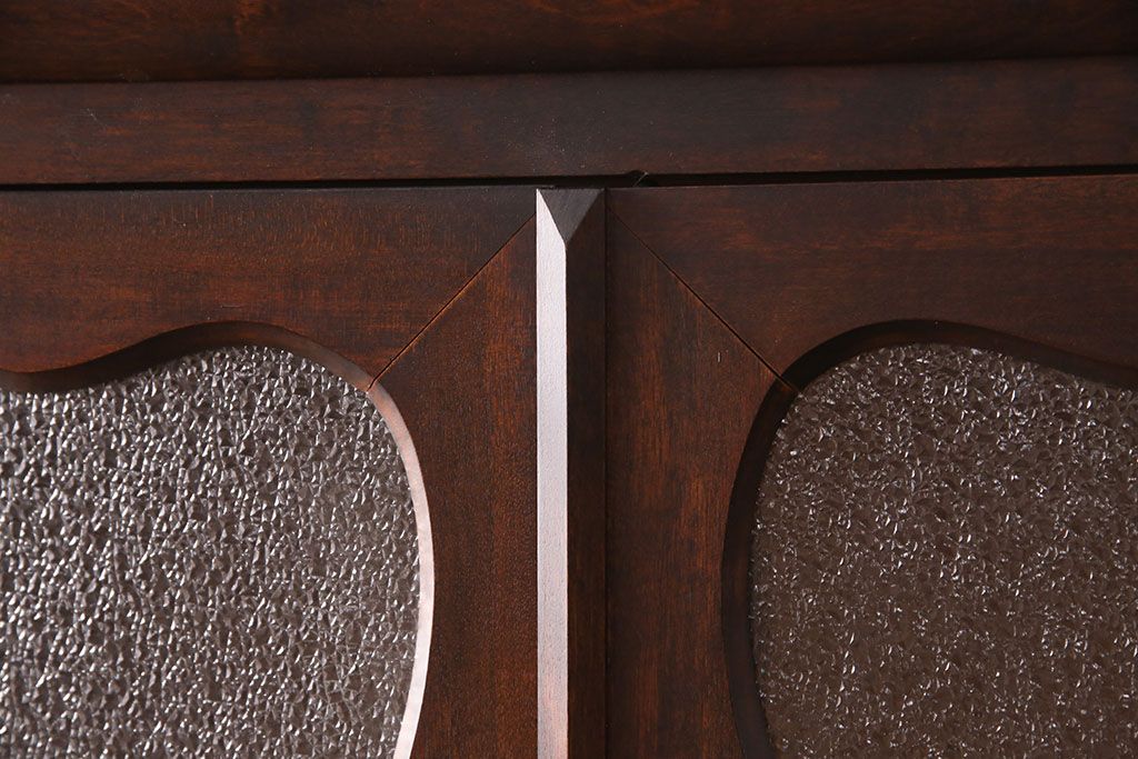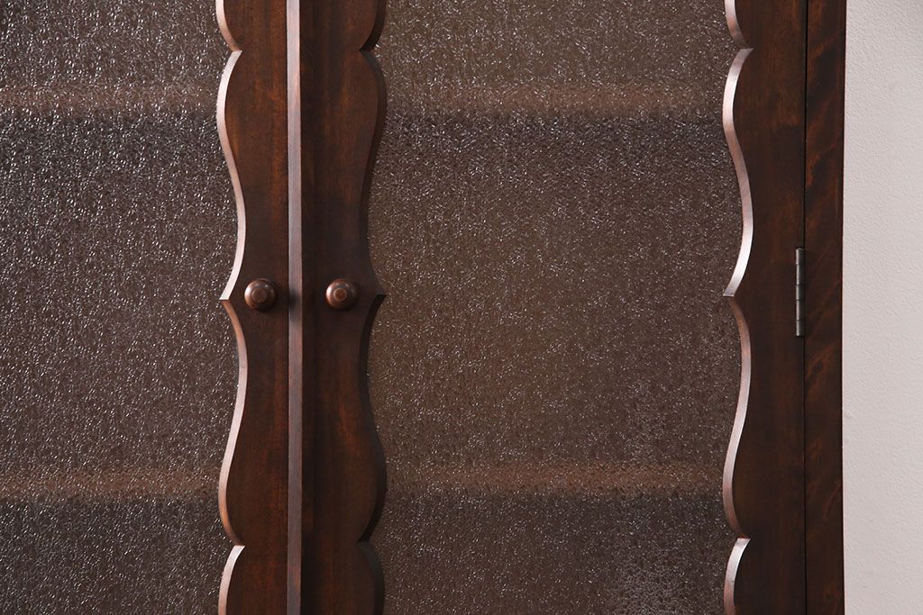 和製ヴィンテージ 国産職人手作り 手造り民芸家具 ガラス扉のデザインがおしゃれなキャビネット(松本民芸家具風、ブックケース、収納棚、本箱、戸棚、食器棚、カップボード、ビンテージ)(R-051362)です。