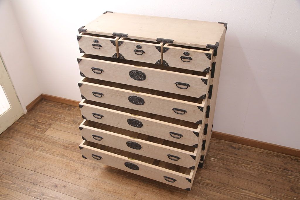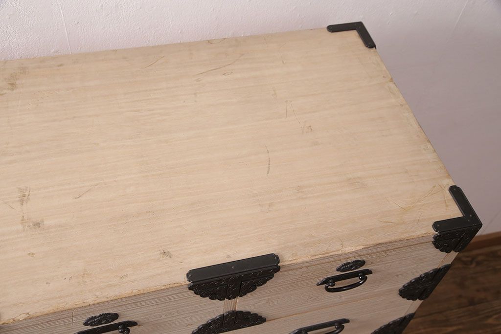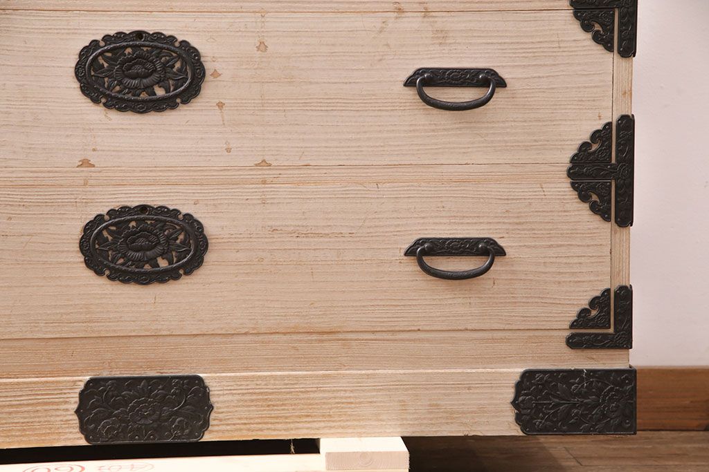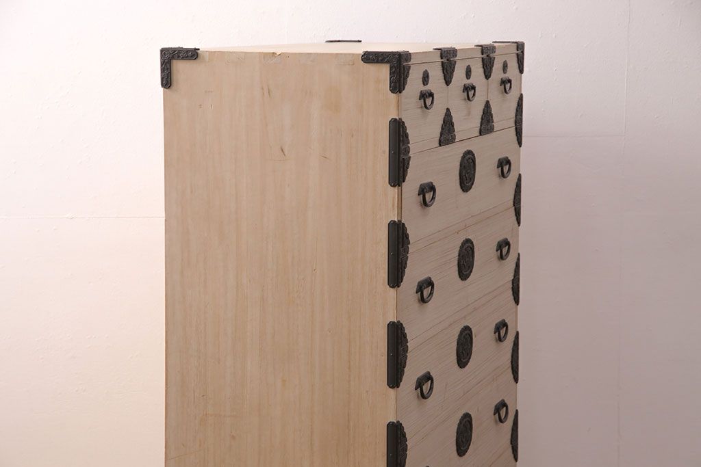 和箪笥 > 中古 国産 手造り 明るい木肌に黒い金具が映える総桐箪笥(衣装箪笥、和タンス、引き出し、チェスト、桐たんす)(R-051360)