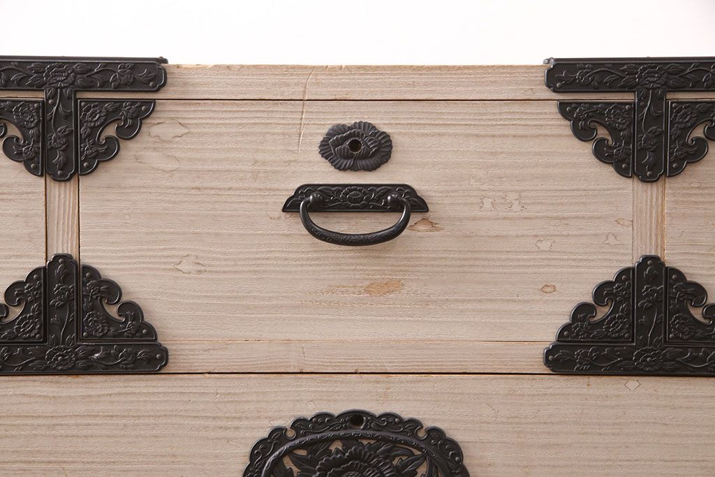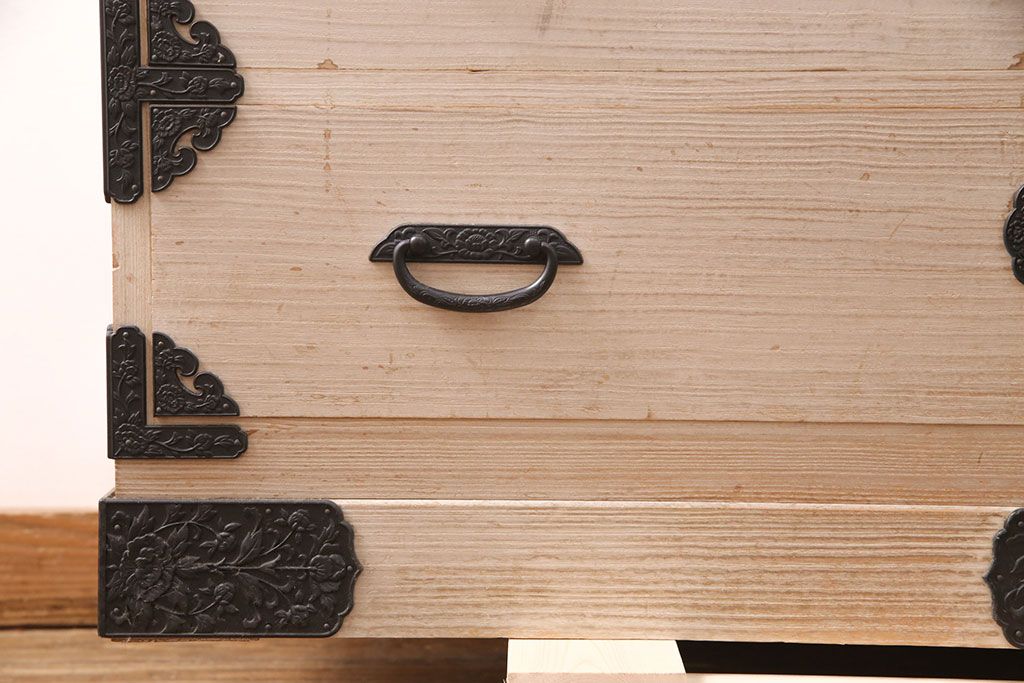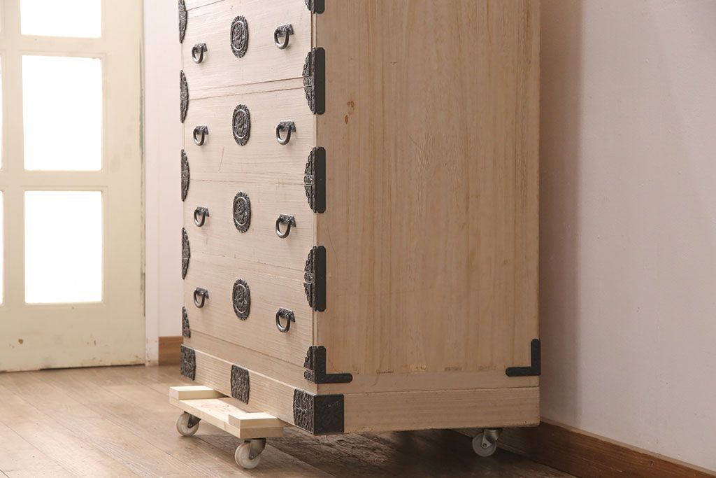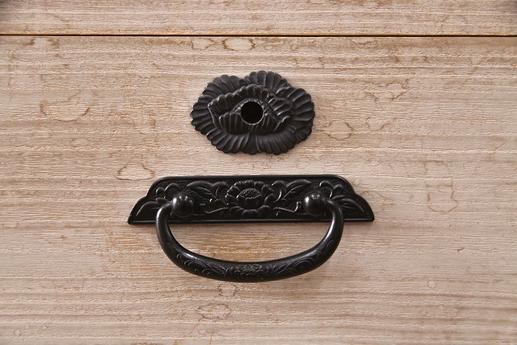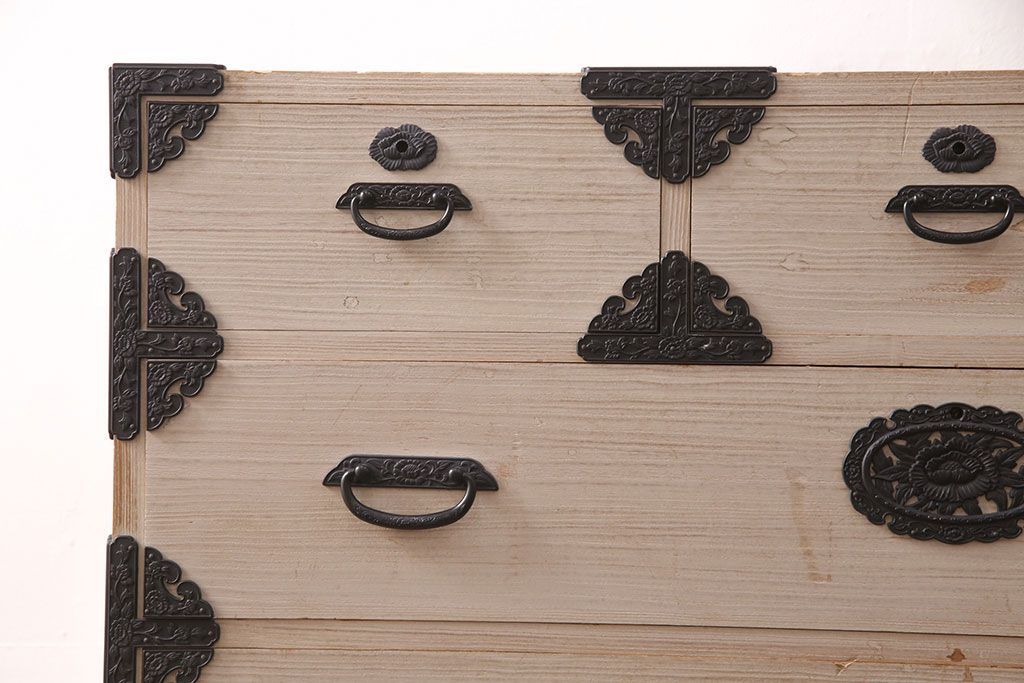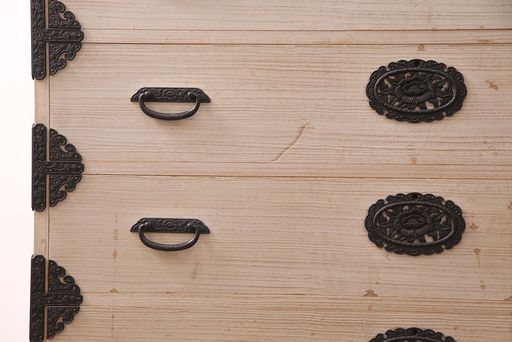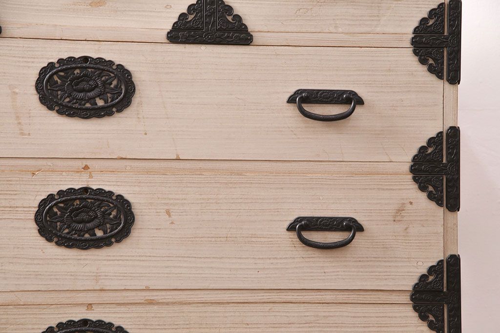 和箪笥> 衣装箪笥 > 中古 国産 手造り 明るい木肌に黒い金具が映える総桐箪笥(衣装箪笥、和タンス、引き出し、チェスト、桐たんす)(R-051360)