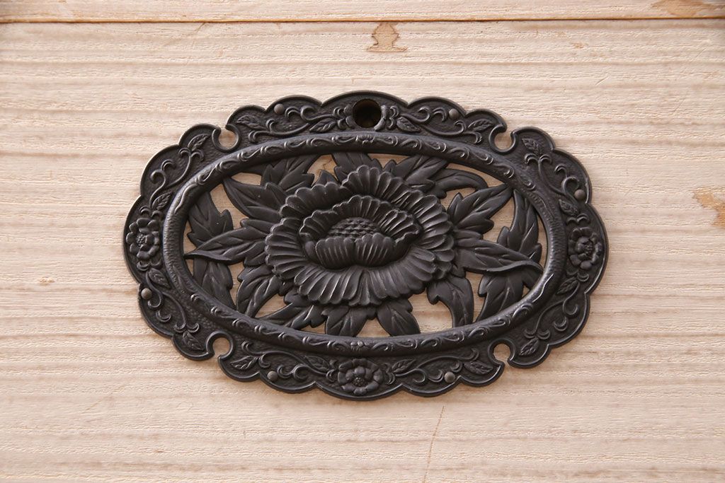 明るい木色に飾り金具の黒が映える