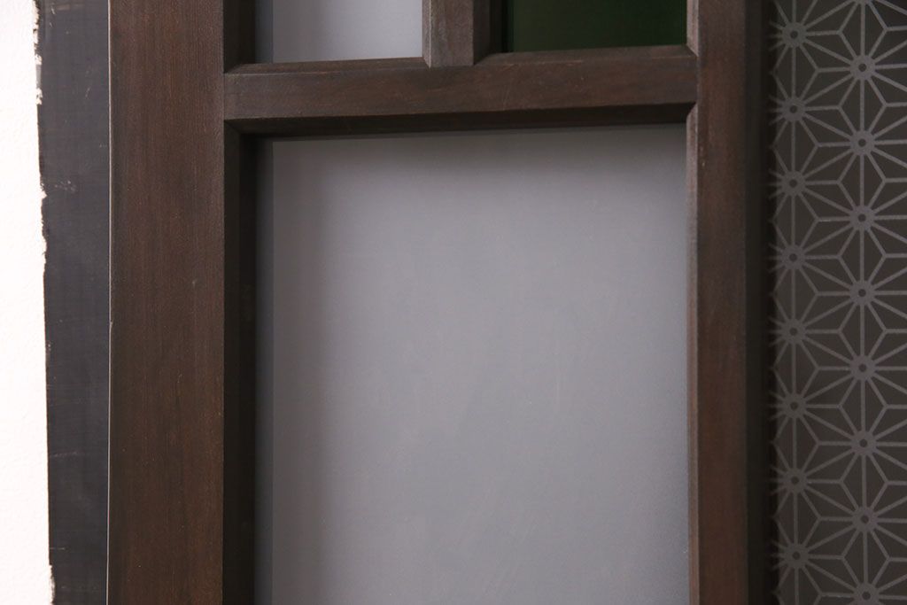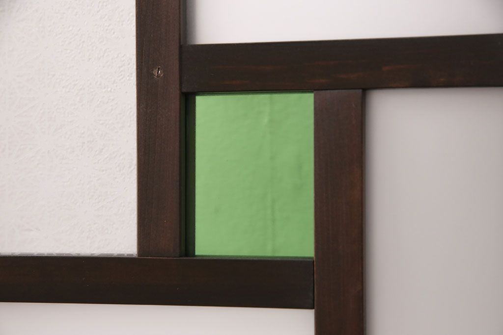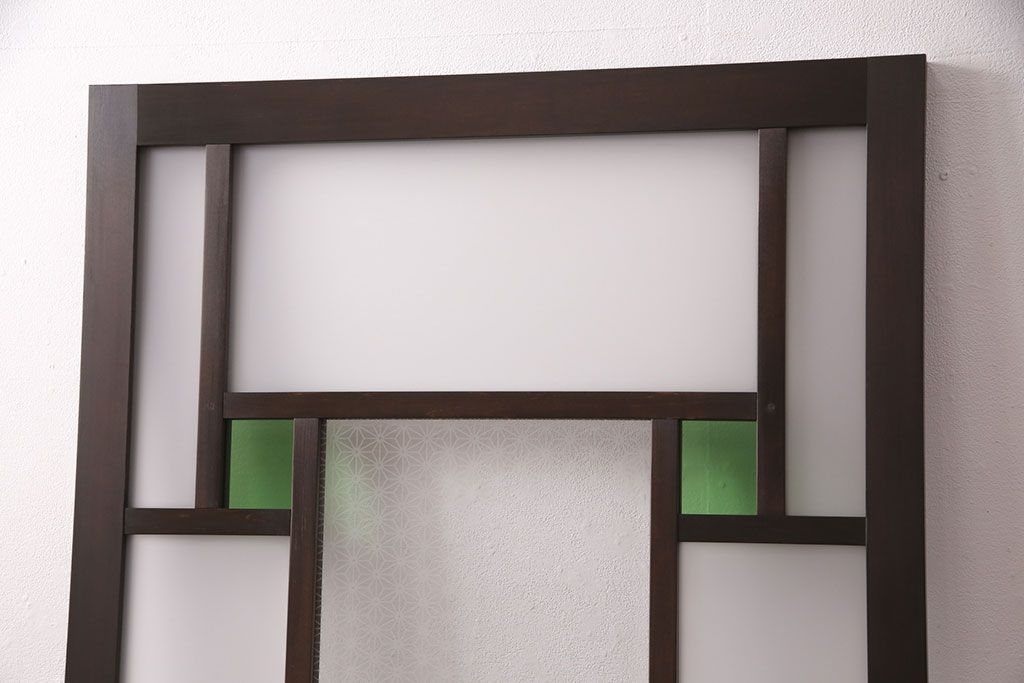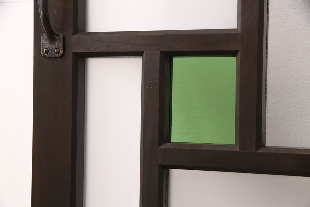 ドア・建具> ガラス戸 > 大正ロマンなドアを新規製作!当店商品を参考に色ガラス・麻の葉模様ガラス・スリガラスの組み入れ。ローラー締り、取っ手を取り付け。濃い茶色で着色し仕上げ。(建具、扉、ガラス戸)