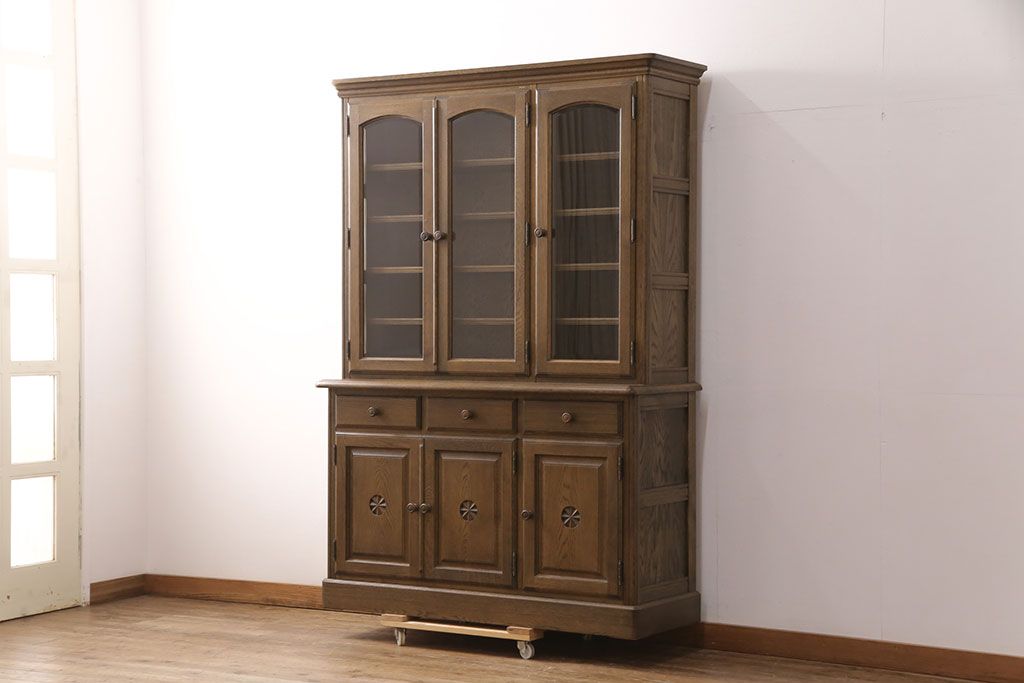 中古 美品 北海道旭川家具 和光 オークハウスシリーズ 絶版品!扉の装飾が目を惹くオーク材製のキャビネット(食器棚、収納棚、陳列棚、カップボード)(R-051446)です。