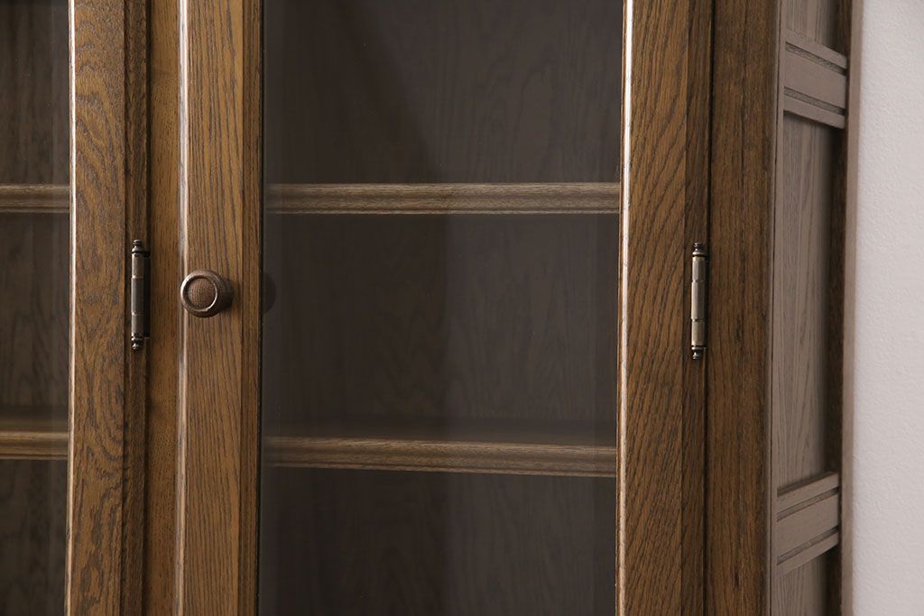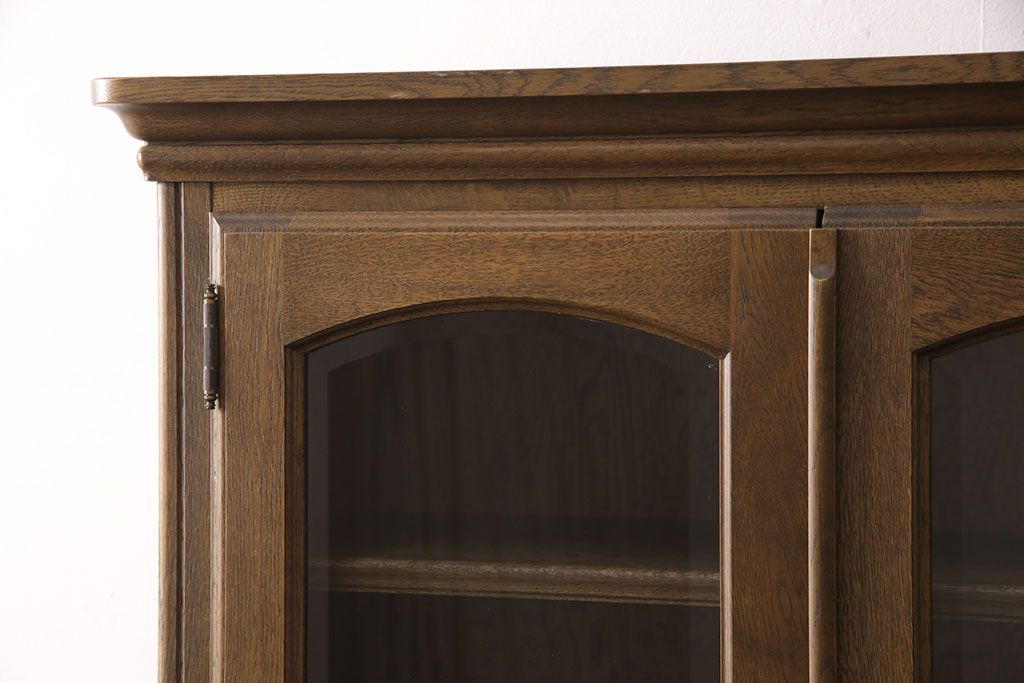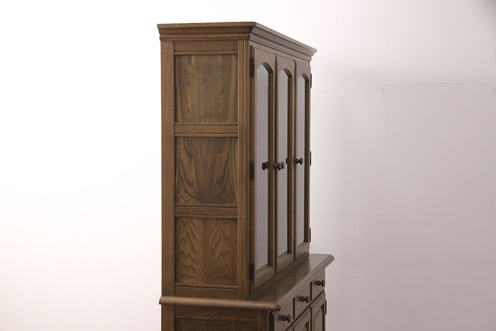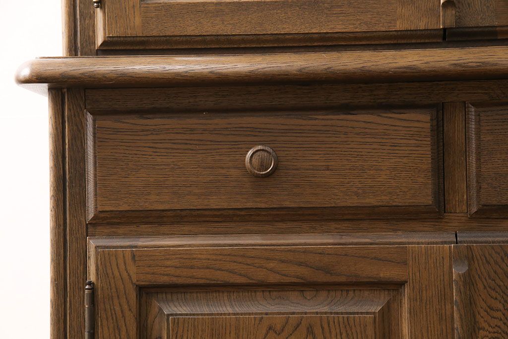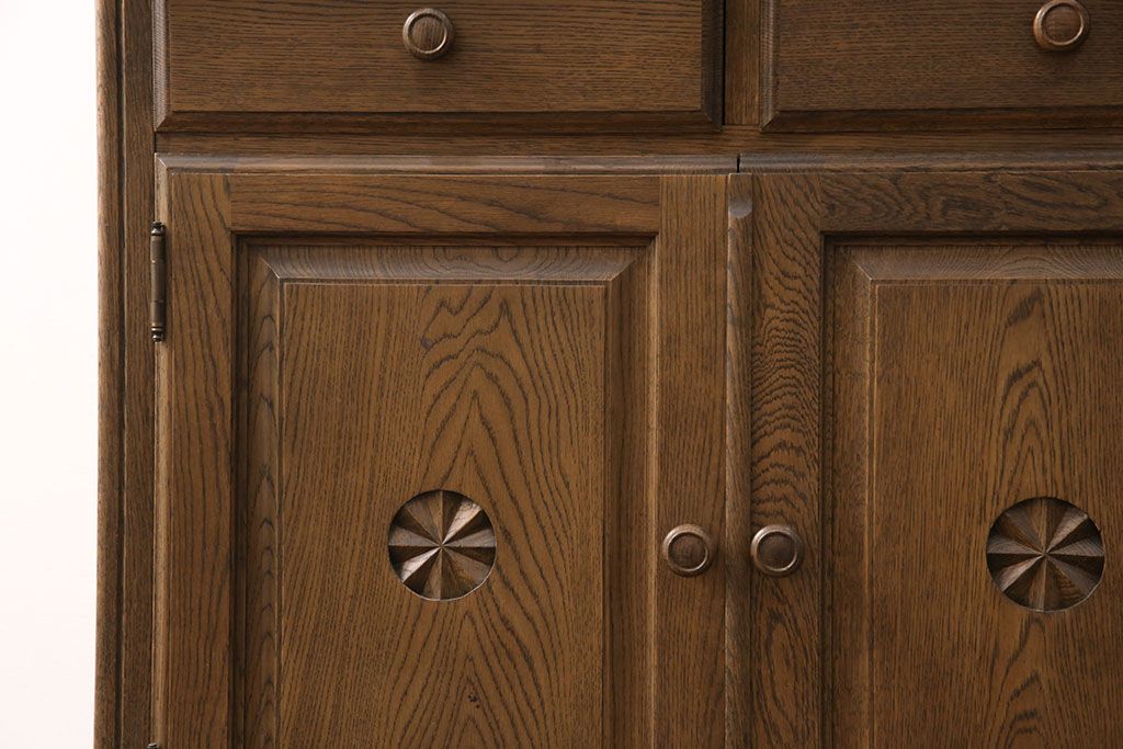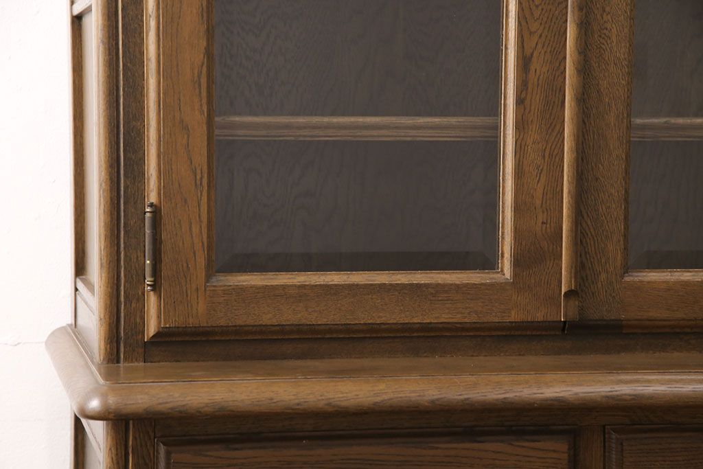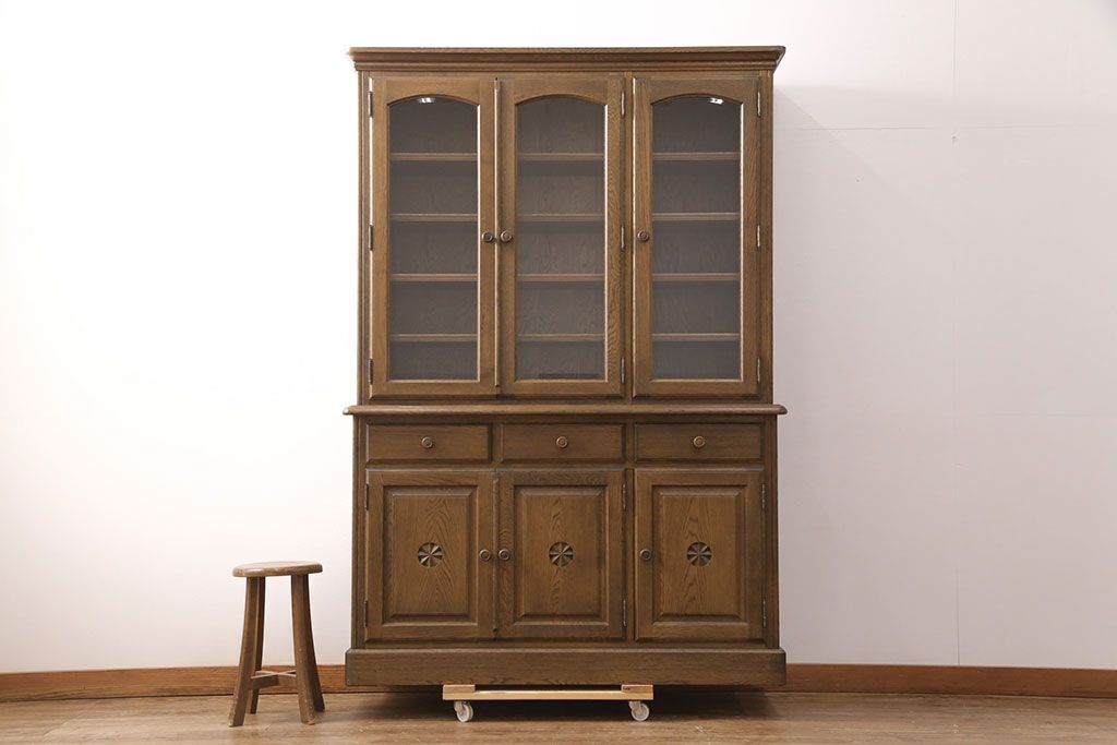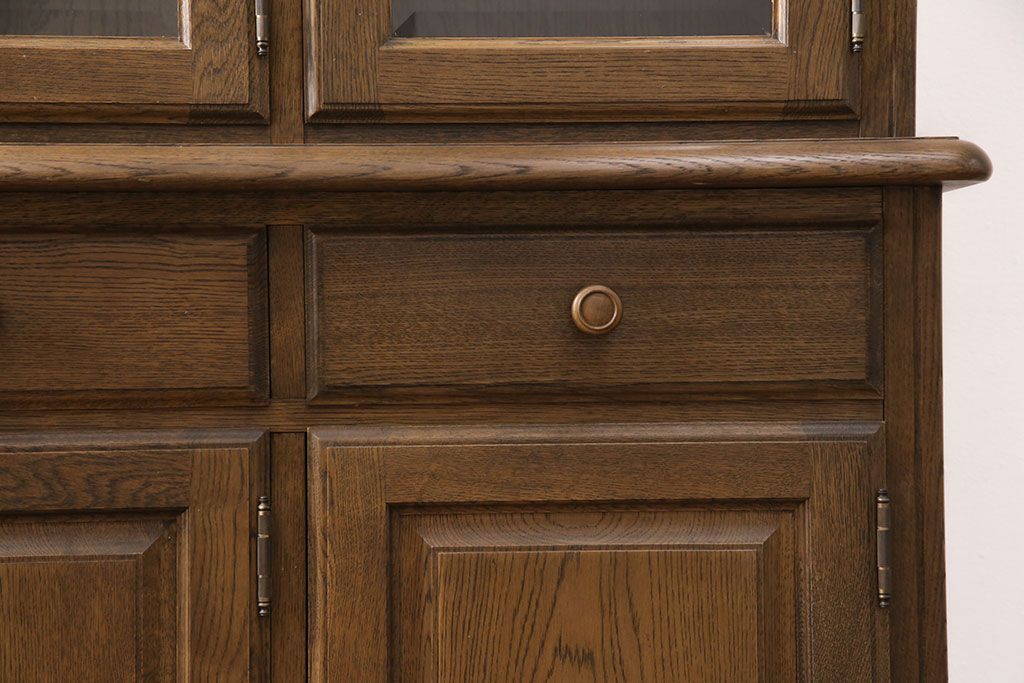 中古 美品 北海道旭川家具 和光 オークハウスシリーズ 絶版品!扉の装飾が目を惹くオーク材製のキャビネット(食器棚、収納棚、陳列棚、カップボード)(R-051446)