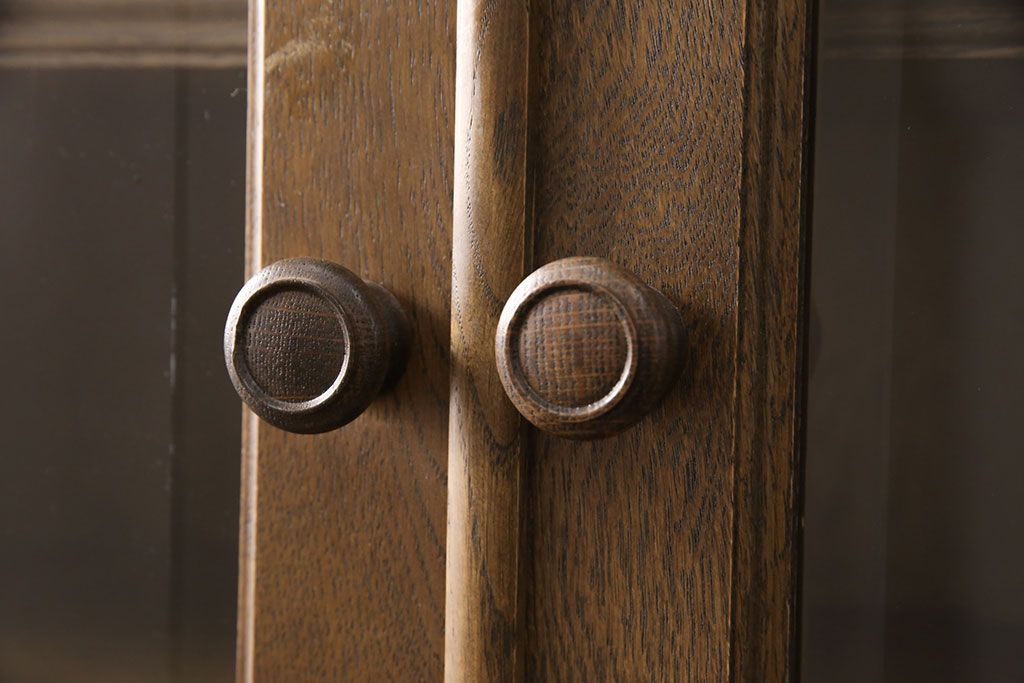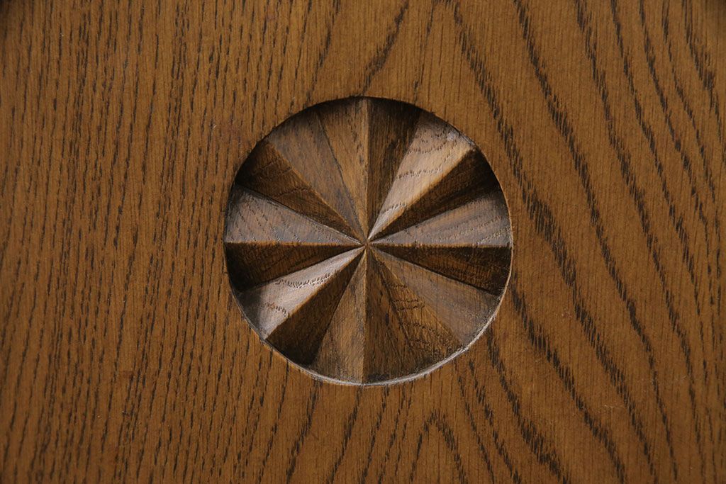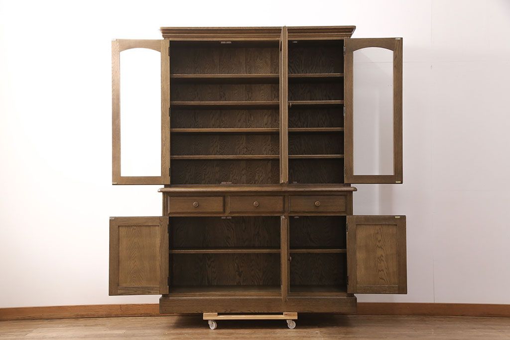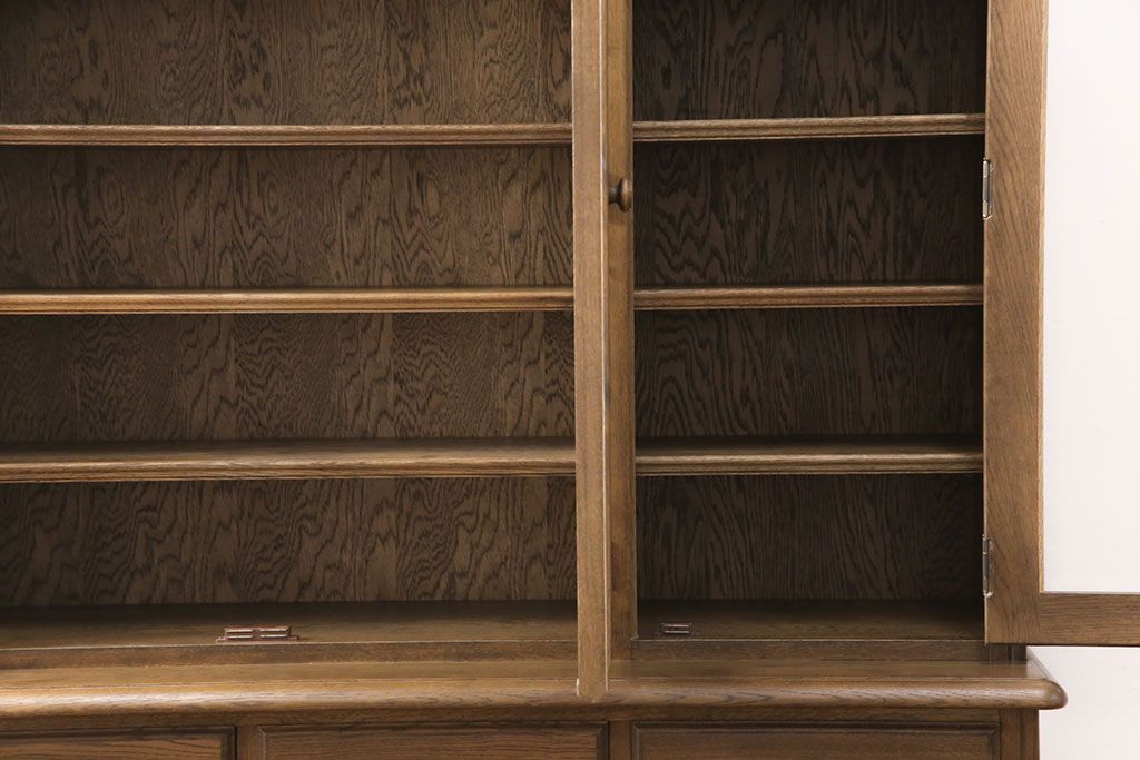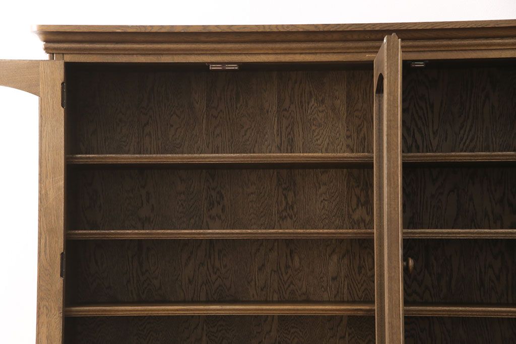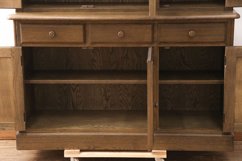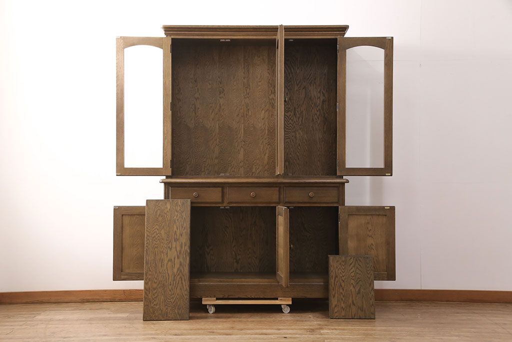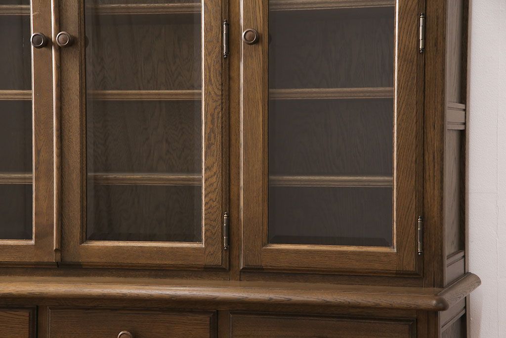 中古 美品 北海道旭川家具 和光 オークハウスシリーズ 絶版品!扉の装飾が目を惹くオーク材製のキャビネット(食器棚、収納棚、陳列棚、カップボード)(R-051446)