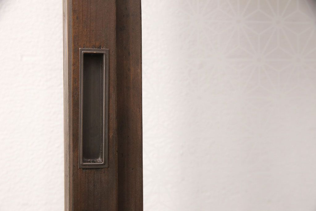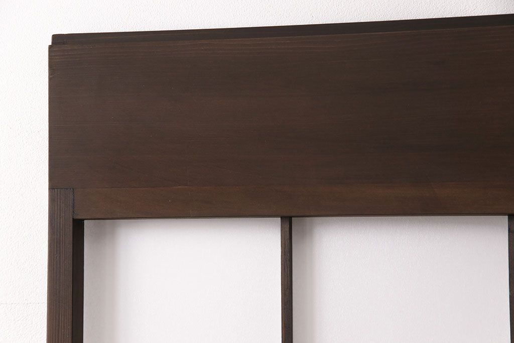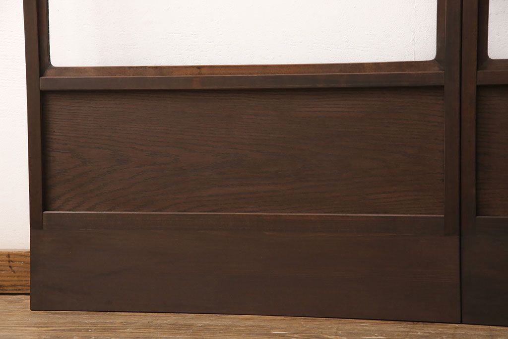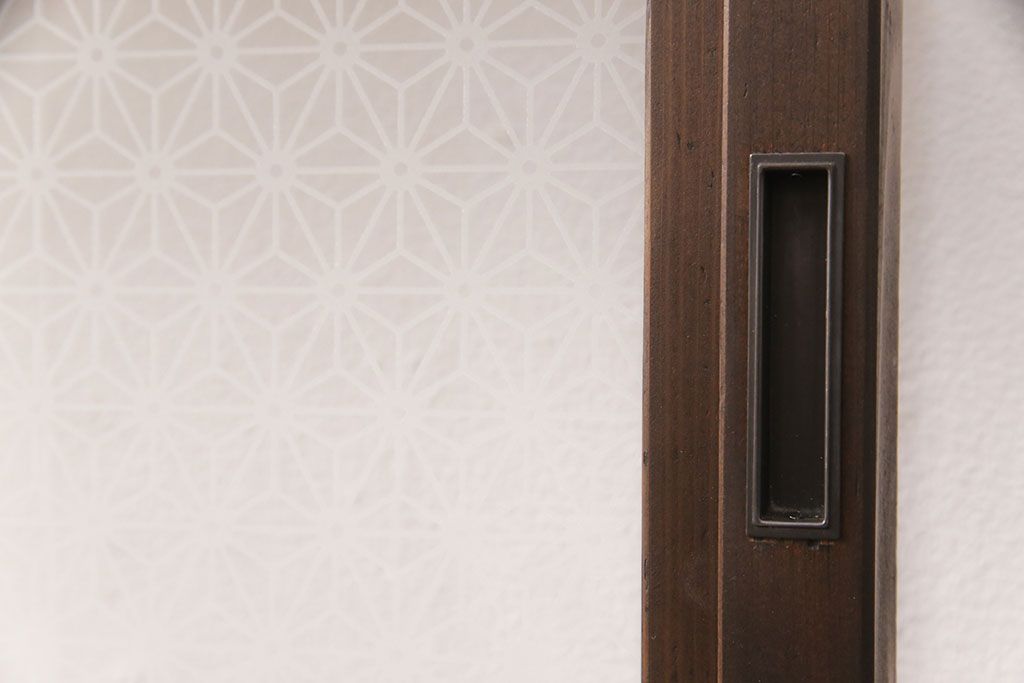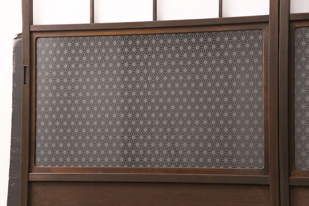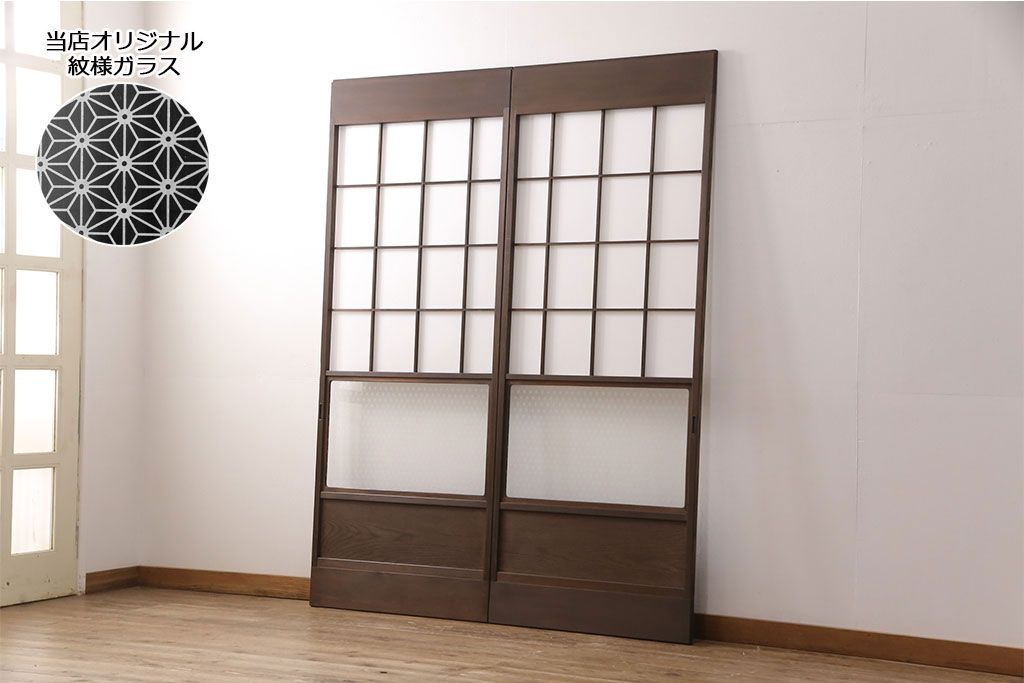 升格子の障子戸2枚をリペア&カスタム!高さ・幅をリサイズ。ガラスを麻の葉模様ガラスに入れ替え。濃い茶色で着色し仕上げ。(引き戸、建具)