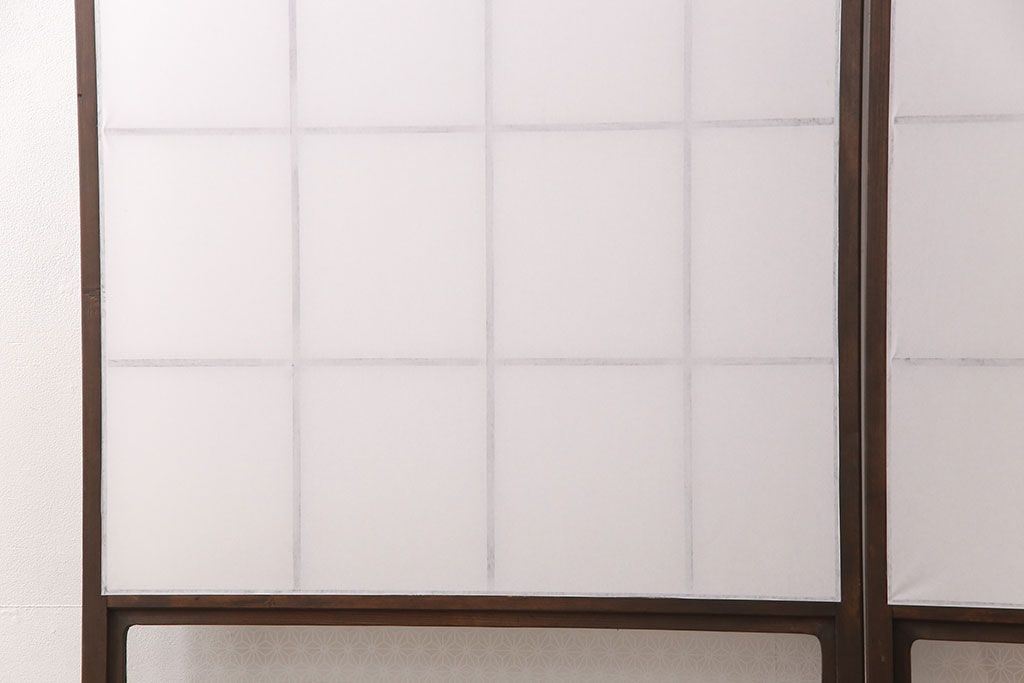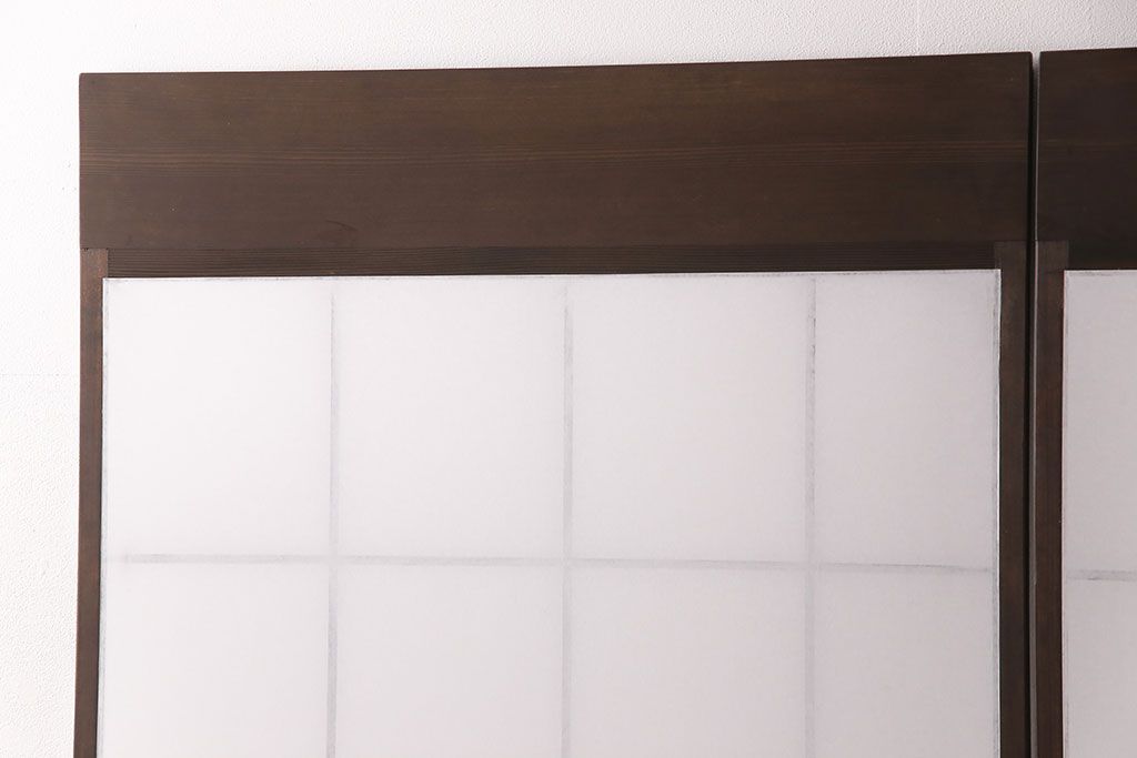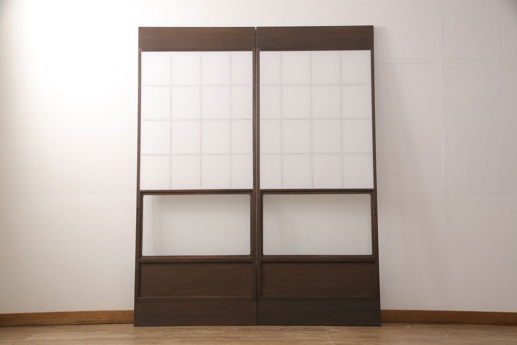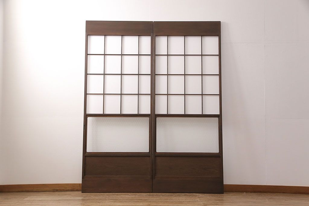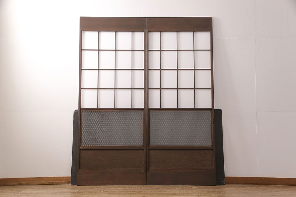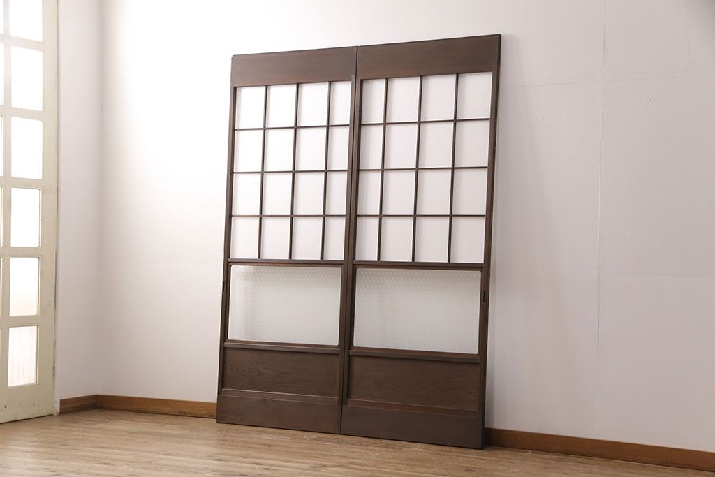 ドア・建具> 障子戸 > 升格子の障子戸2枚をリペア&カスタム!高さ・幅をリサイズ。ガラスを麻の葉模様ガラスに入れ替え。濃い茶色で着色し仕上げ。(引き戸、建具)