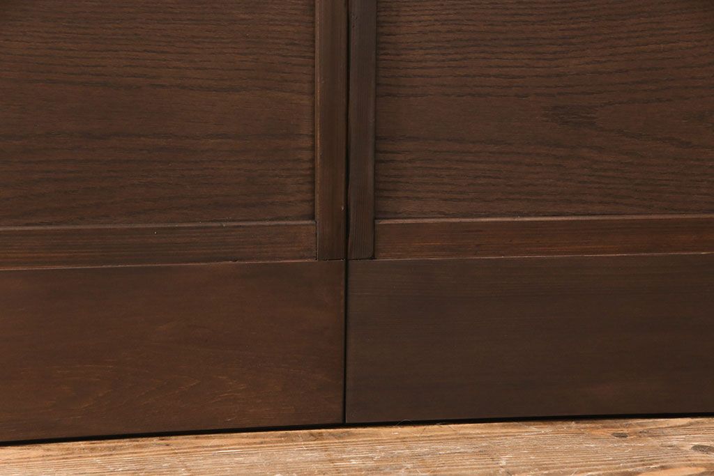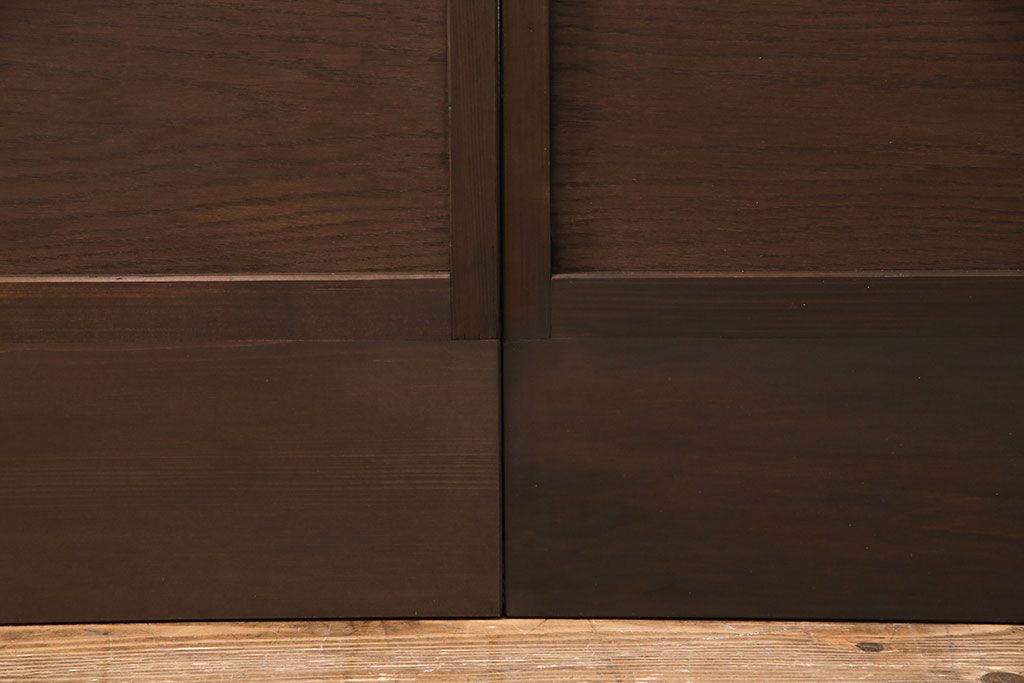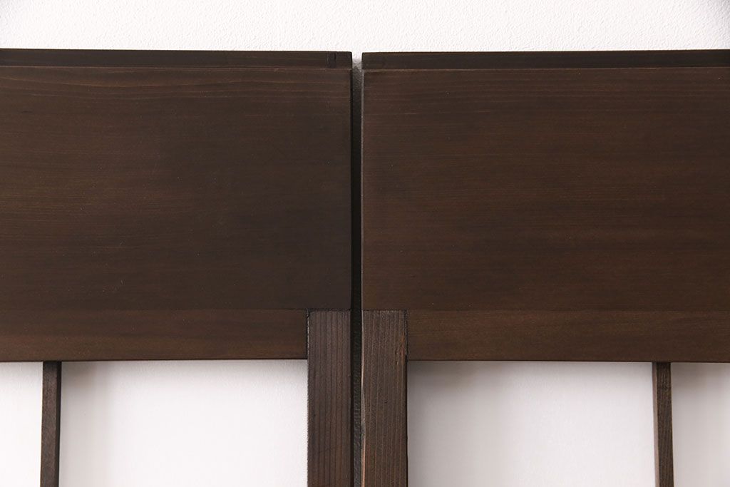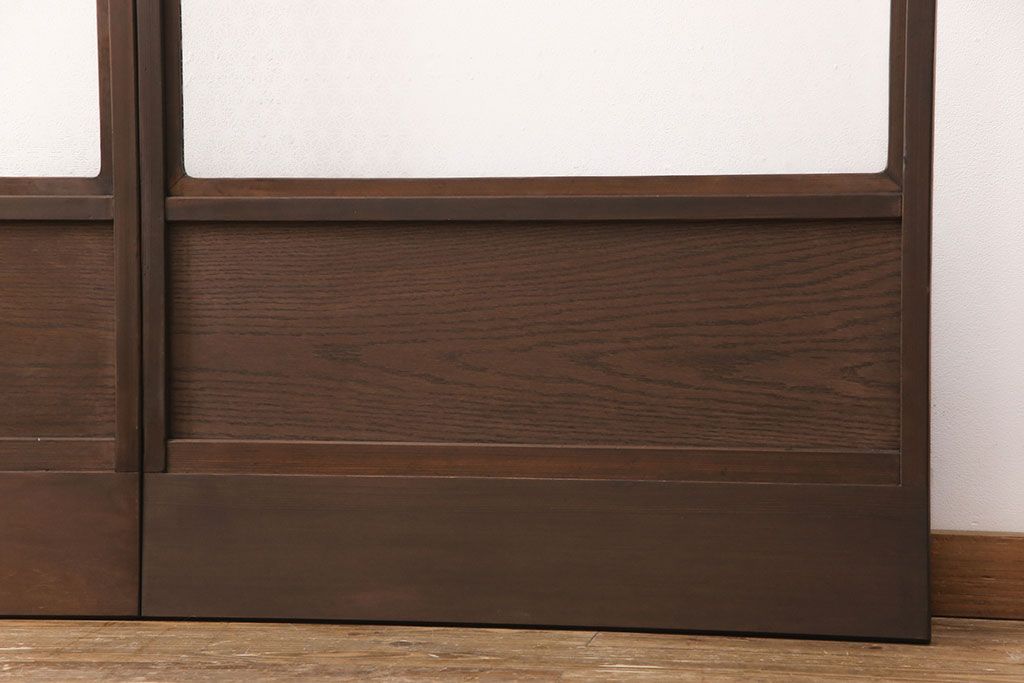 ドア・建具> 引き戸 > 升格子の障子戸2枚をリペア&カスタム!高さ・幅をリサイズ。ガラスを麻の葉模様ガラスに入れ替え。濃い茶色で着色し仕上げ。(引き戸、建具)