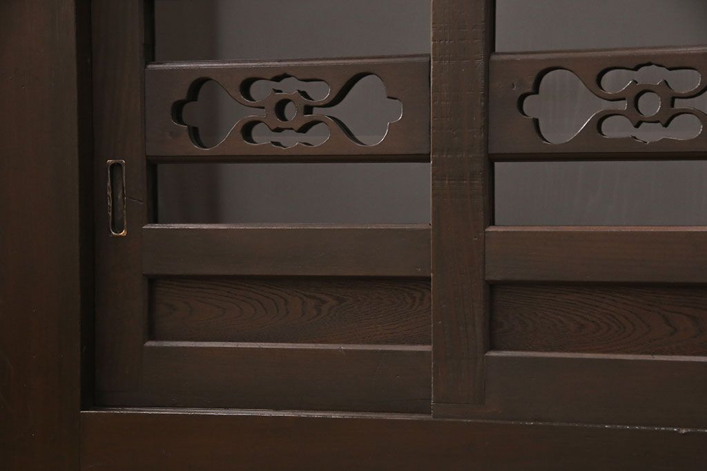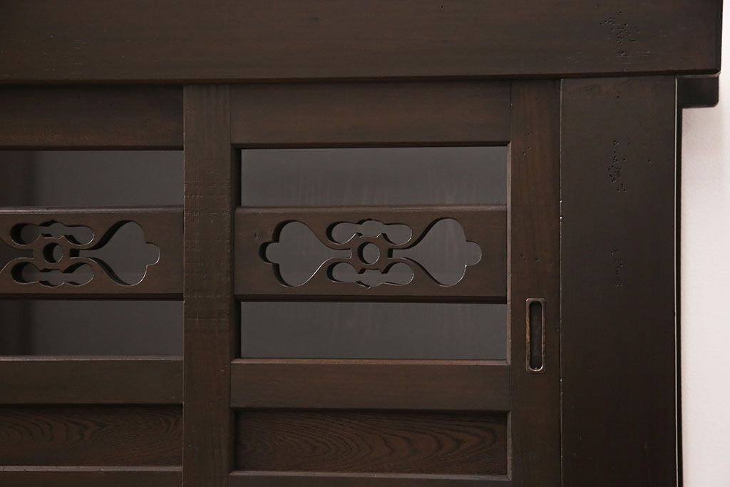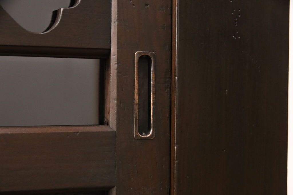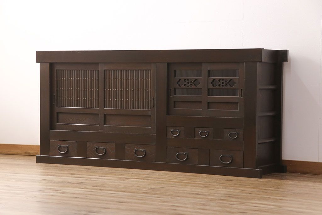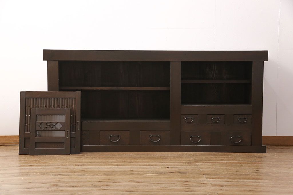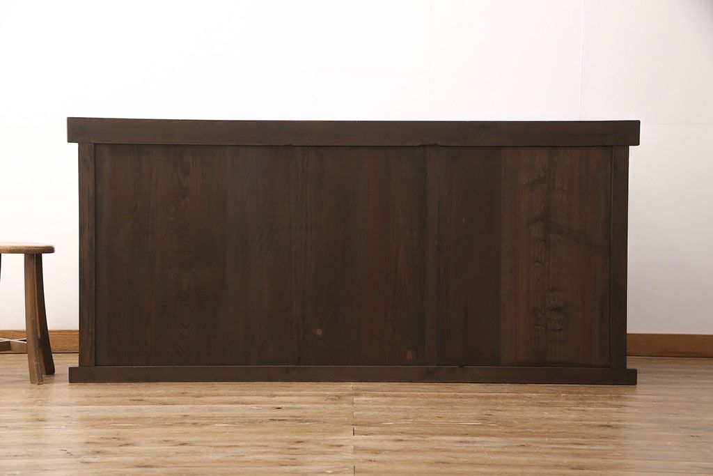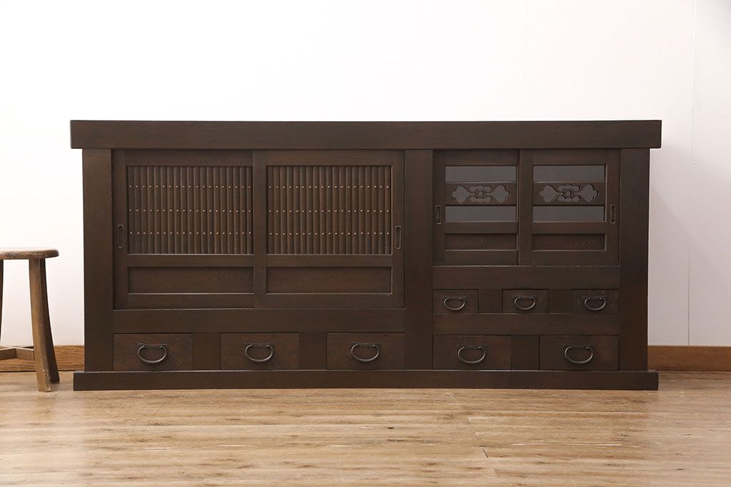 明治大正期の水屋箪笥サイドボードをリペア&カスタム!建具の金網をクリアガラスに入れ替え。棚板はヒノキ材の一枚板に変更。天板の補強を行い、現状に近しい色味に着色し仕上げ。(収納棚、戸棚、サイドキャビネット、食器棚)