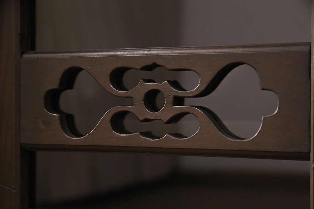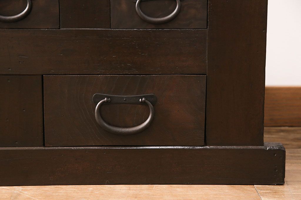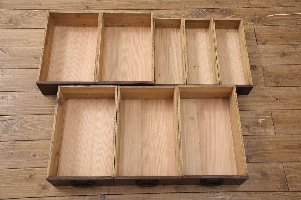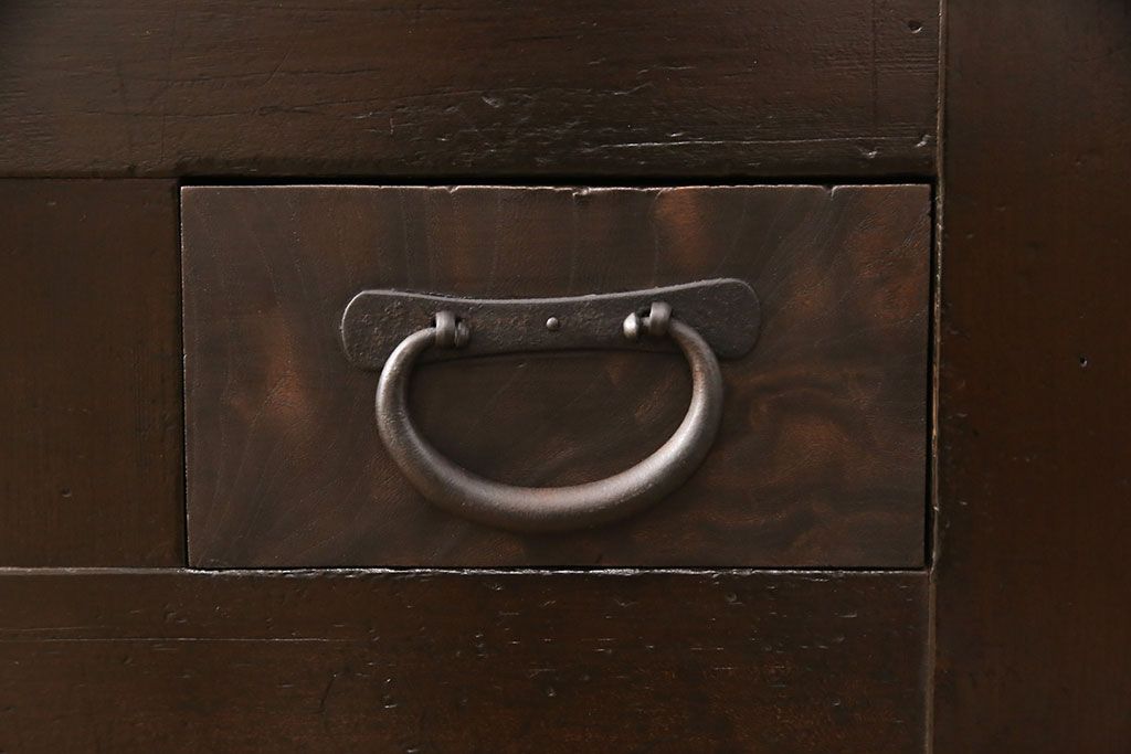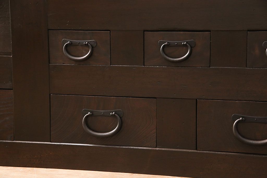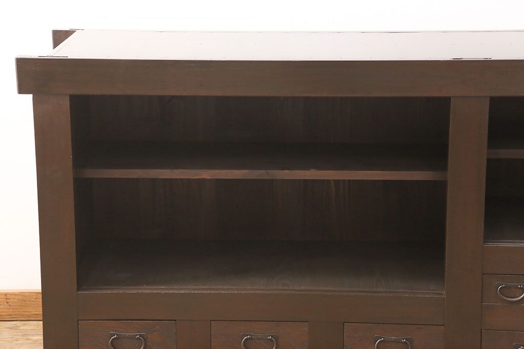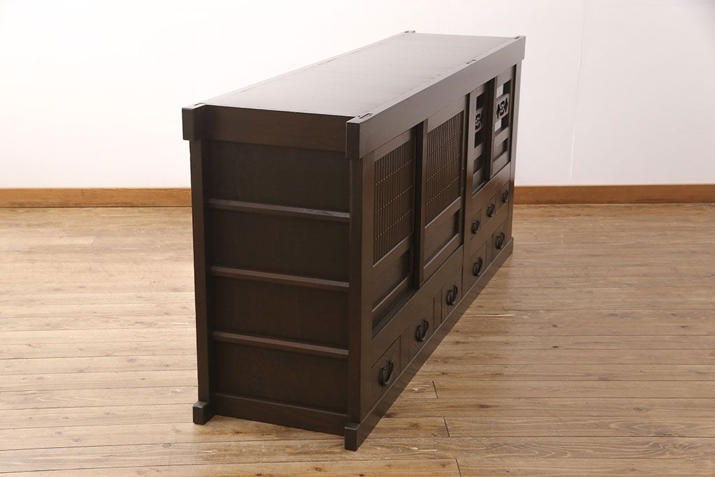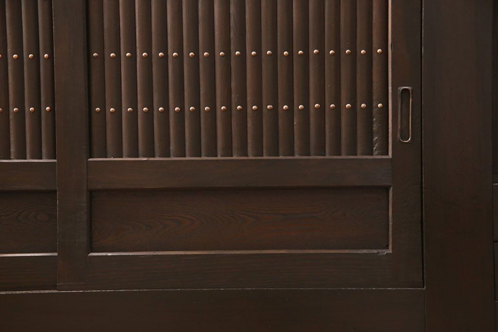 明治大正期の水屋箪笥サイドボードをリペア&カスタム!建具の金網をクリアガラスに入れ替え。棚板はヒノキ材の一枚板に変更。天板の補強を行い、現状に近しい色味に着色し仕上げ。(収納棚、戸棚、サイドキャビネット、食器棚)