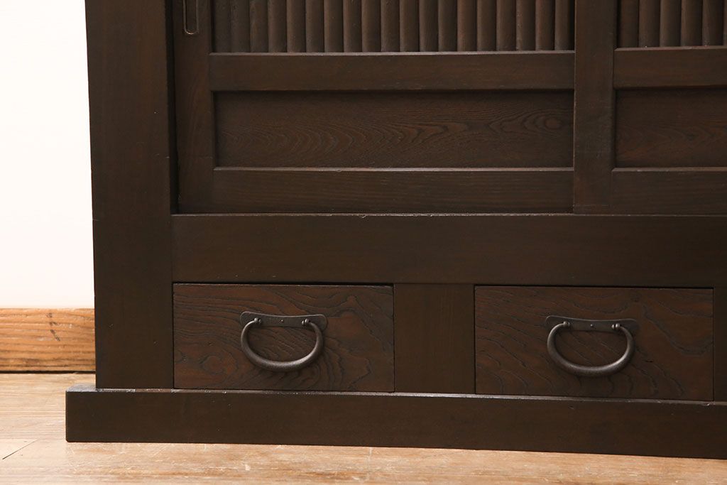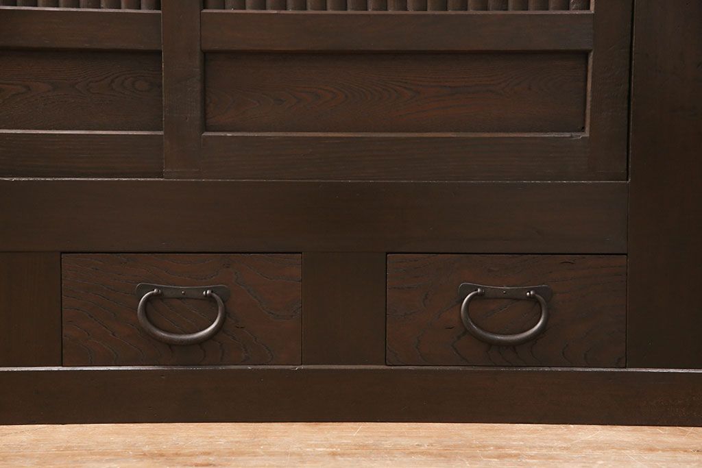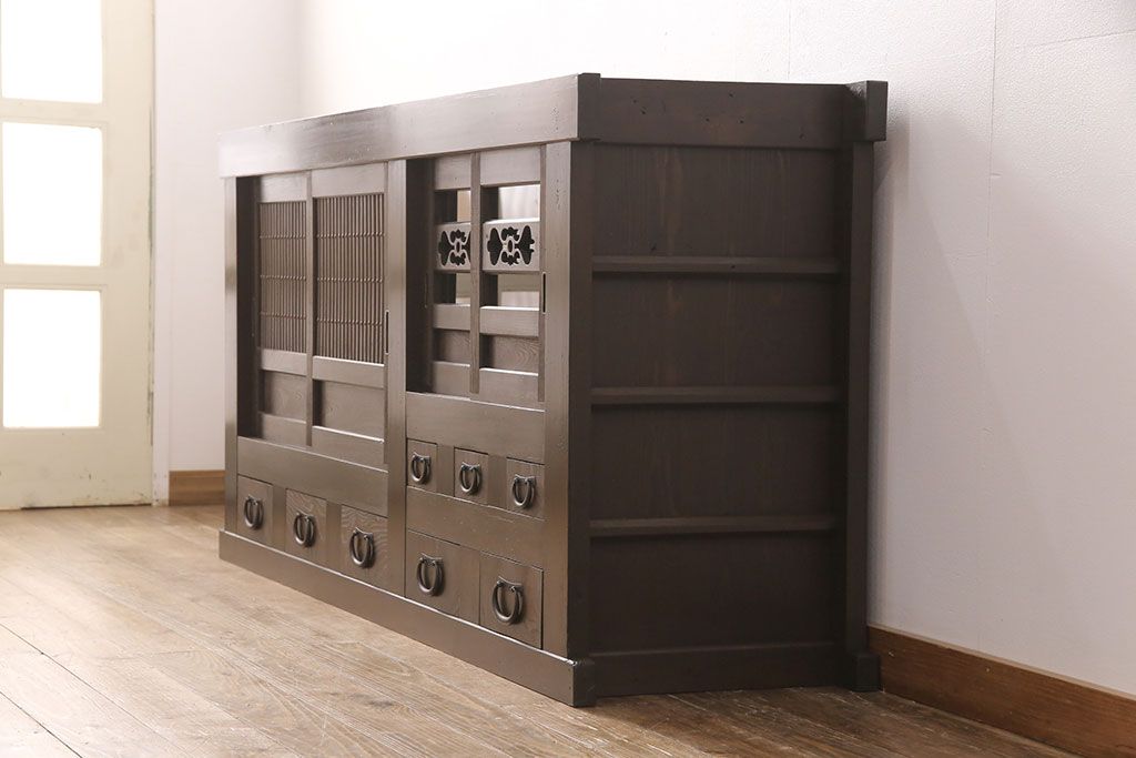 ラフジュ工房> 和箪笥> 水屋箪笥 > 明治大正期の水屋箪笥サイドボードをリペア&カスタム!建具の金網をクリアガラスに入れ替え。棚板はヒノキ材の一枚板に変更。天板の補強を行い、現状に近しい色味に着色し仕上げ。(収納棚、戸棚、サイドキャビネット、食器棚)